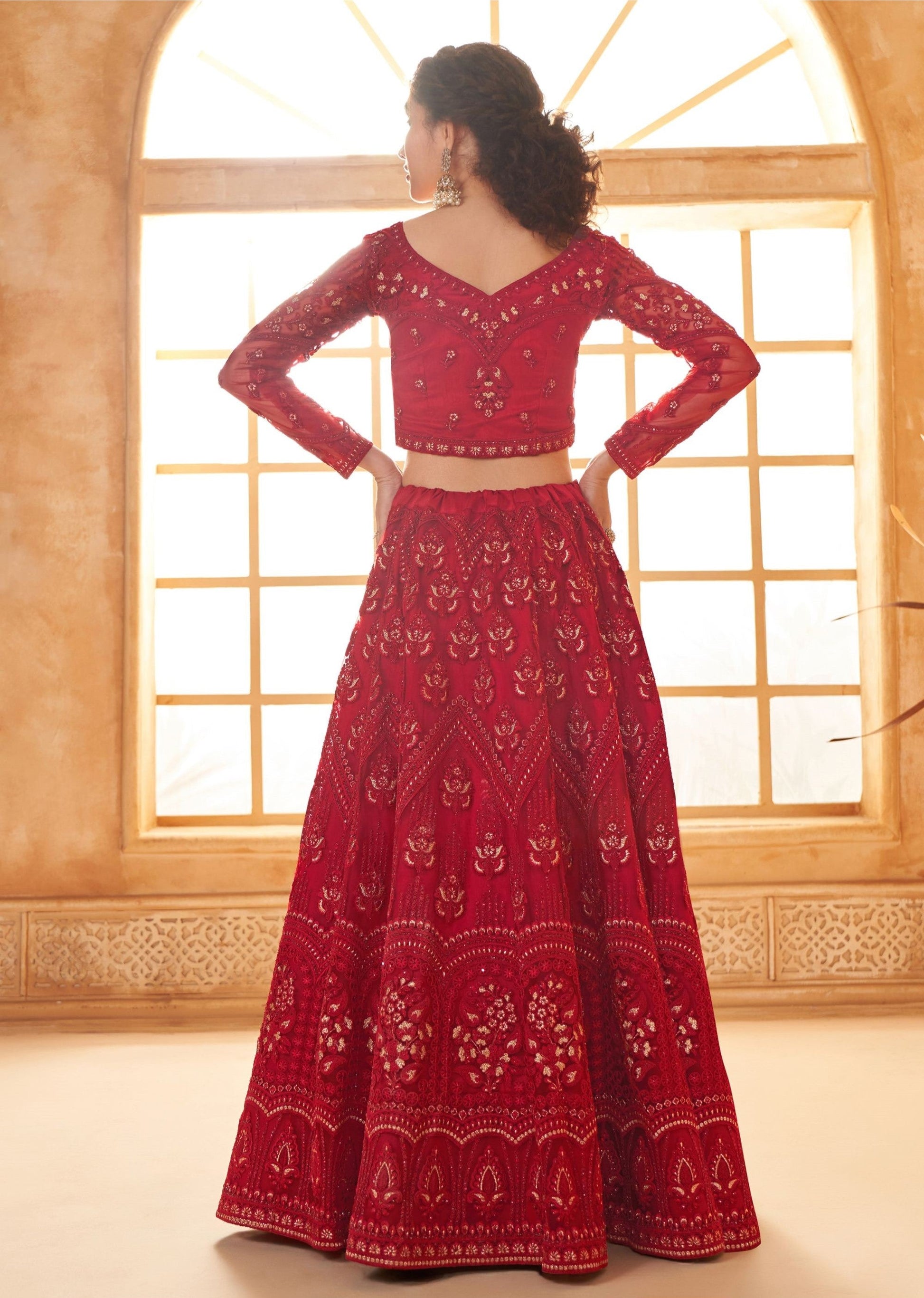 Red Soft Net Embroidered Wedding Lehenga With Diamond Work