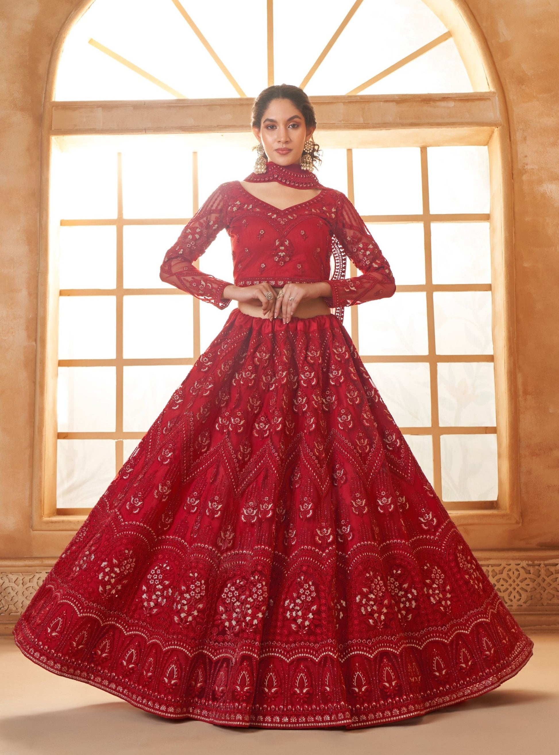Does your wardrobe need more versatility? Then, check out this . Let you feel the refreshing touch as you adorn this superior-quality Red Soft Net Embroidered Wedding Lehenga With Diamond Work to match the overall modest design. If you're yearning to make a fashion statement in your outfit, pick this stone Work for any occasion, such as wedding receptions, engagement parties, and sangeets. A Bridesmaid would look gorgeous in this Red Soft Net Embroidered Wedding Lehenga With Diamond Work. Don't wait. Just go ahead and order.