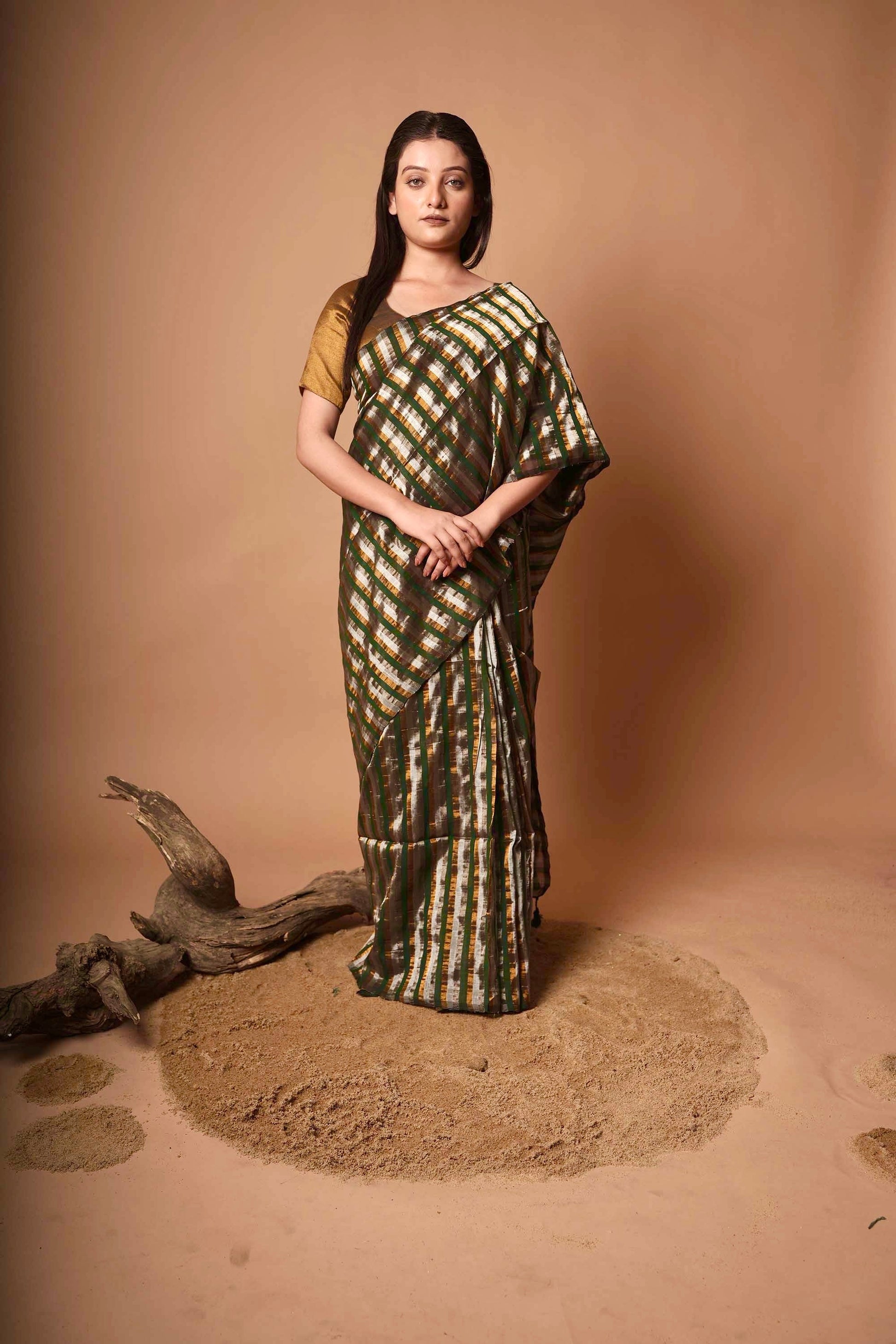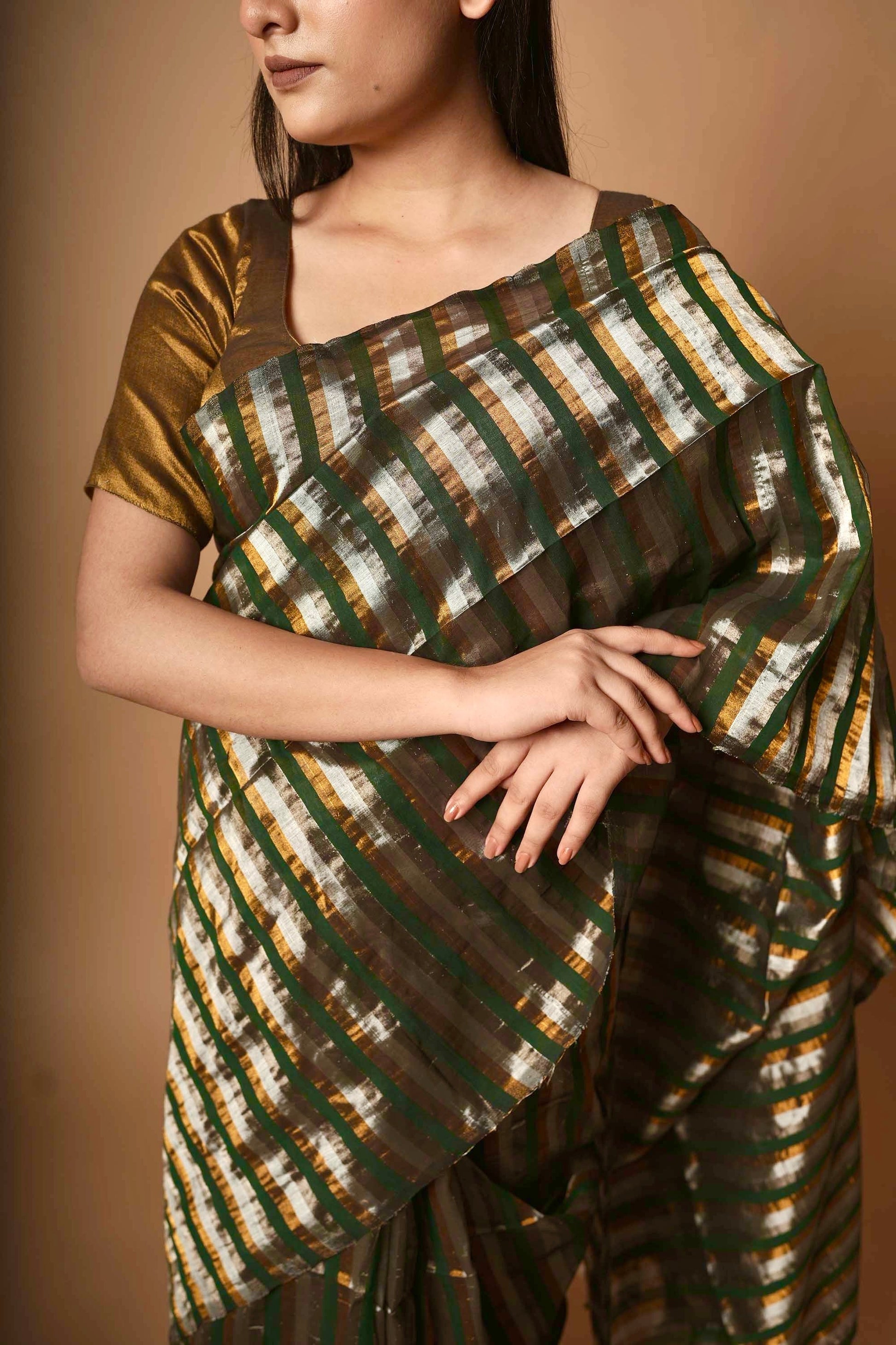 Crafted with all-over stripes of green, gold and silver in cotton fabric, the saree embodies timeless grace and modern sophistication. What sets this saree apart is its unique addition of tassels, delicately adorning the pallu.