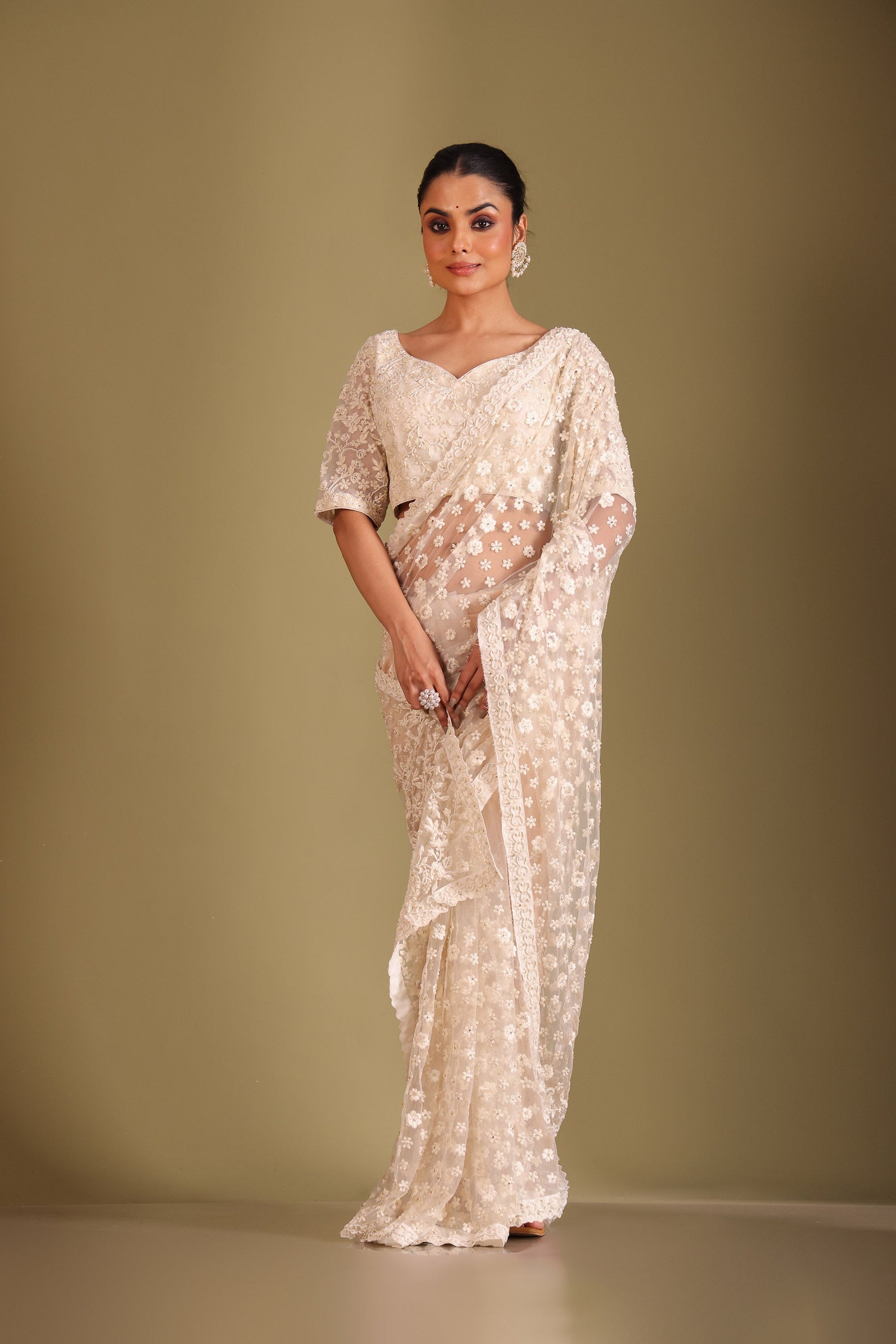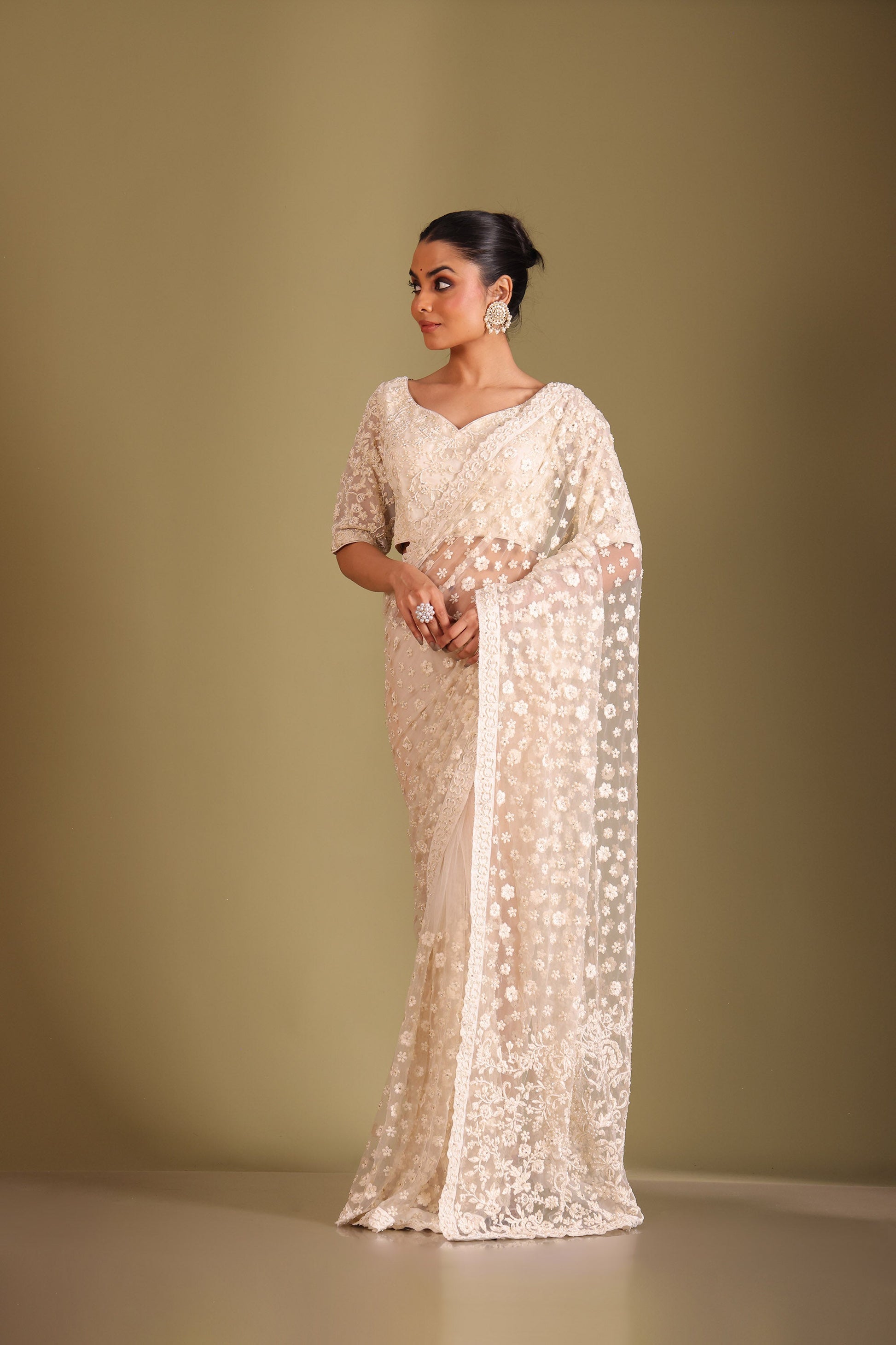 This elegant set includes a saree and a matching blouse. Embroidery: All-over hand-done thread embroidery, embellished with pearl and zarkan work Design: Floral embroidery on the pallu, complemented by intricate floral motifs scattered across the saree