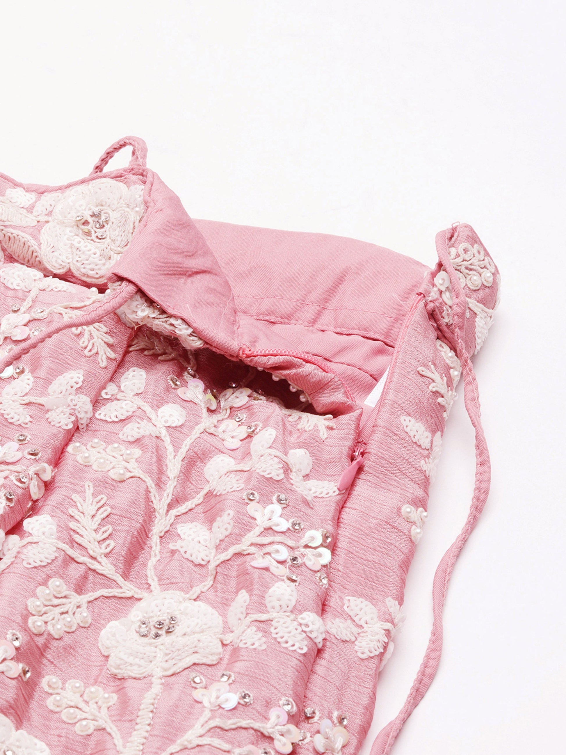 • Lehenga:- Made of premium quality Rose Gold Colour Chinon fabric Full Flaire Lehenga With heavy Zarkan, Moti, Sequins work and Coding thread Embroidery work. Has a thread cut work border on the hemline.