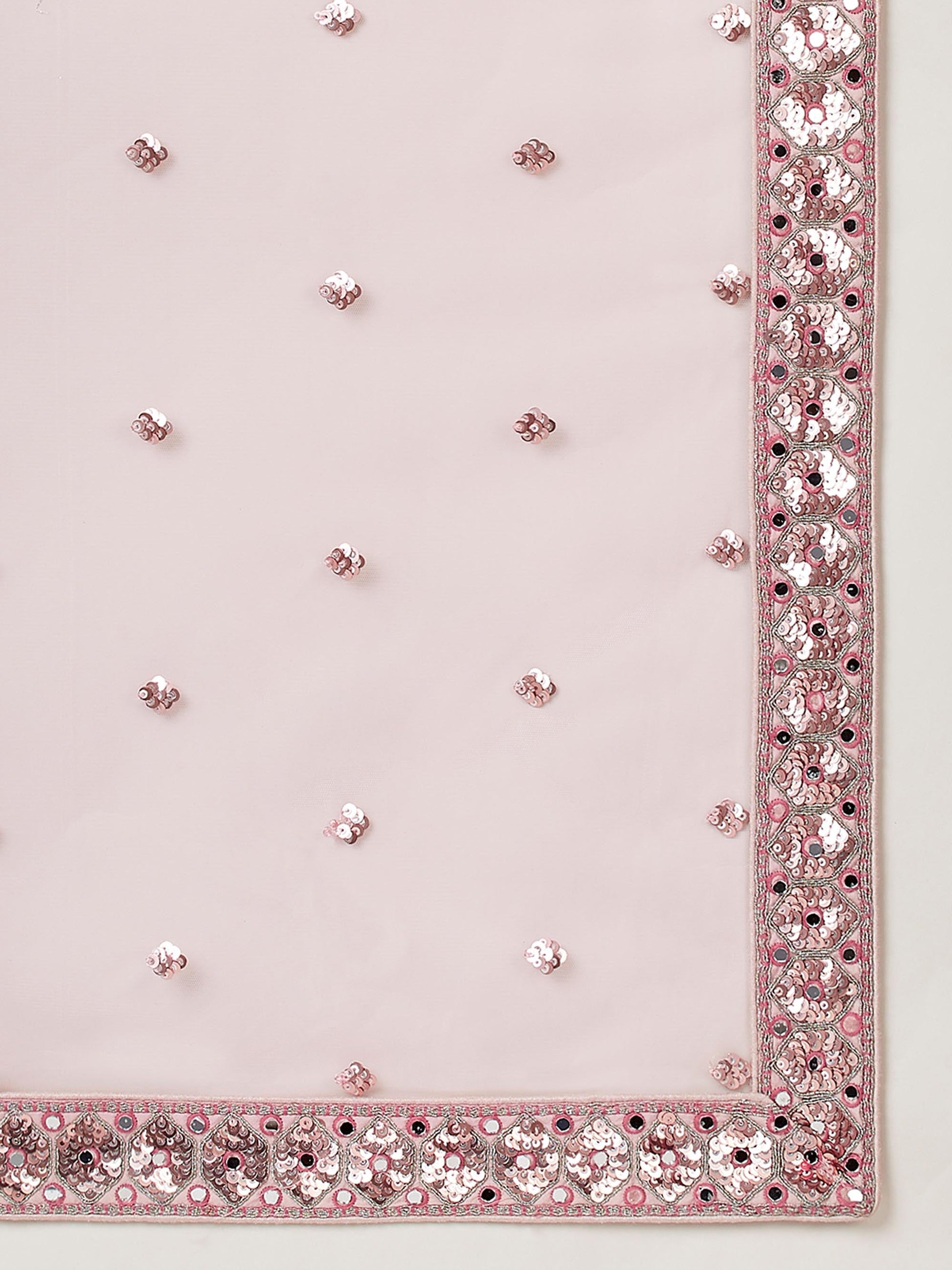 • Dupatta:- Rose Gold Net Dupatta has a multi colour sequinse work Ethnic motif with Embroidery lace Border.