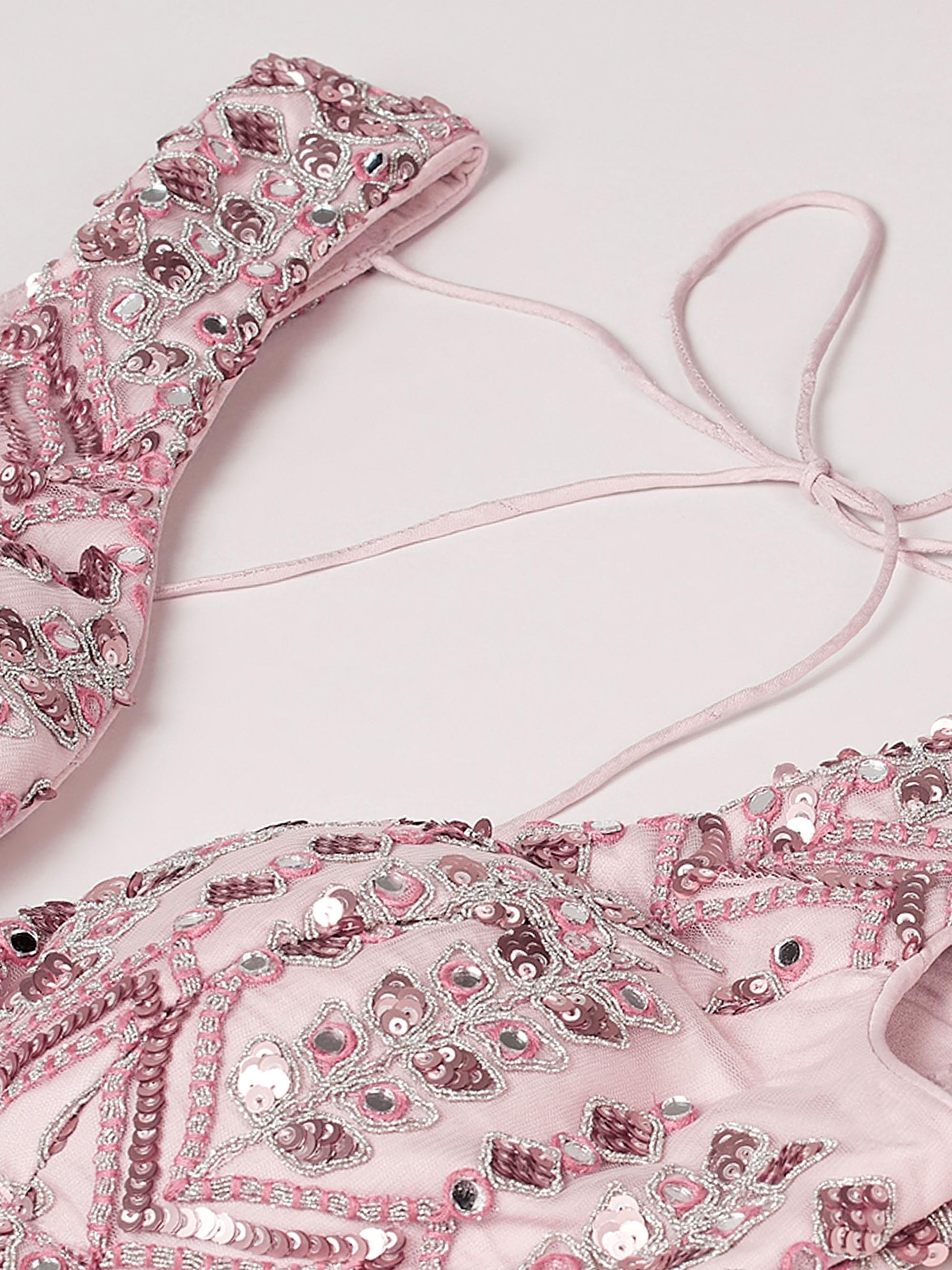 • Lehenga:- Made of premium quality Rose Gold Colour Net Full Flaire Semi-Stitched Lehenga With Mirror, Sequins and Coding thread Work Embroidery. Has a Sequinse work border on the hemline.