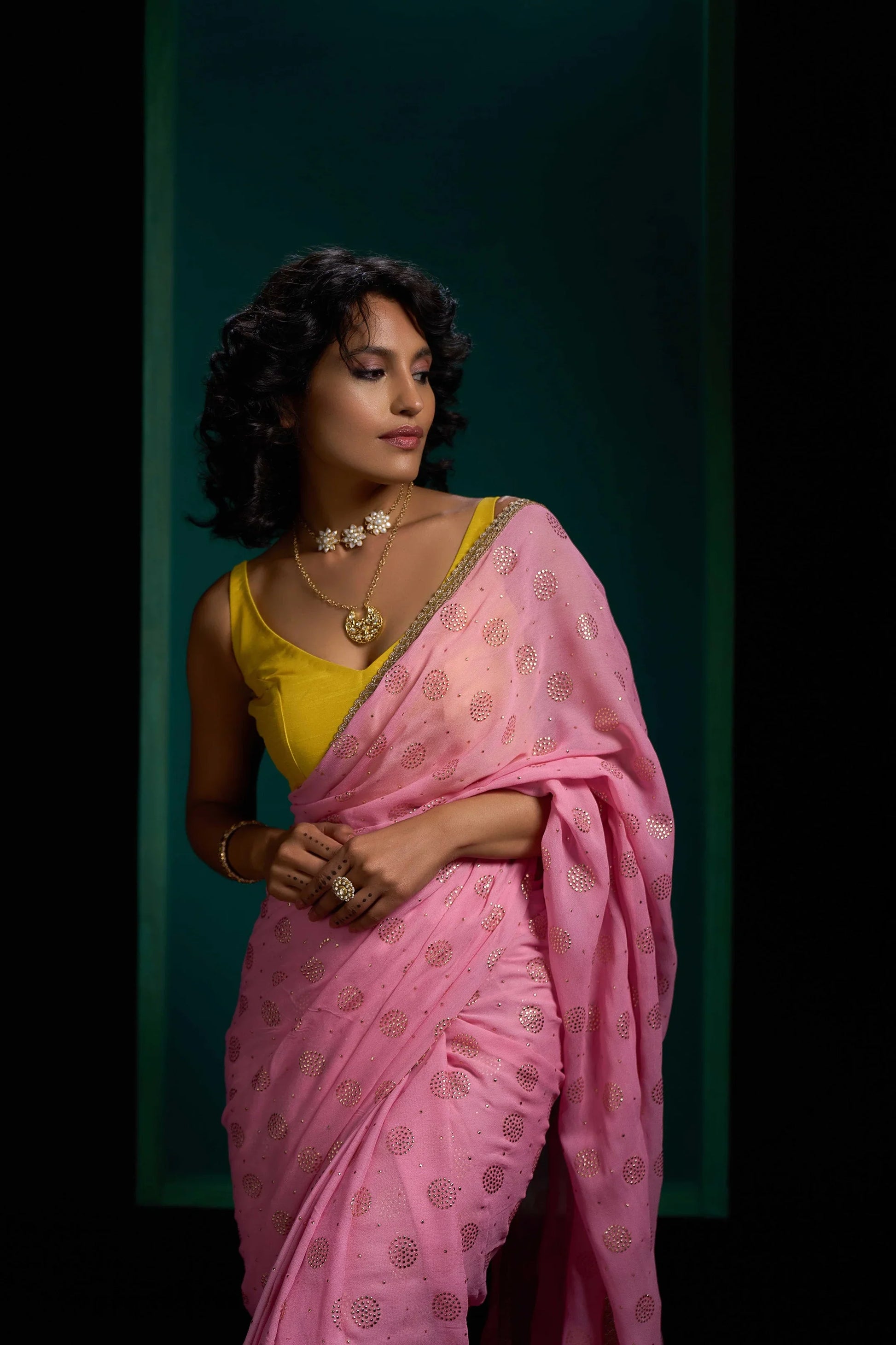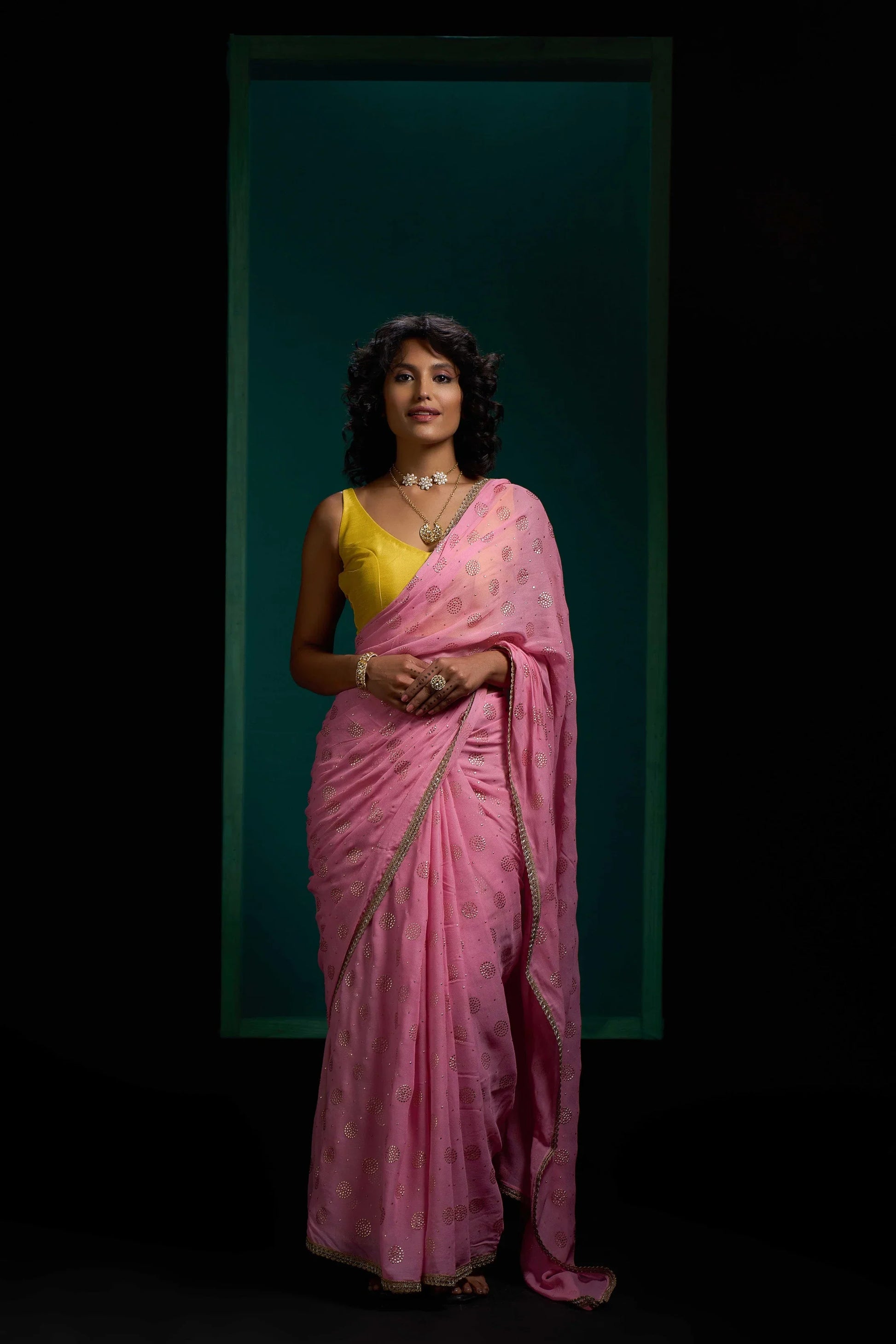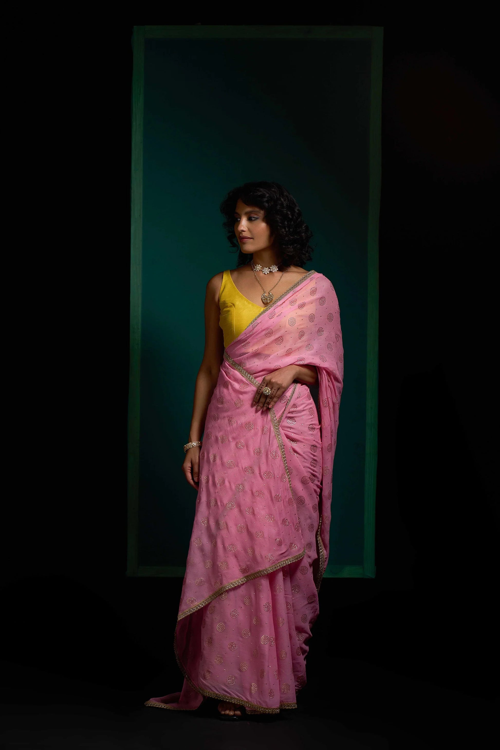 This saree is in viscose georgette fabric with Gold booties. Saree has golden gotta border to enhance the look. Saree is very light weight and easy to carry. Saree color is light pink.