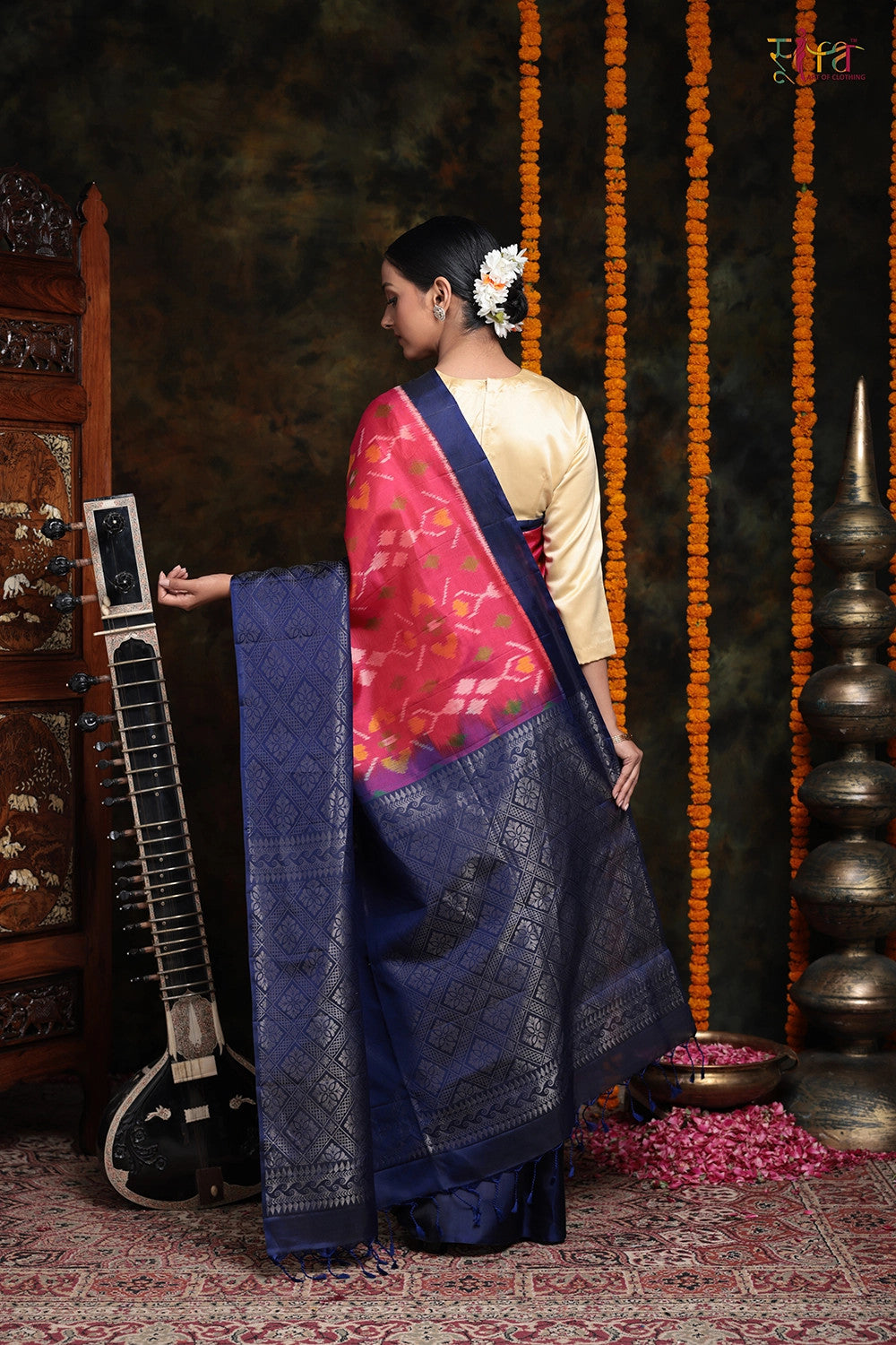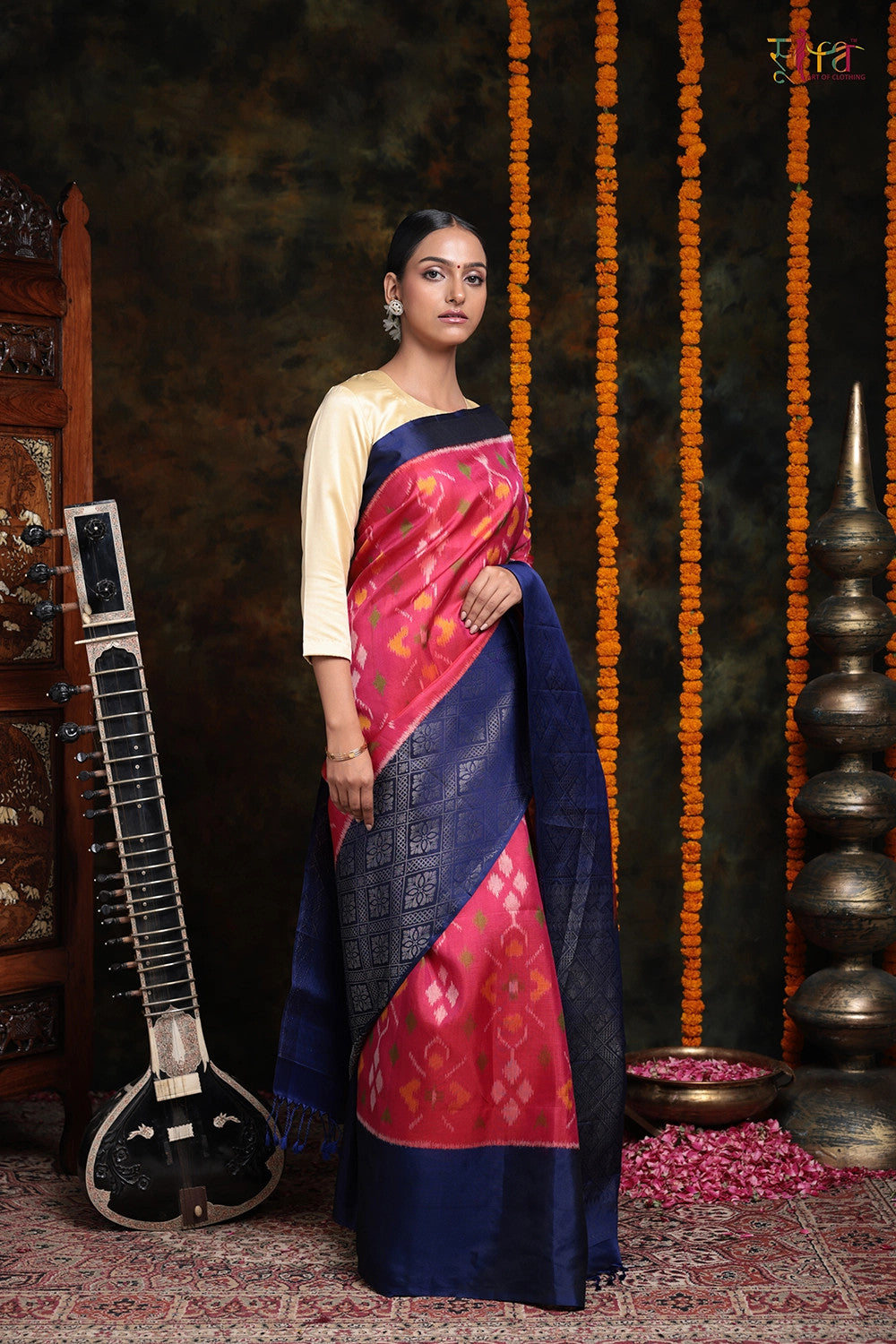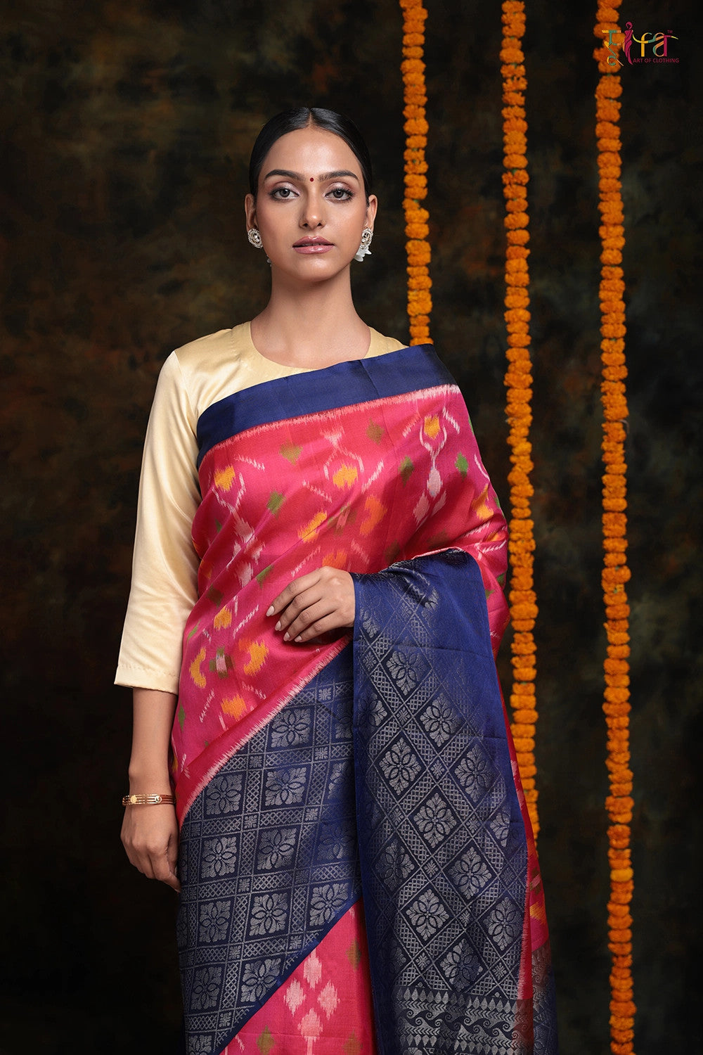 Rose Pink Pure Silk Pochampally Saree With Navy Blue Silver Zari Border