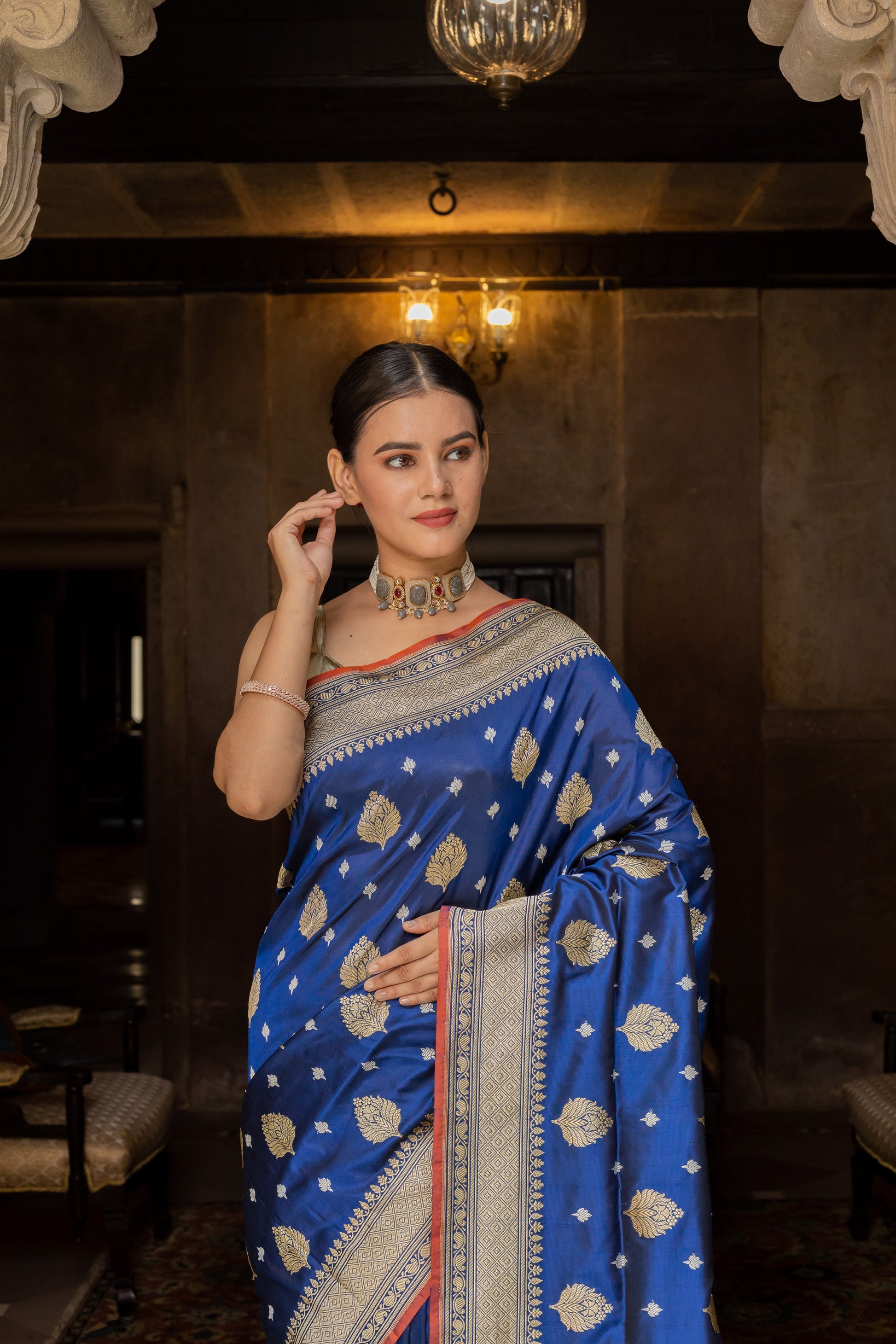 This Royal Blue Handwoven Kadwa Katan Silk Saree is a testament to the enduring beauty of Indian textiles. Its intricate design and rich blue color make it the perfect choice for special occasions and celebrations. This saree pays homage to India's weaving traditions and celebrates the art of handloom Banarasi silk.