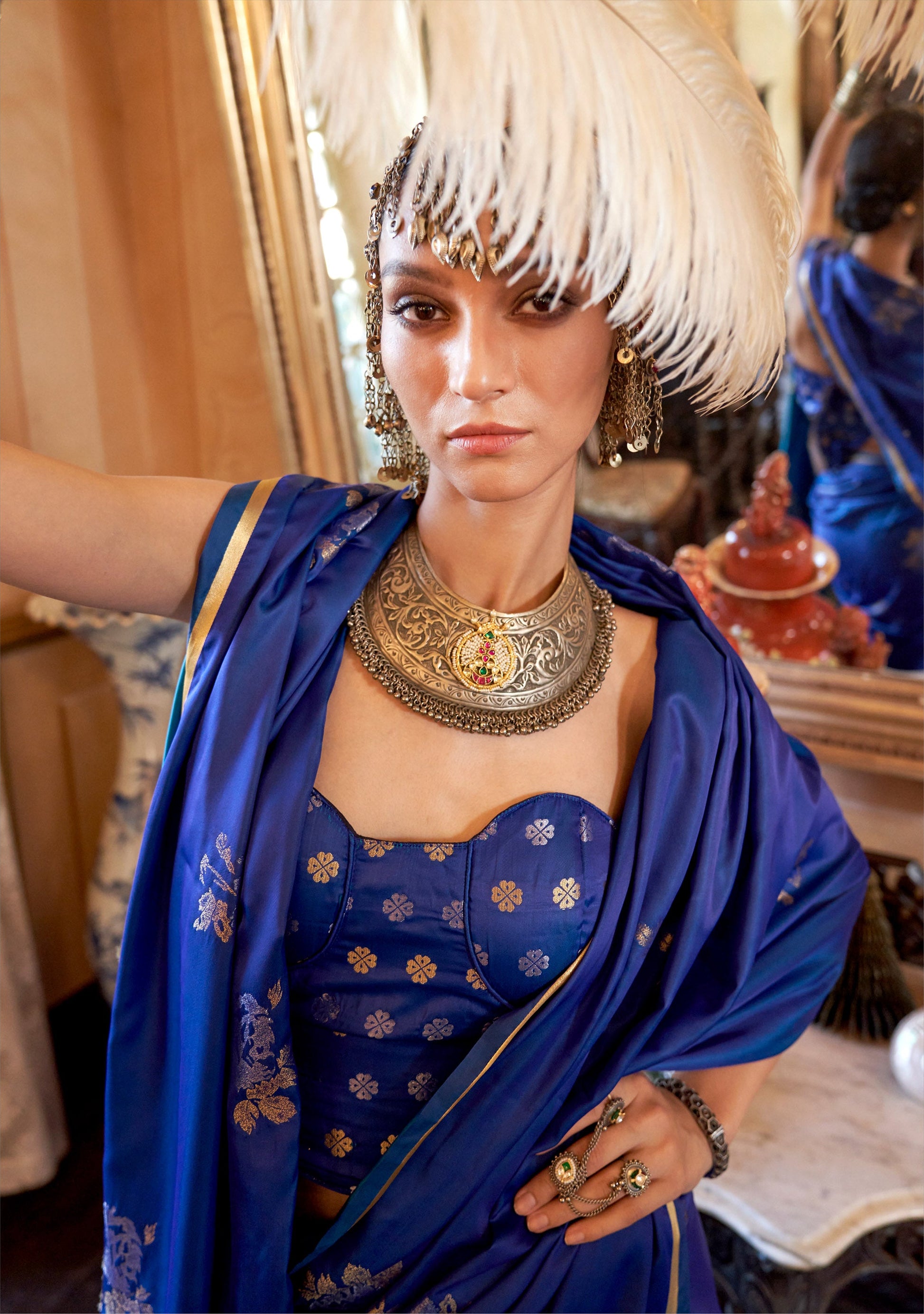 Royal Blue Kanthkala Satin Silk Handloom Saree