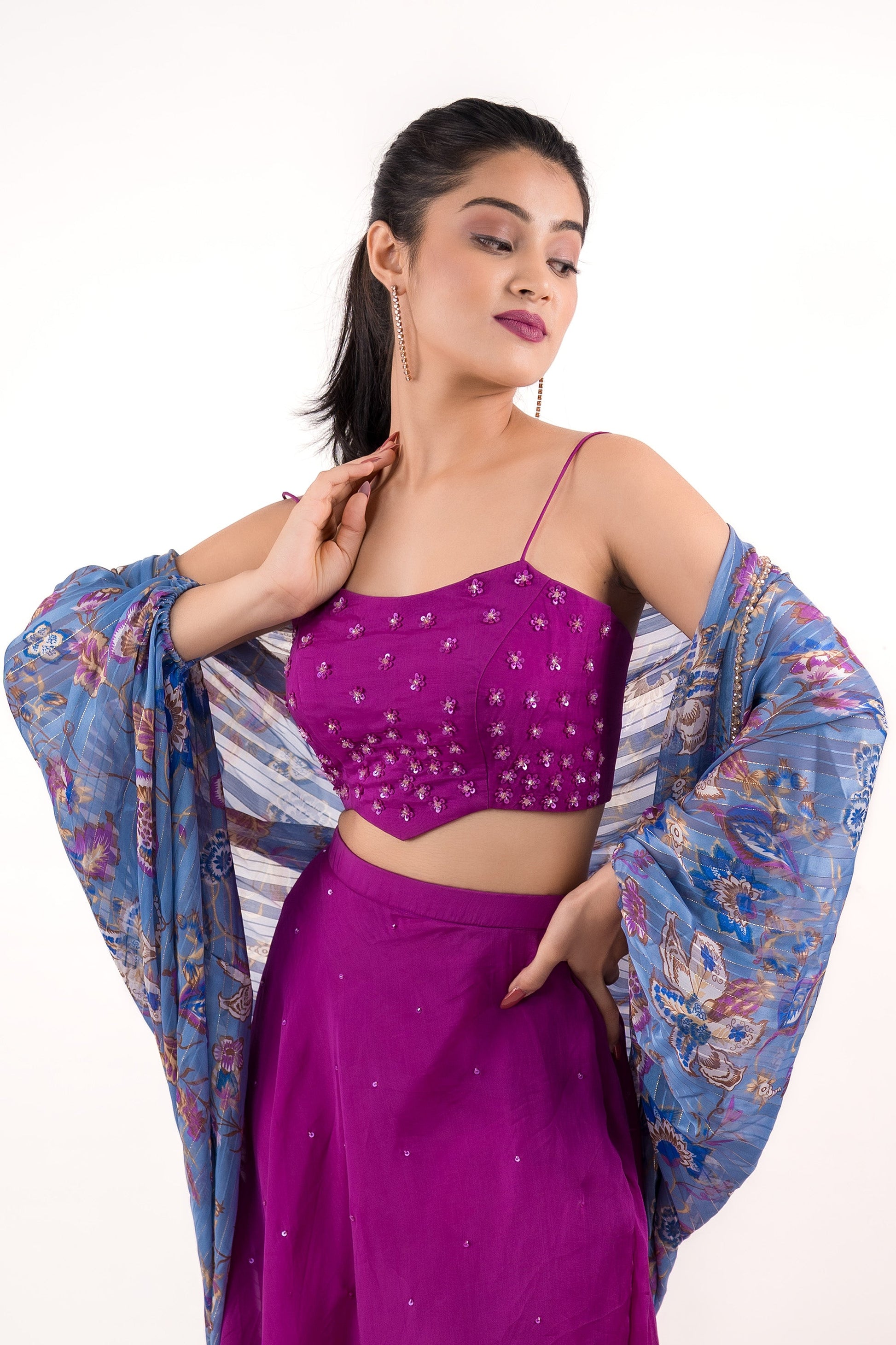 Royal Magenta crop top, Umbrella frilled Skirt with Bangle duppatta
