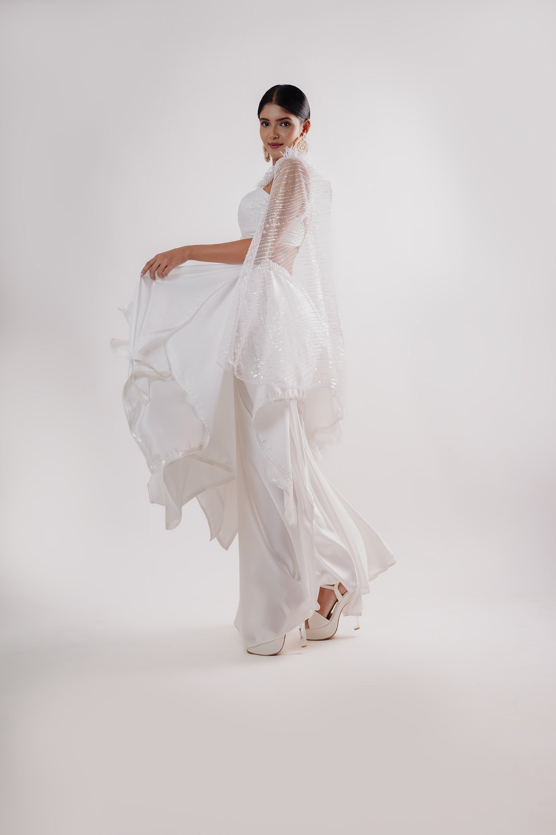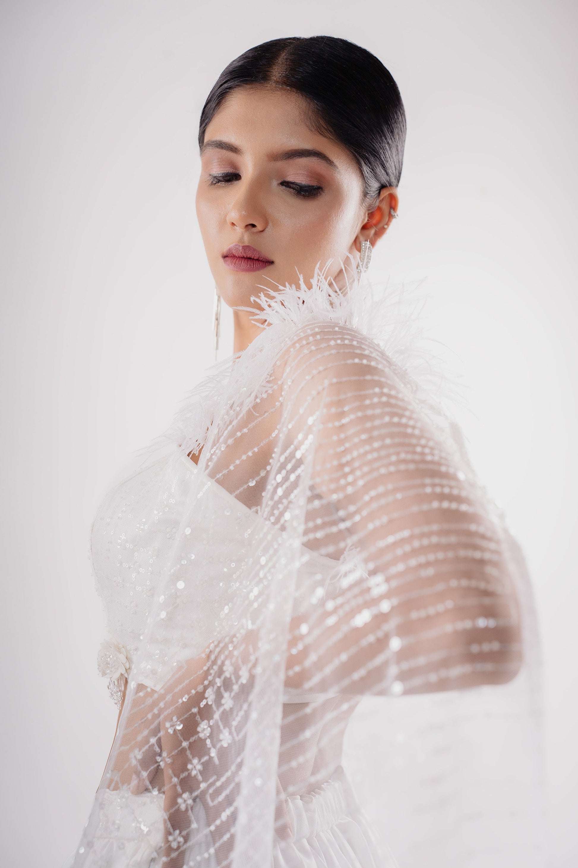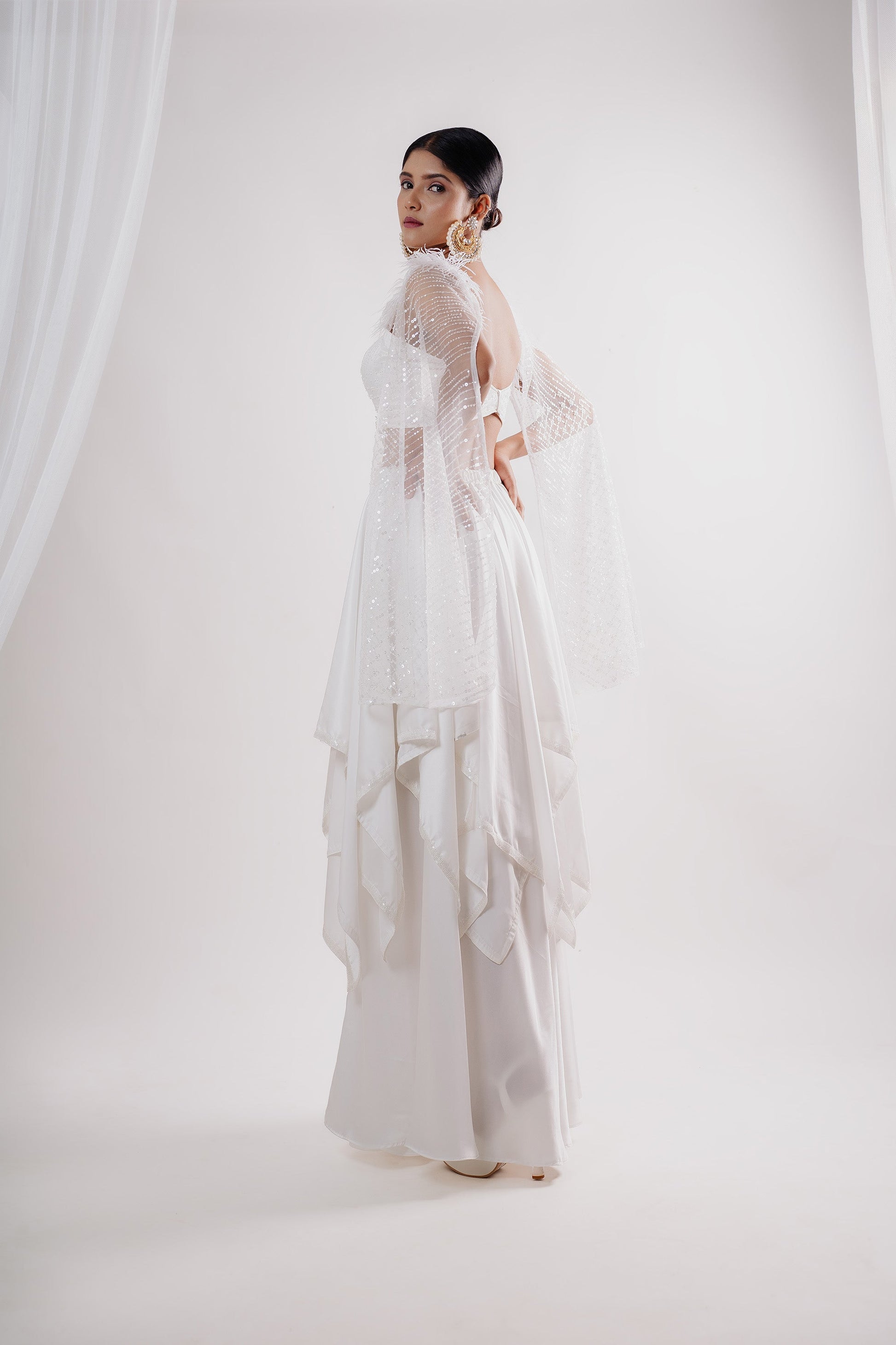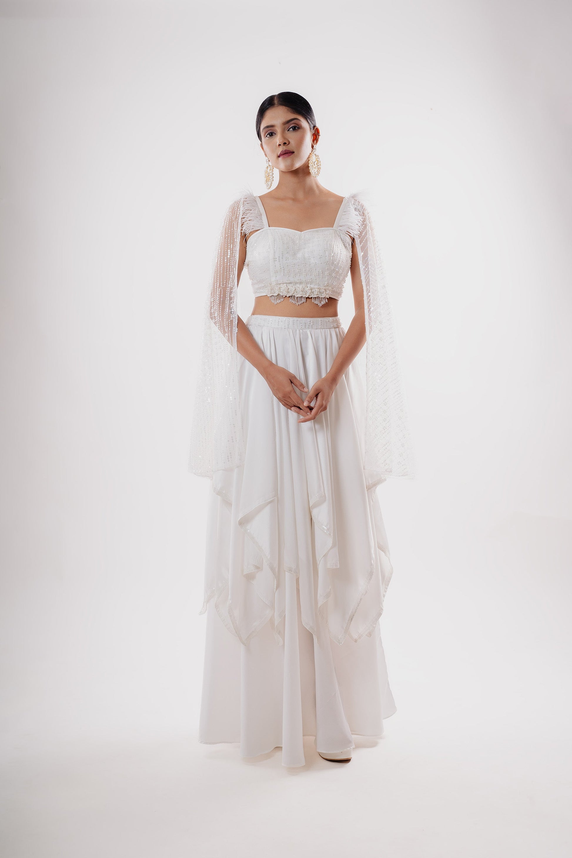 Royal White Two Layer Asymmetric Skirt with Crop Top-attached Cape Sleeves Embellished with Fur & Glass Beads