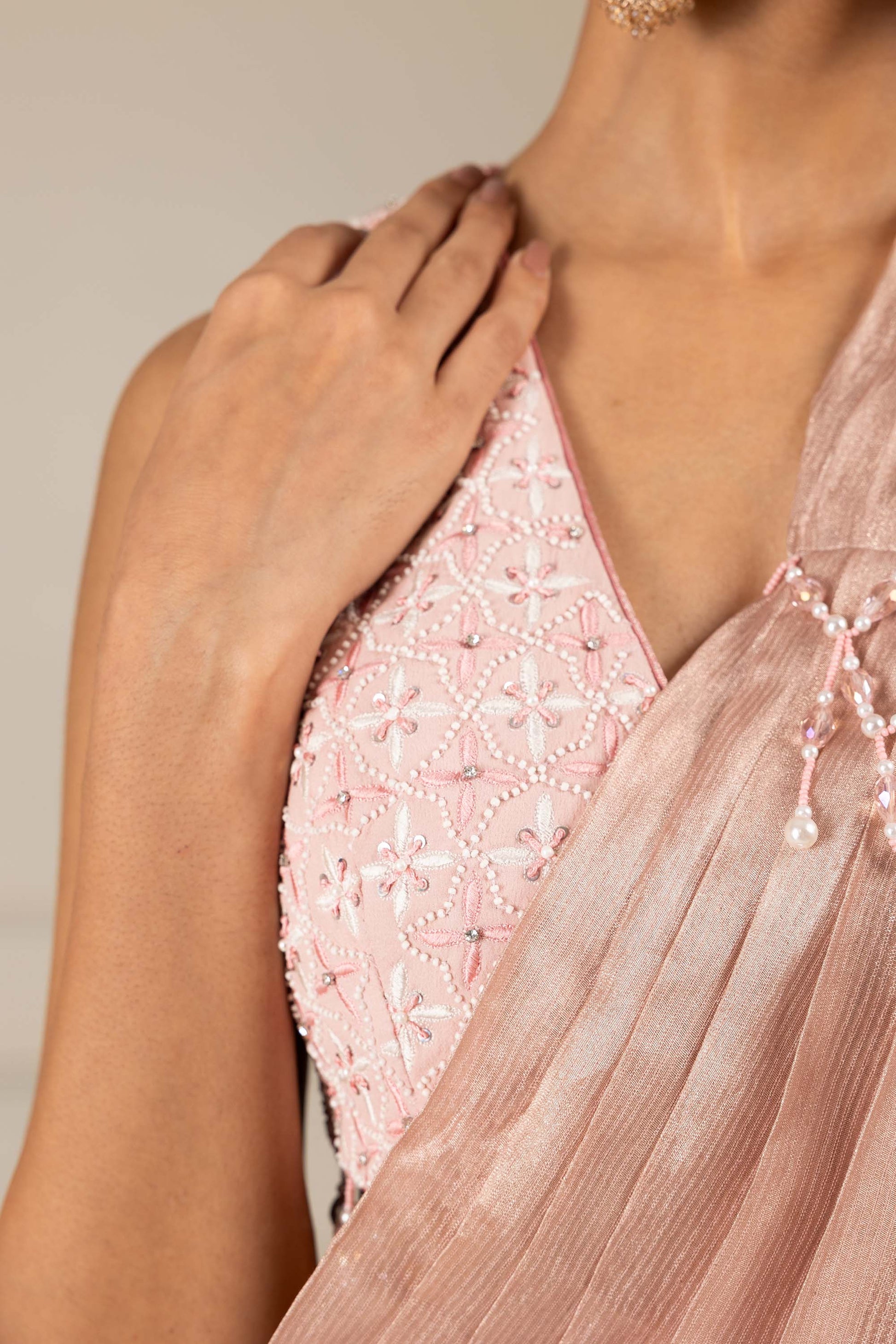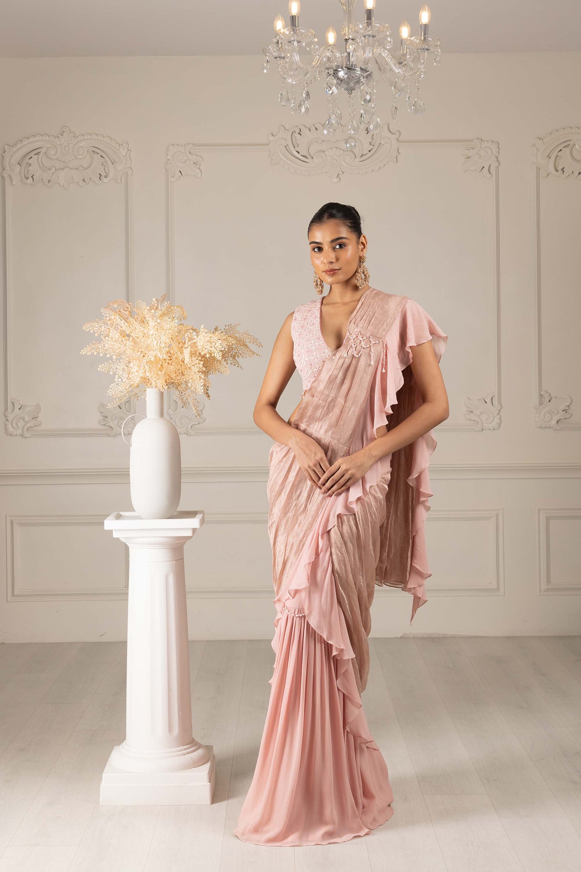 Featuring Peach silk georgette embroidered blouse with silk georgette skirt and organza drape pallu