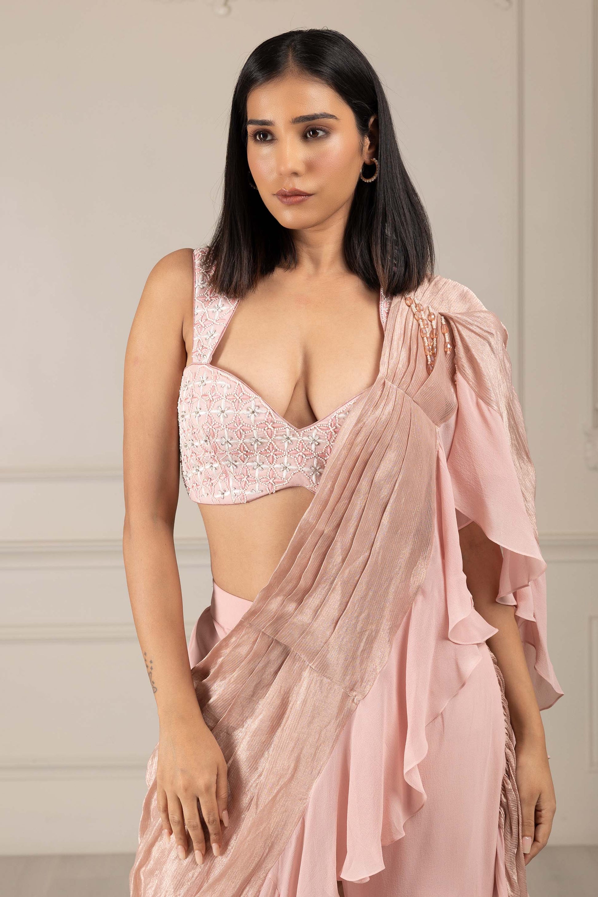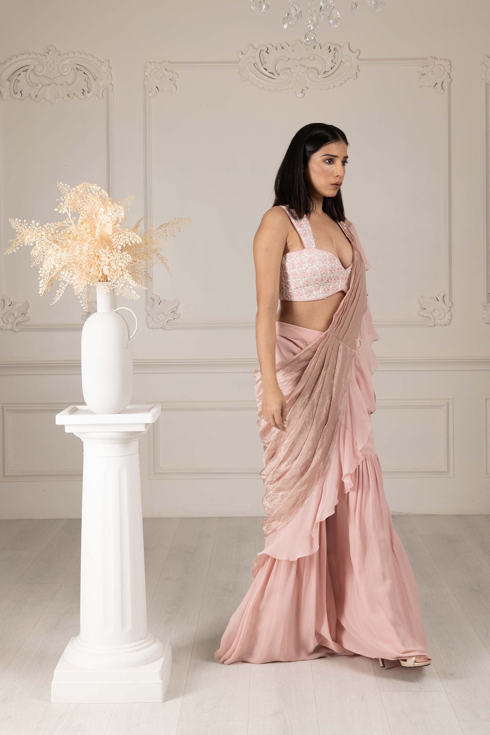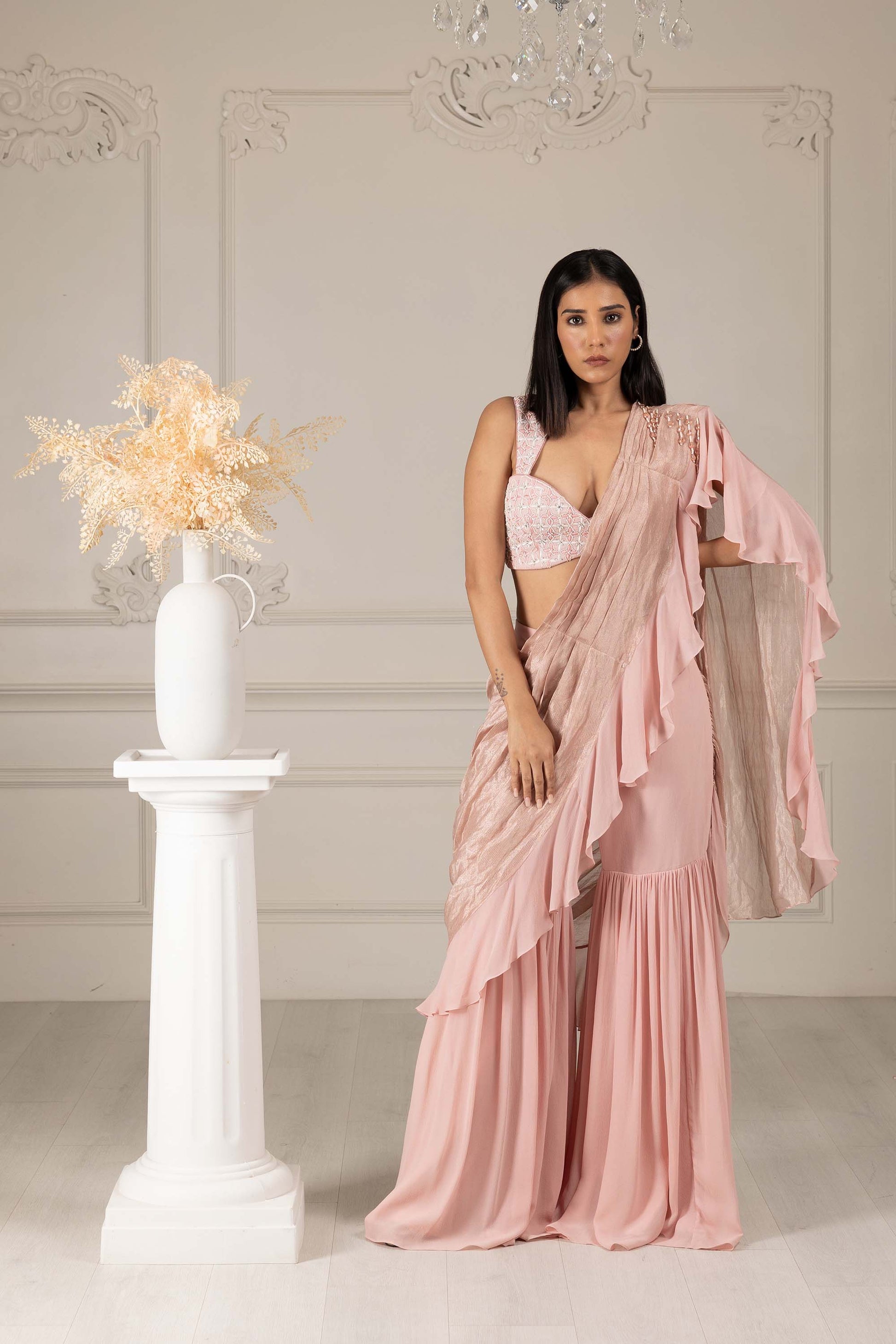 Featuring Peach silk georgette embroidered blouse with silk georgette sharara and organza drape pallu