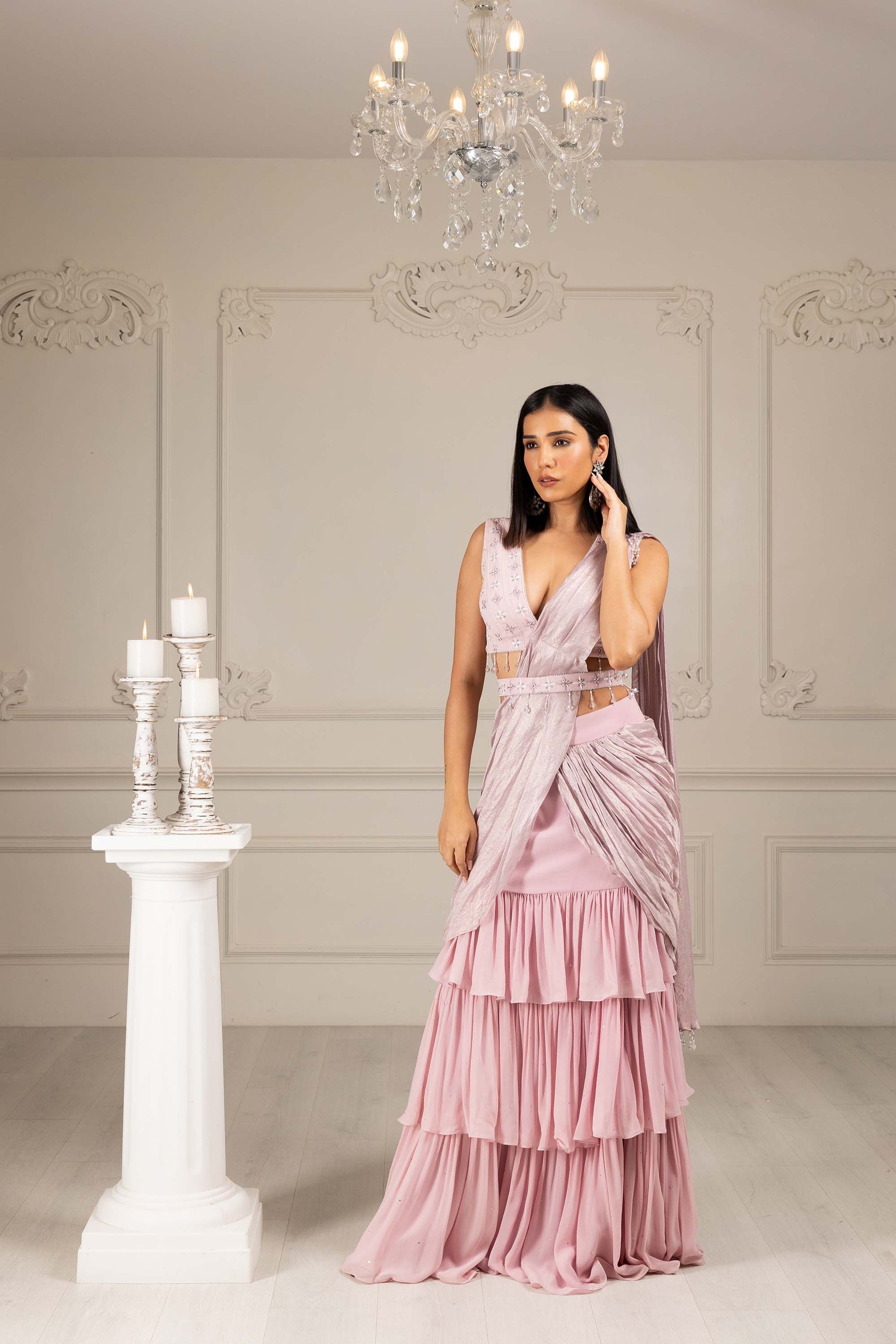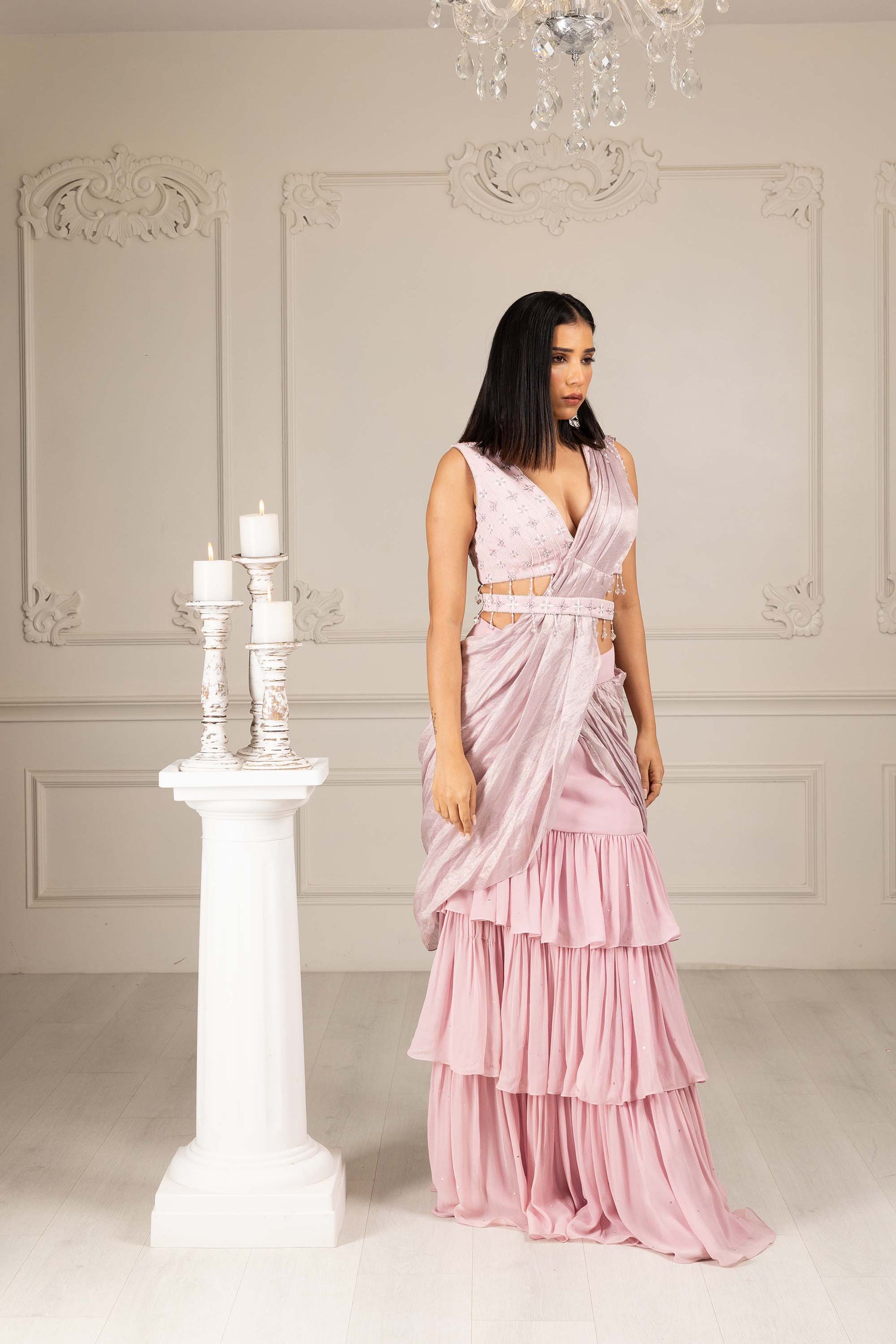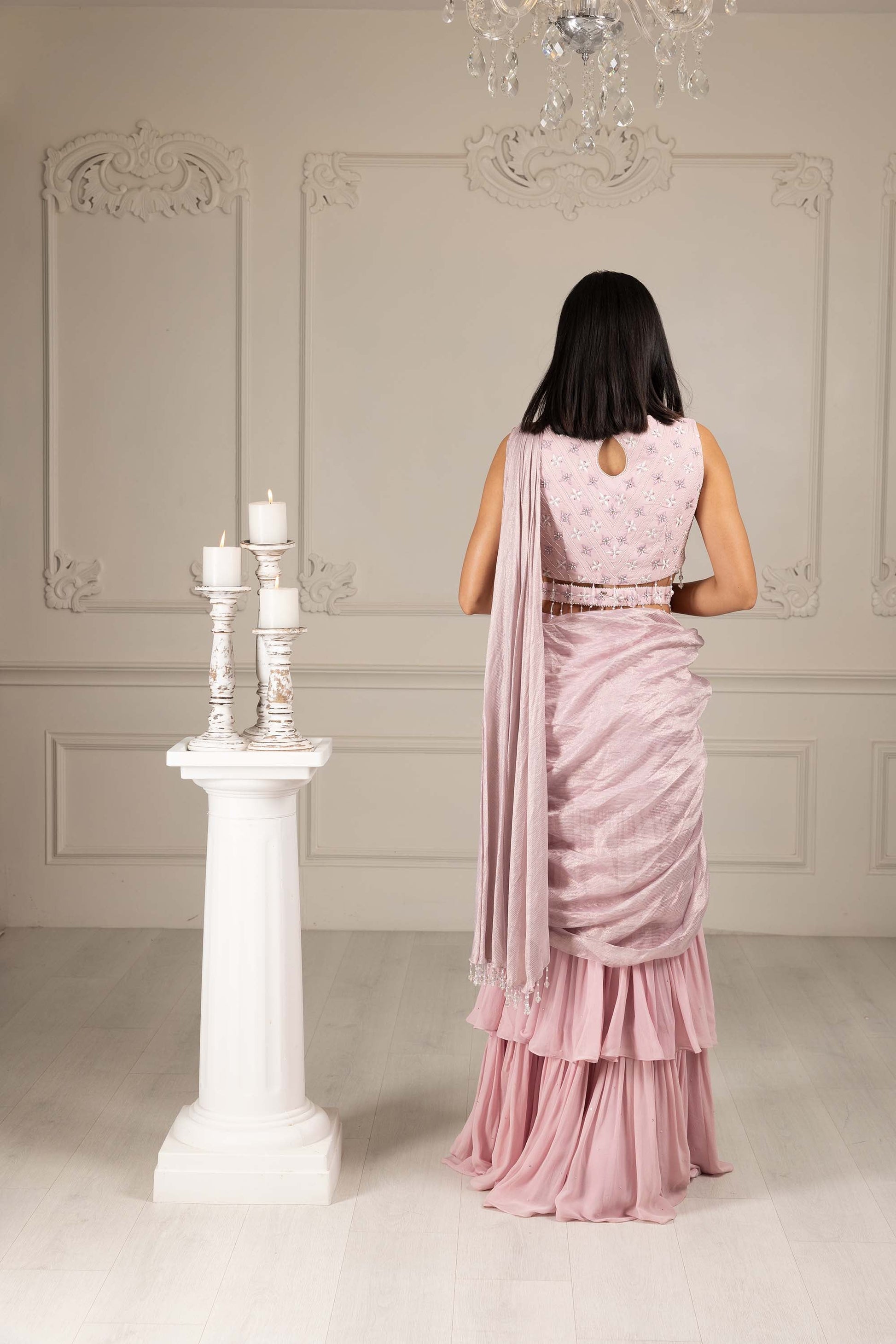Featuring Peach silk georgette embroidered blouse with silk georgette skirt and organza drape pallu