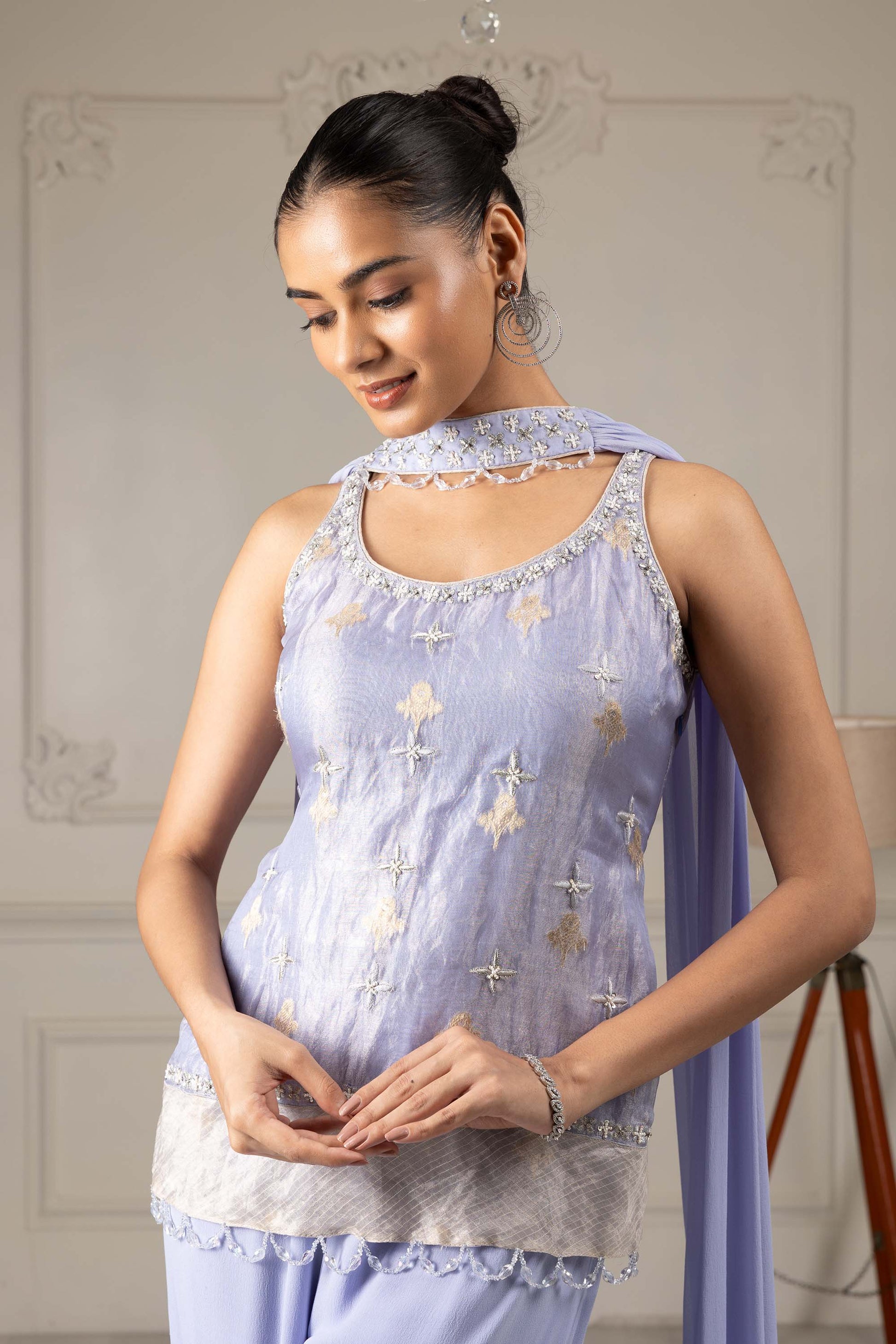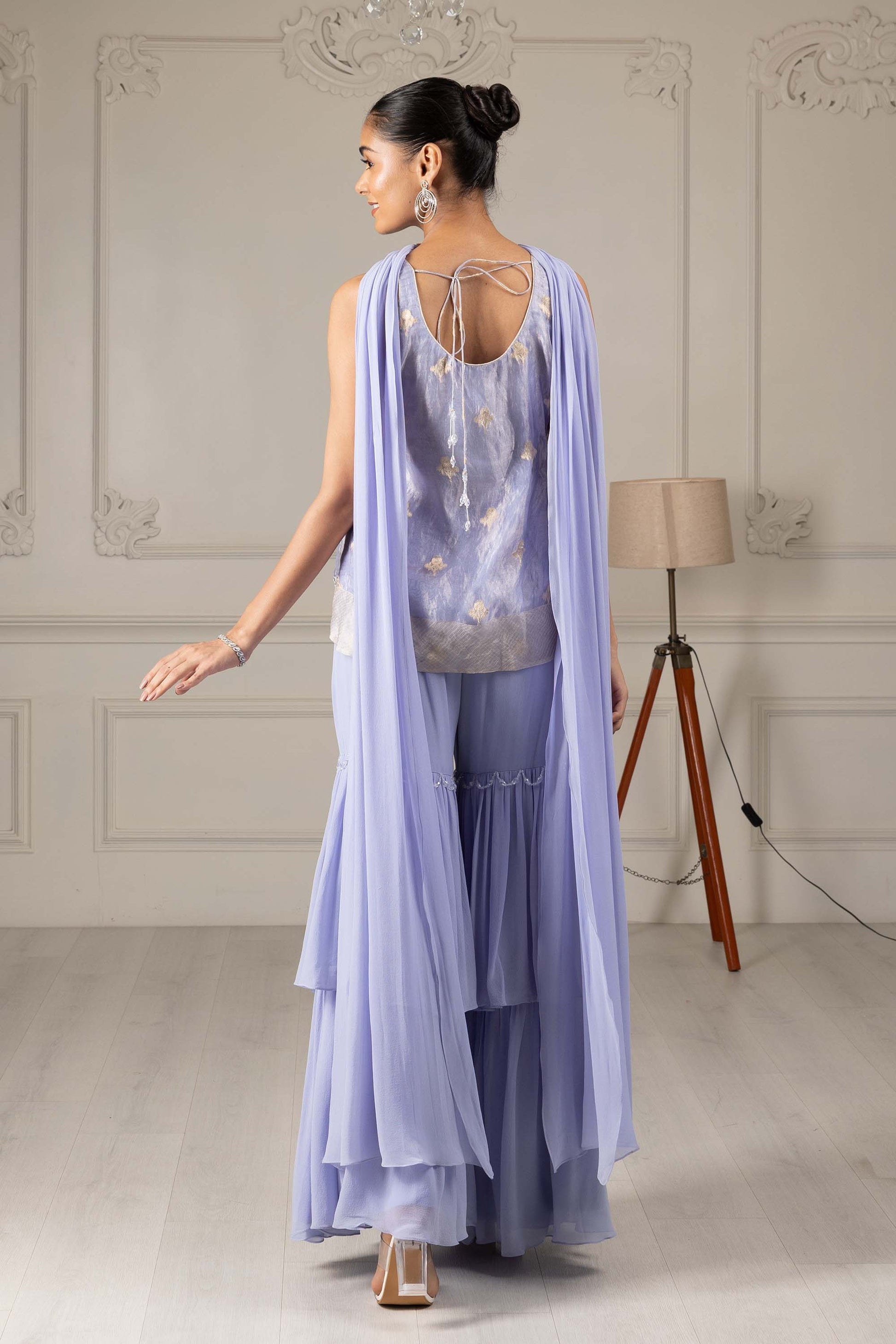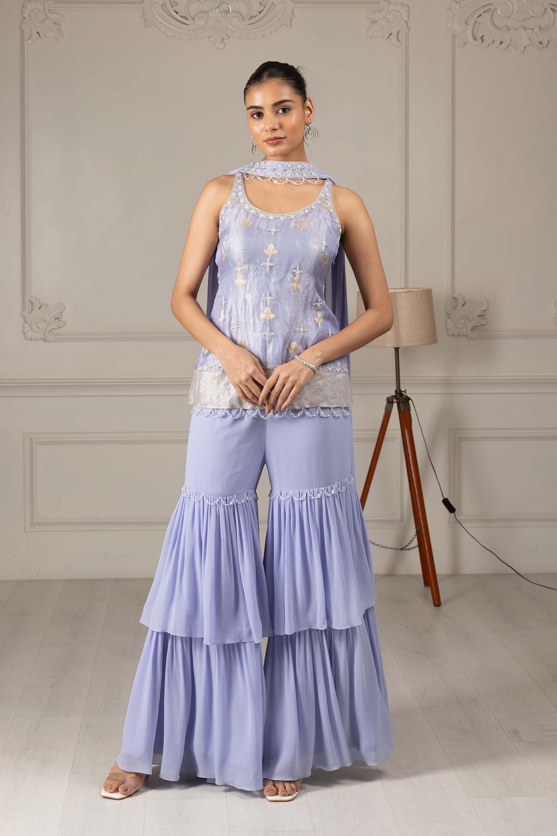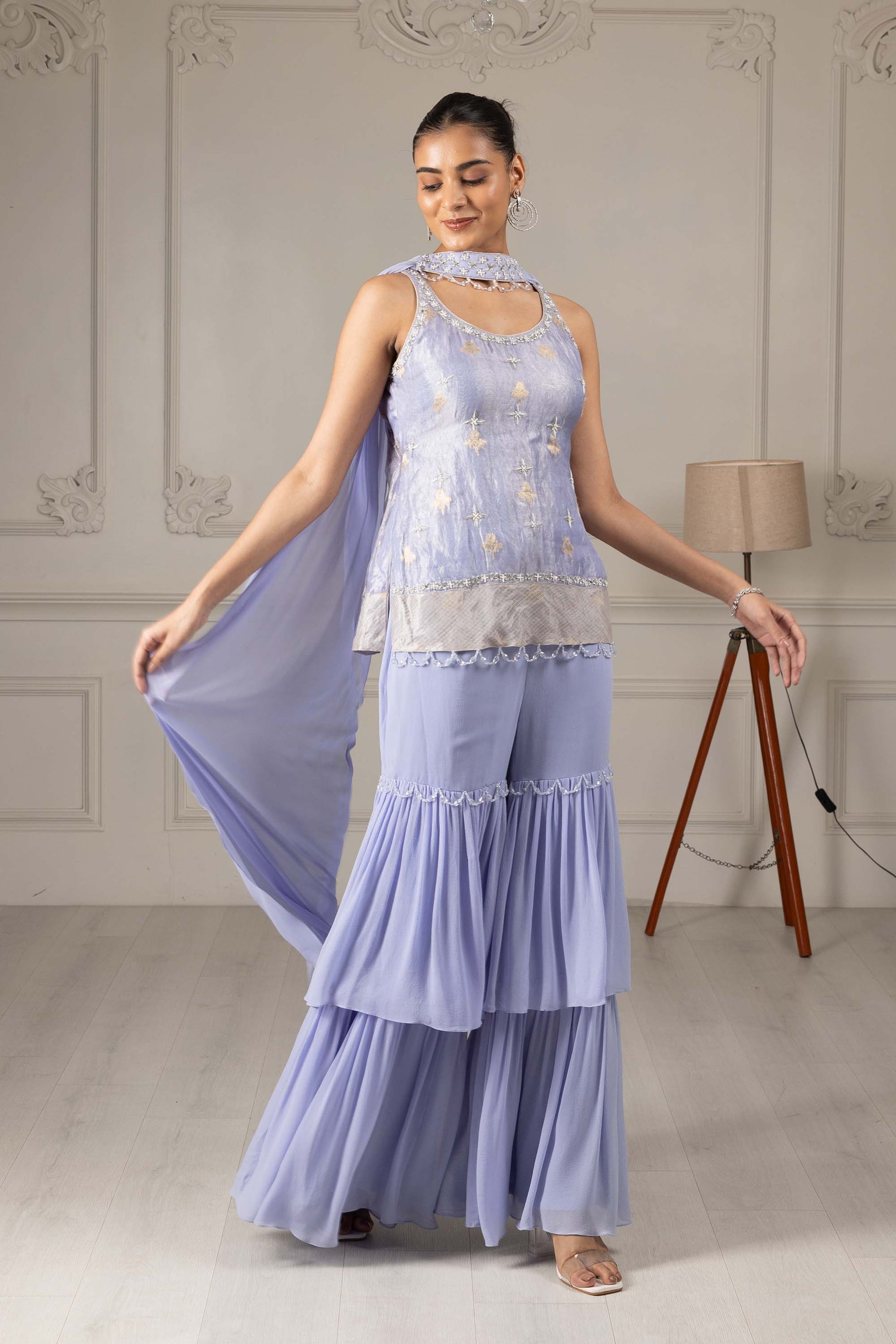 Featuring Sky blue banaras organza embroidered kurta with georgette sharara and embroidered organza dupatta