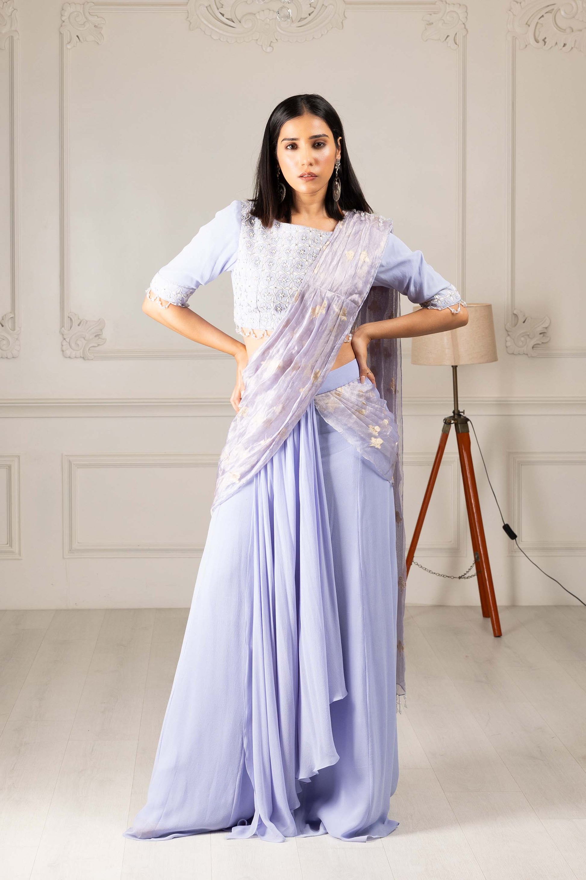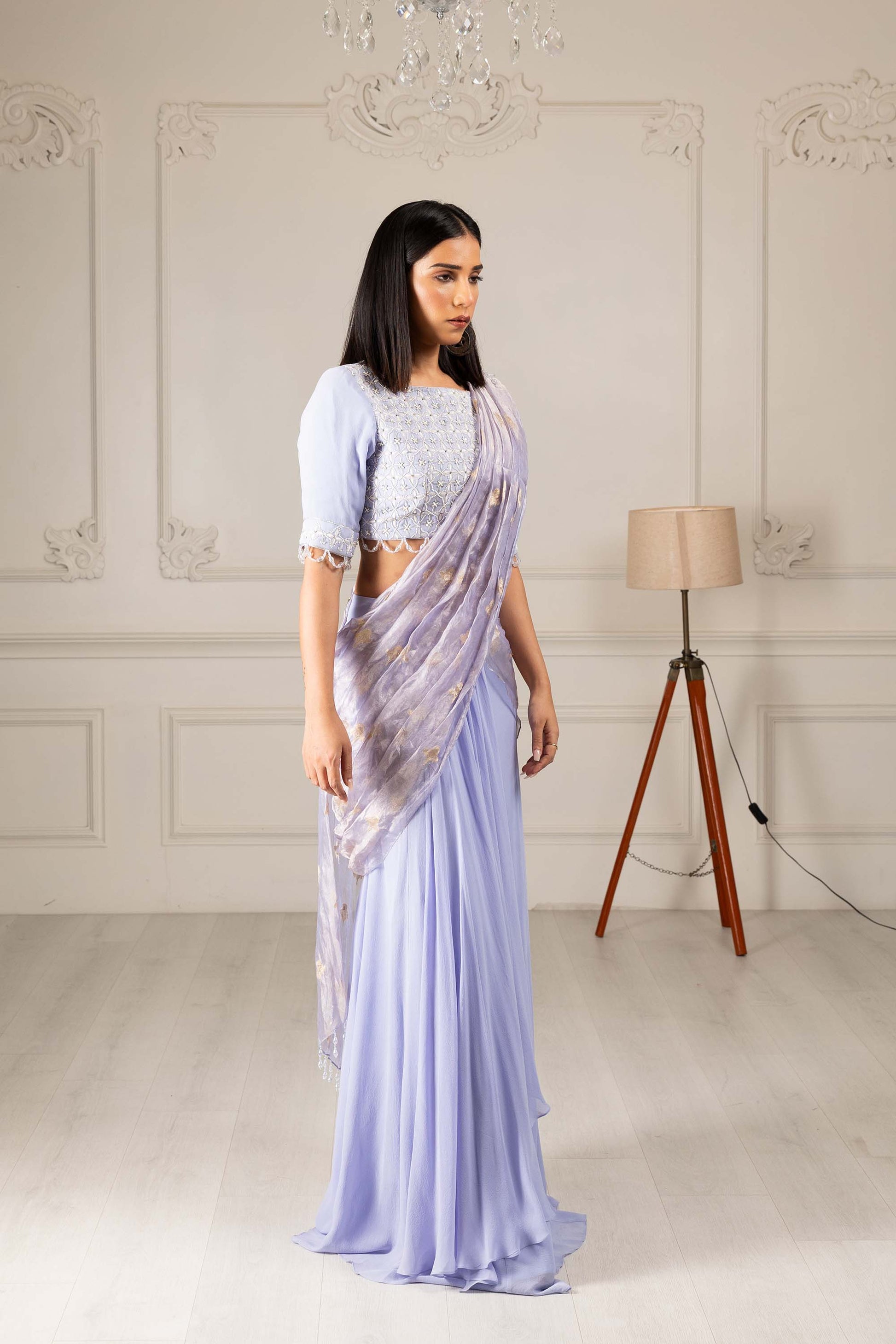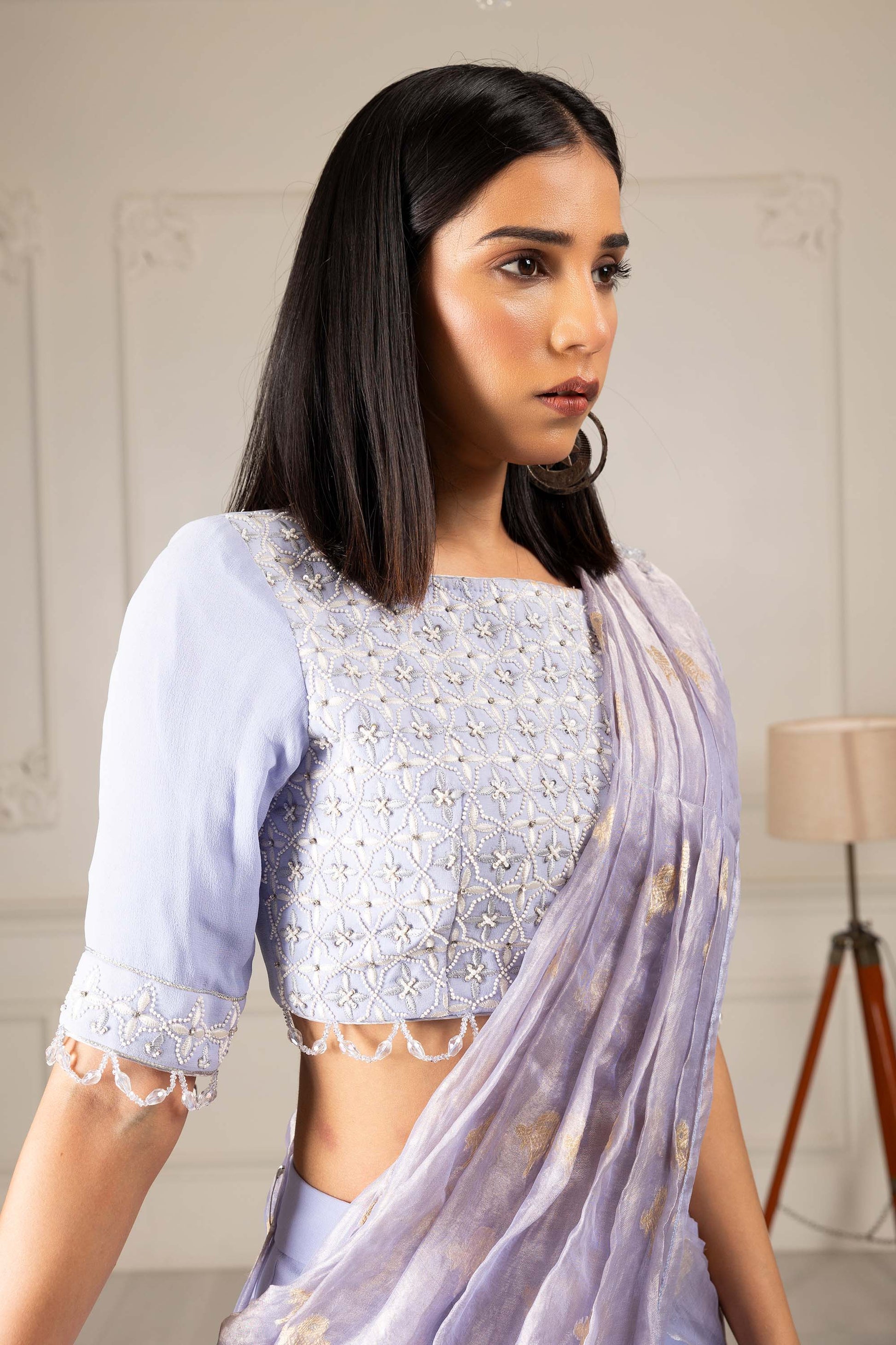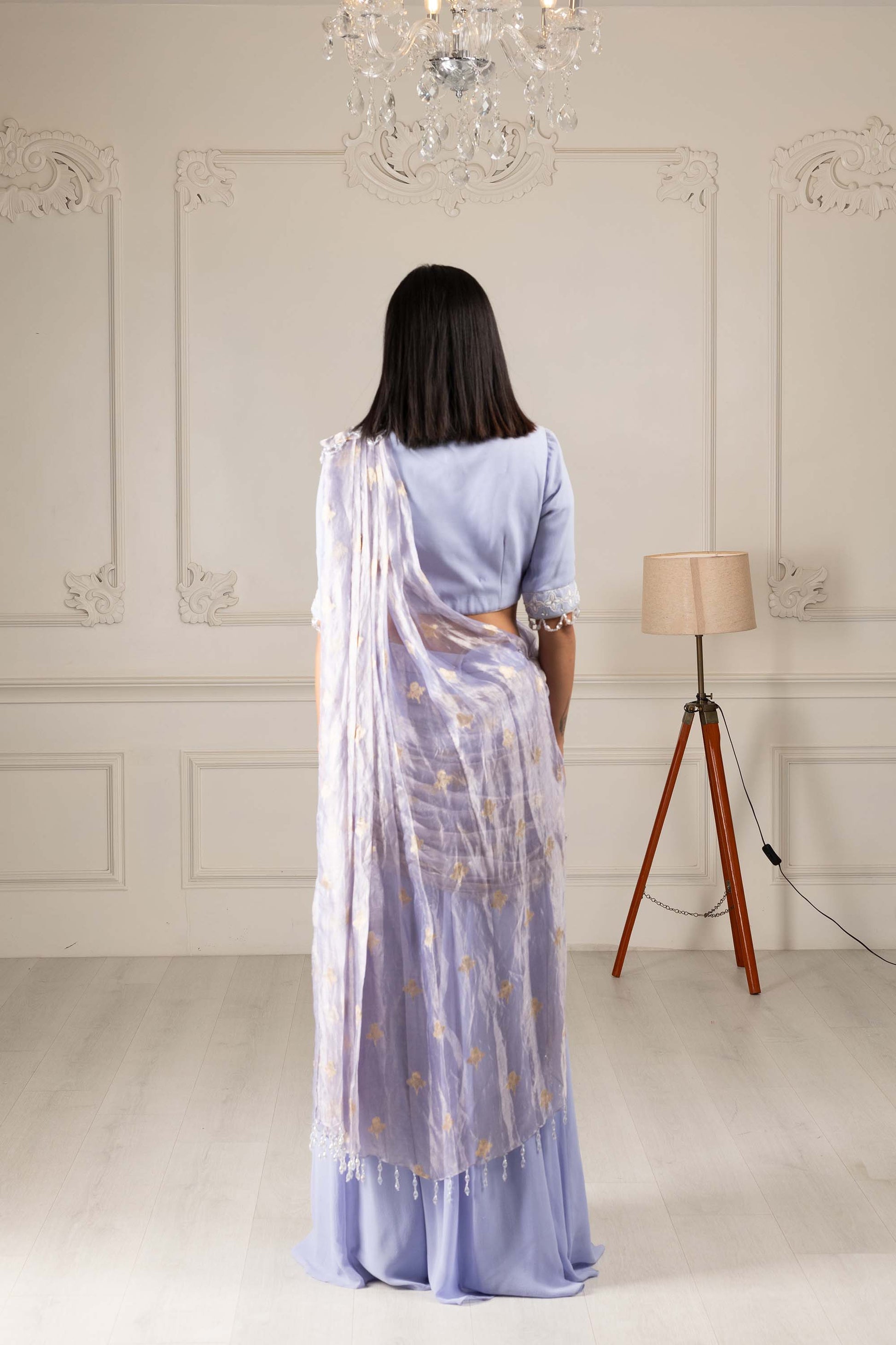 Featuring Sky Blue silk georgette embroidered blouse with silk georgette skirt and organza drape dupatta
