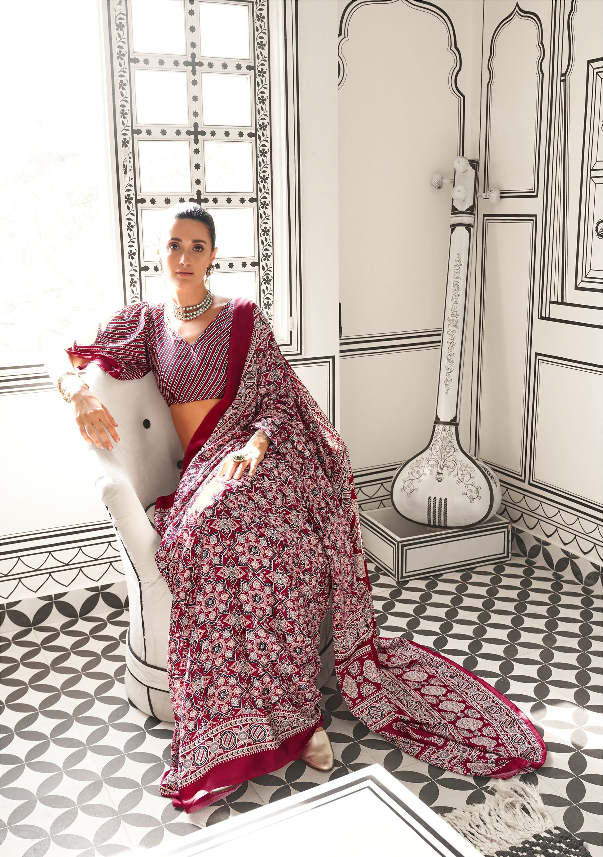 Ruby Red Kajarkh Printed Ajrakh Satin Saree