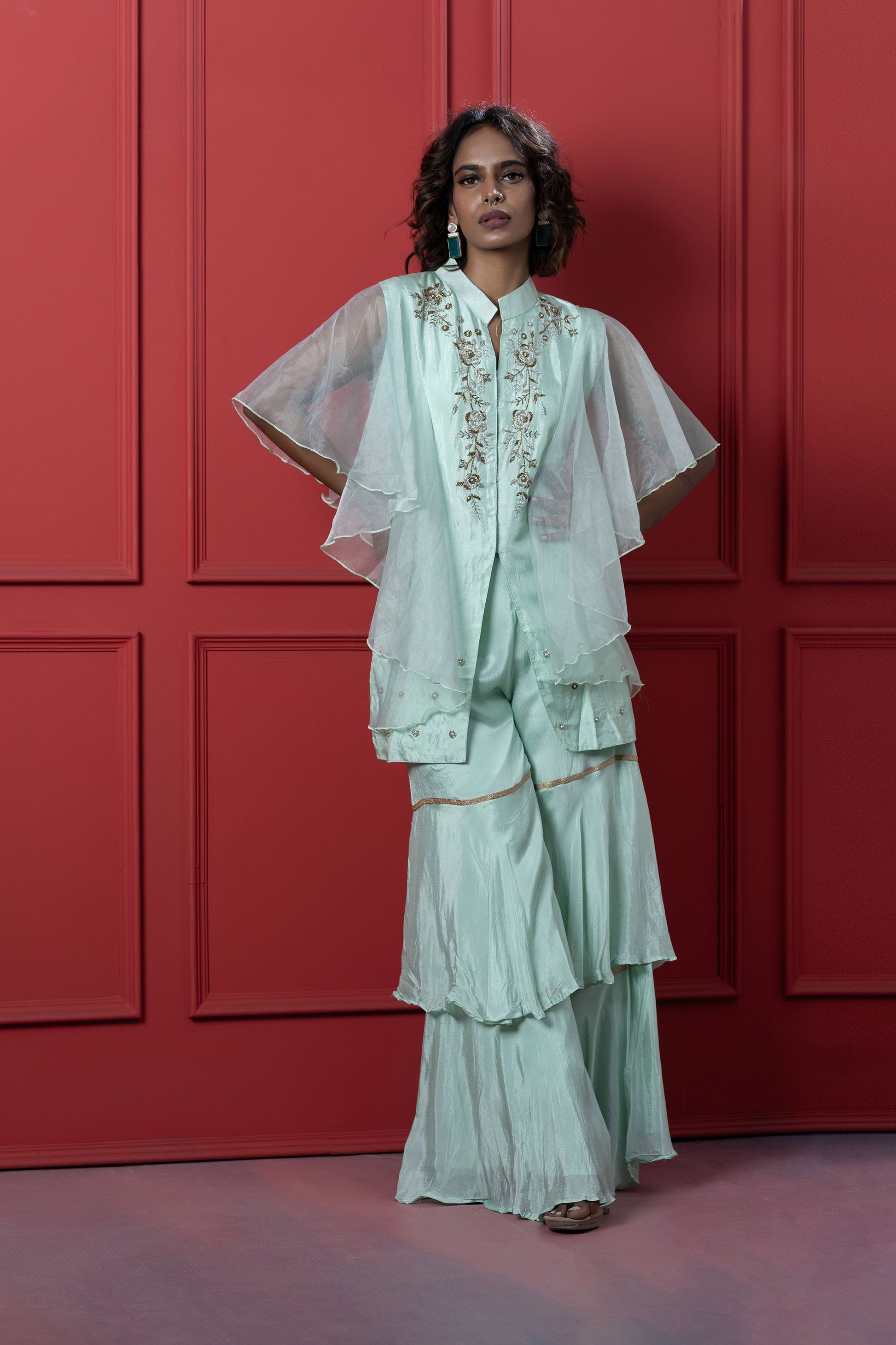 The top creates a cape-like effect featuring gold embroidery around the neck forming motifs. Complementing the top are the sharara style pants with tiered layers.