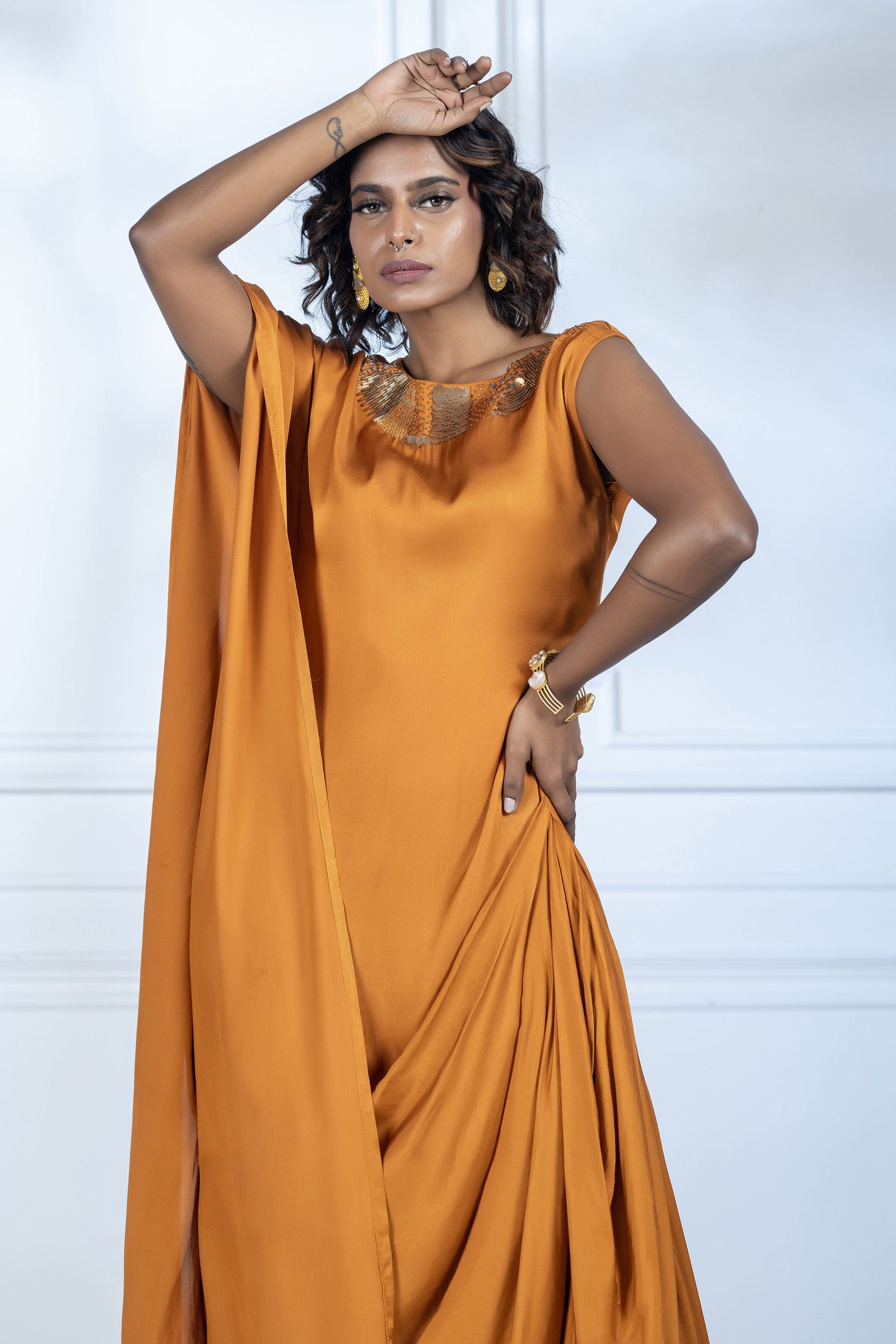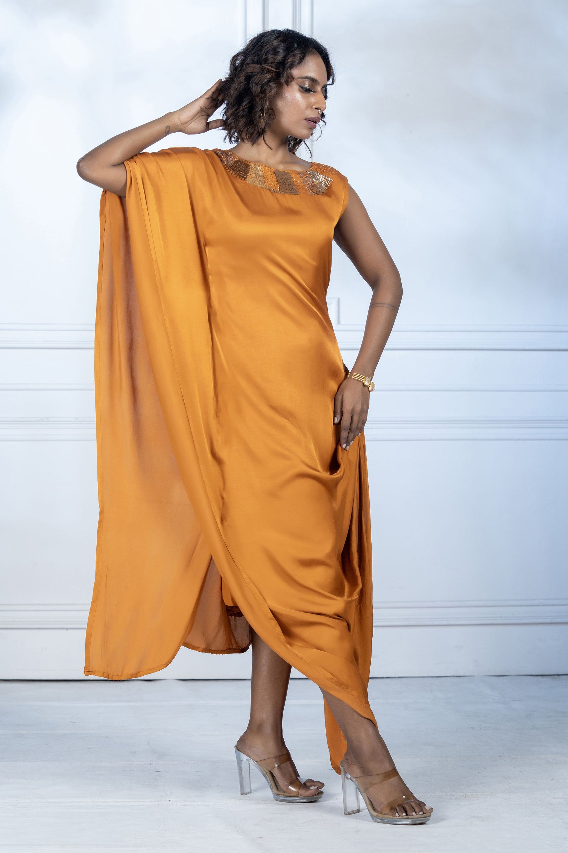 The dress features an asymmetrical cowl style creating soft folds that add volume and texture. The neckline includes metallic beads and sequence in gold tones