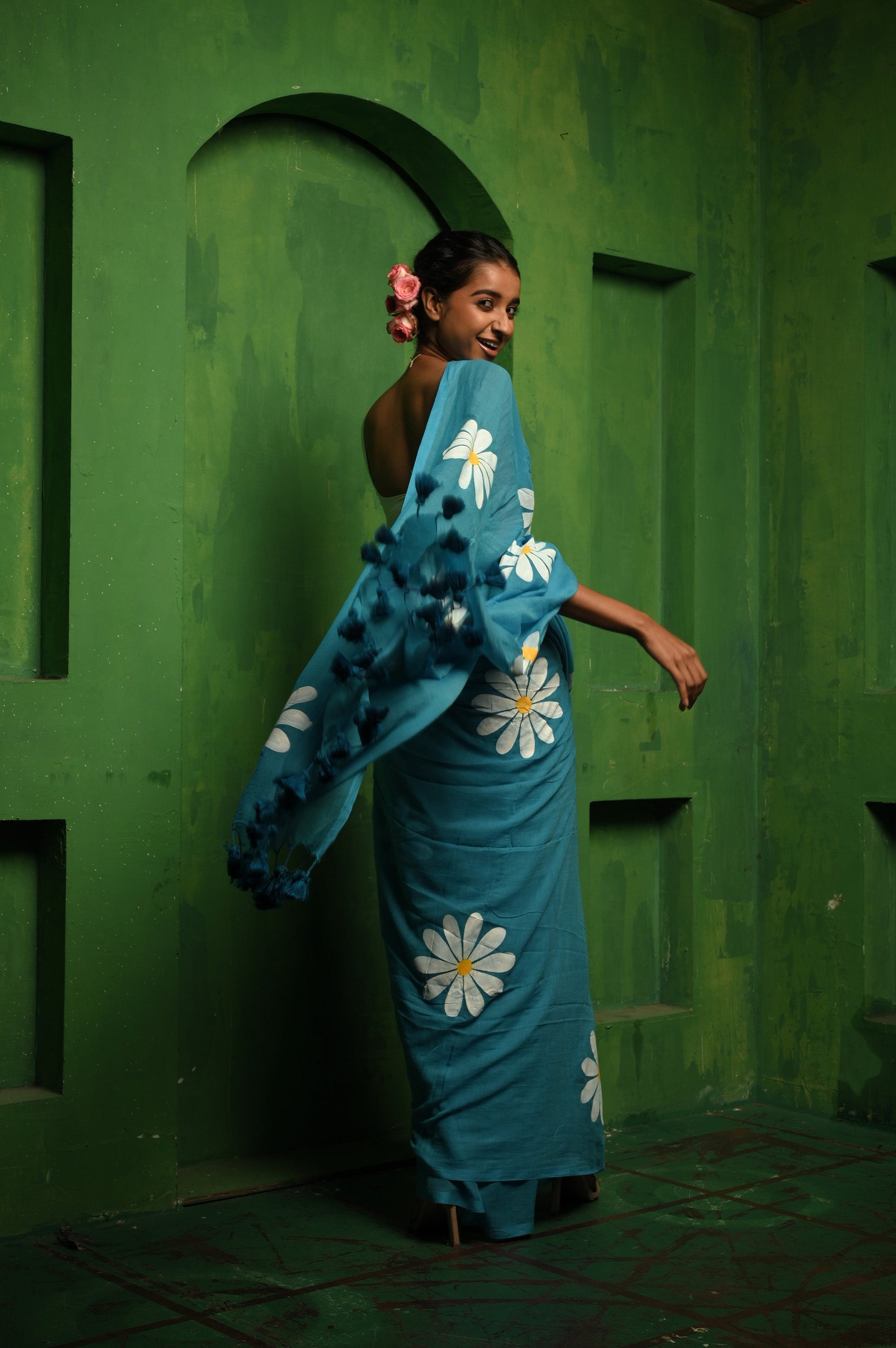 Saanjh ki dulhan I Blue mul cotton handloom saree with hand painted florals