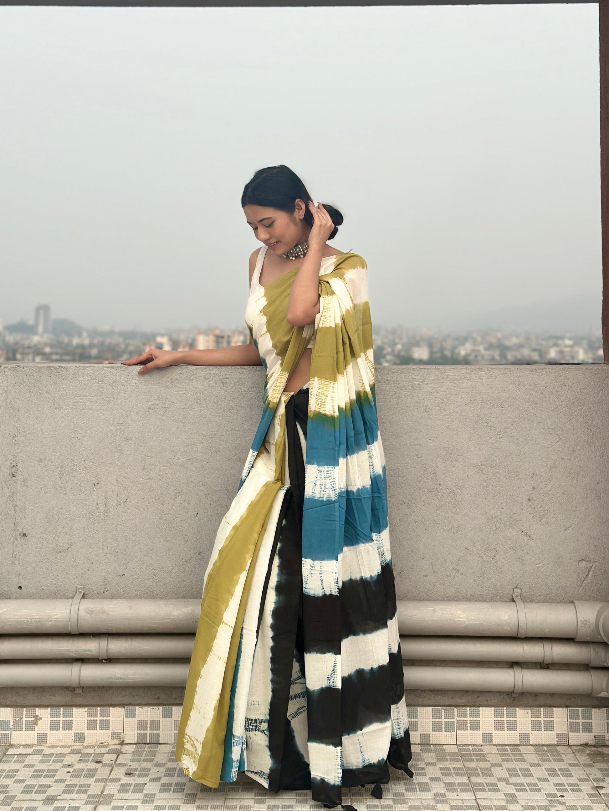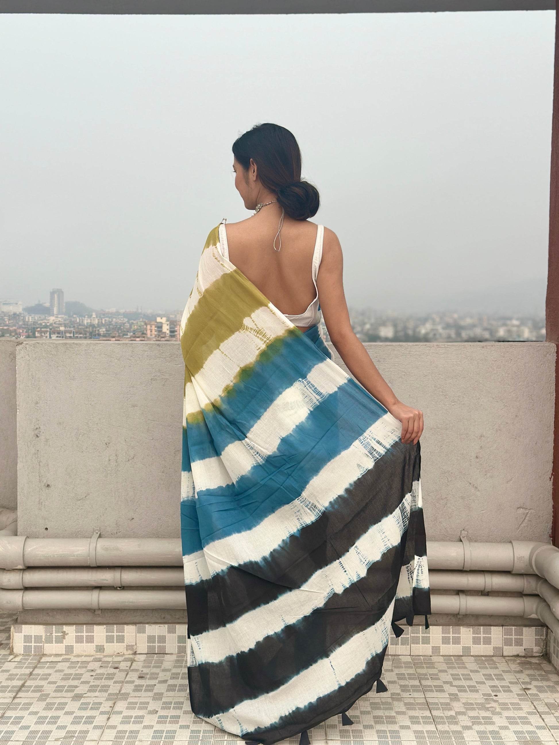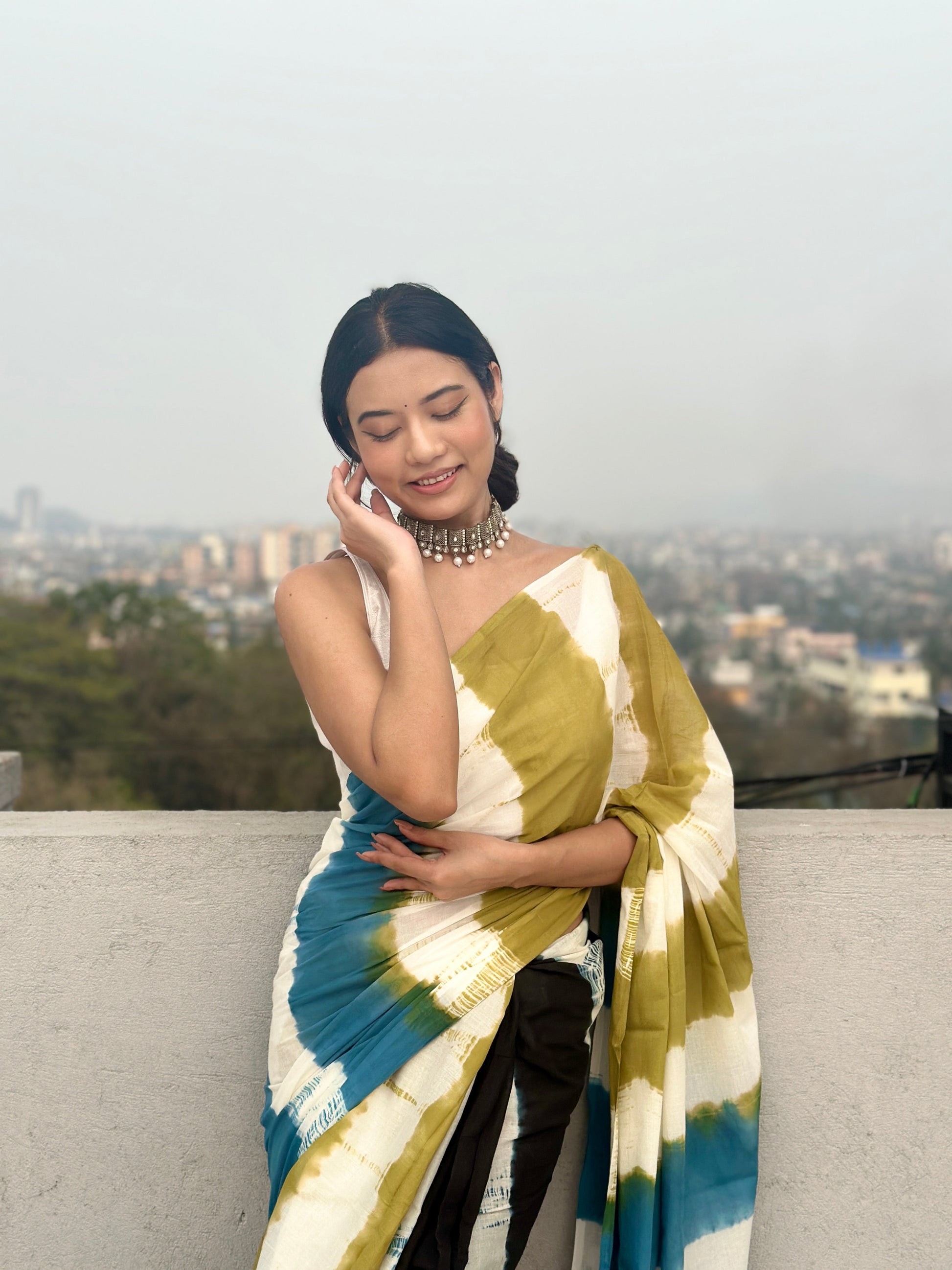 Sagar Kinare - Tie & Dye Shibori Print Natural Dyed - White Mulmul Cotton Saree