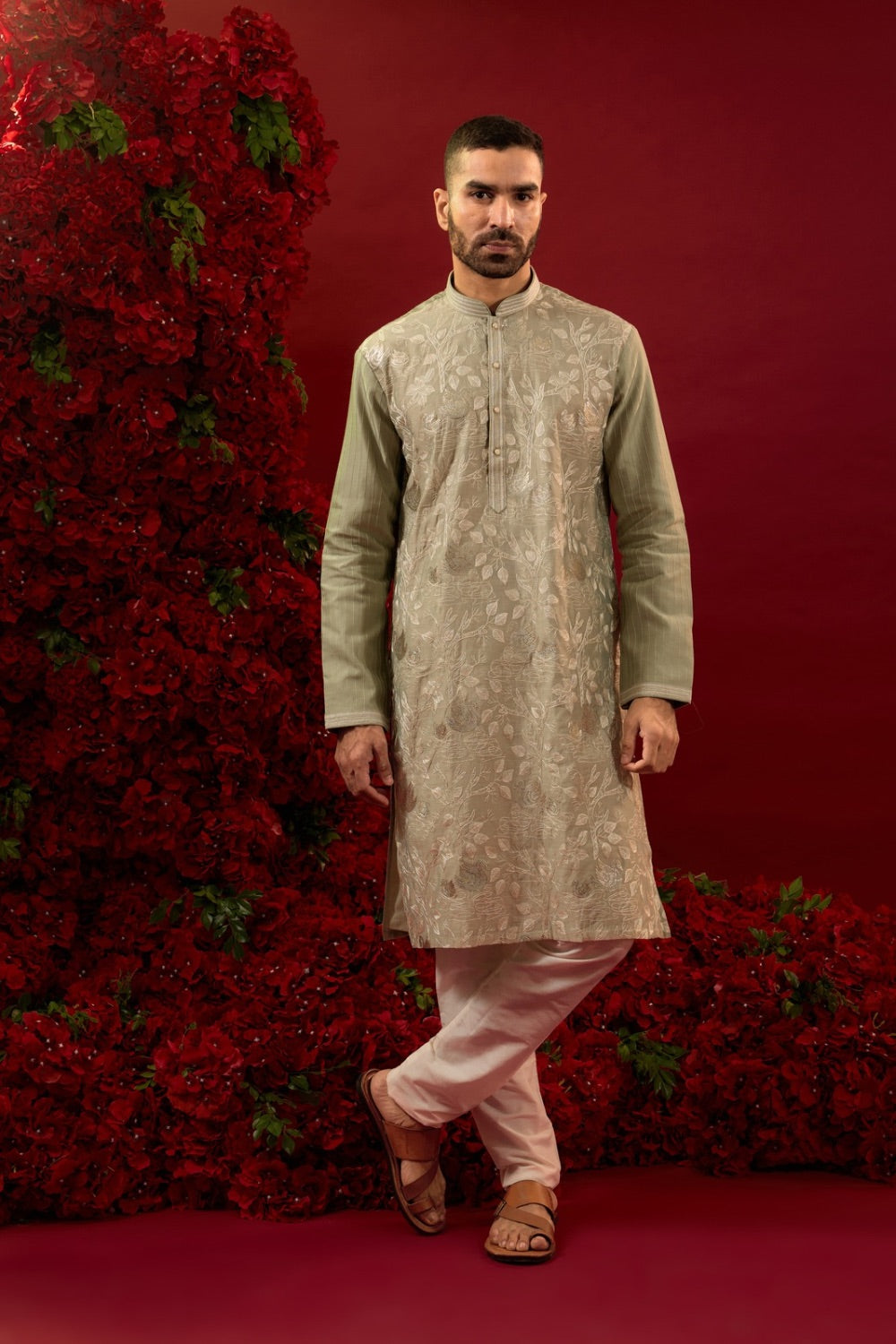 Radiate regal charm with sage green silk kurta set featuring floral embroidery with machine work. The outfit is completed with white pajama.