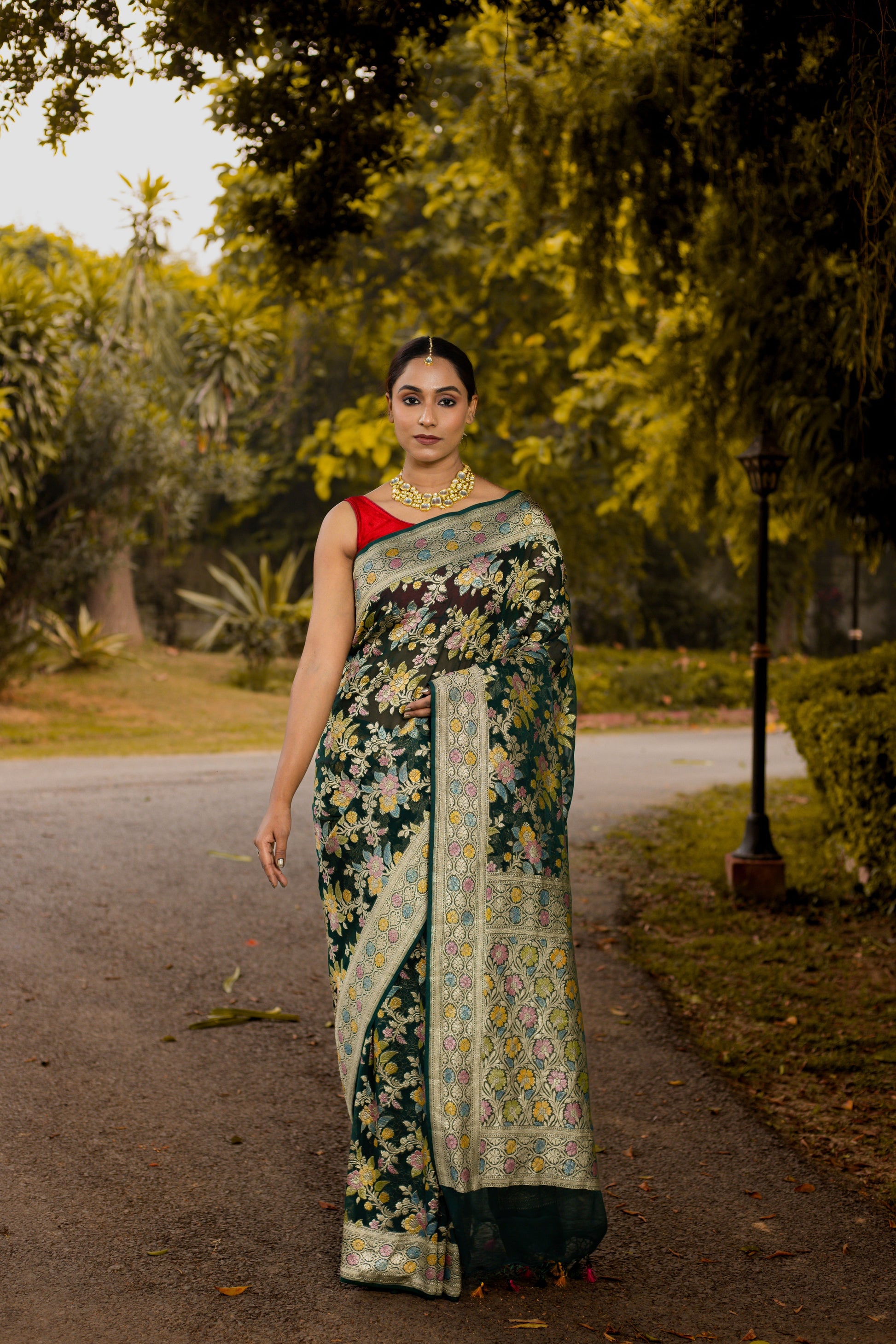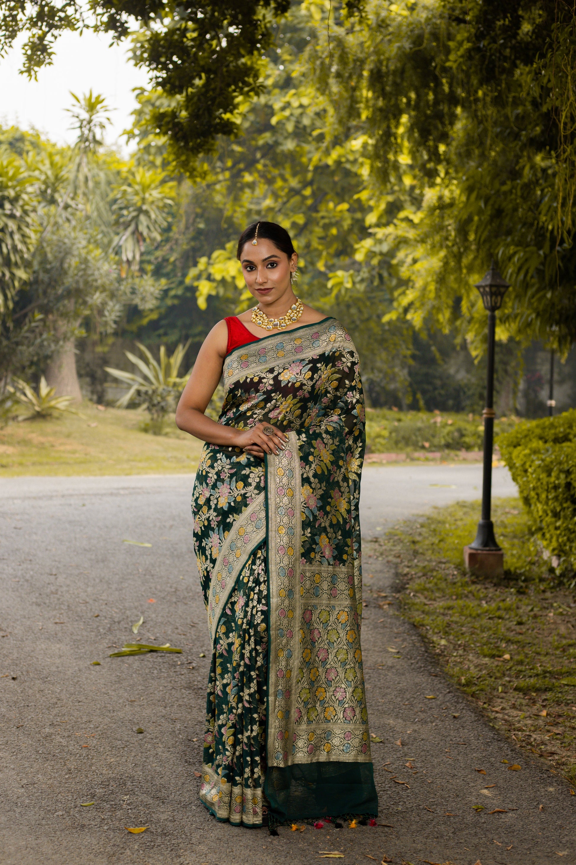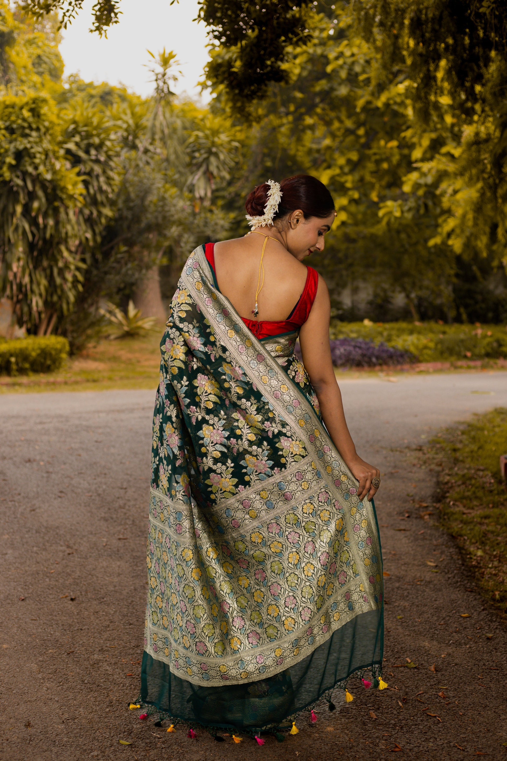 The Saree Georgette Khaddi Silk in Bottle Green is a symbol of grace and sophistication, making it an ideal choice for those who appreciate the delicate beauty of Banarasi handwoven sarees.