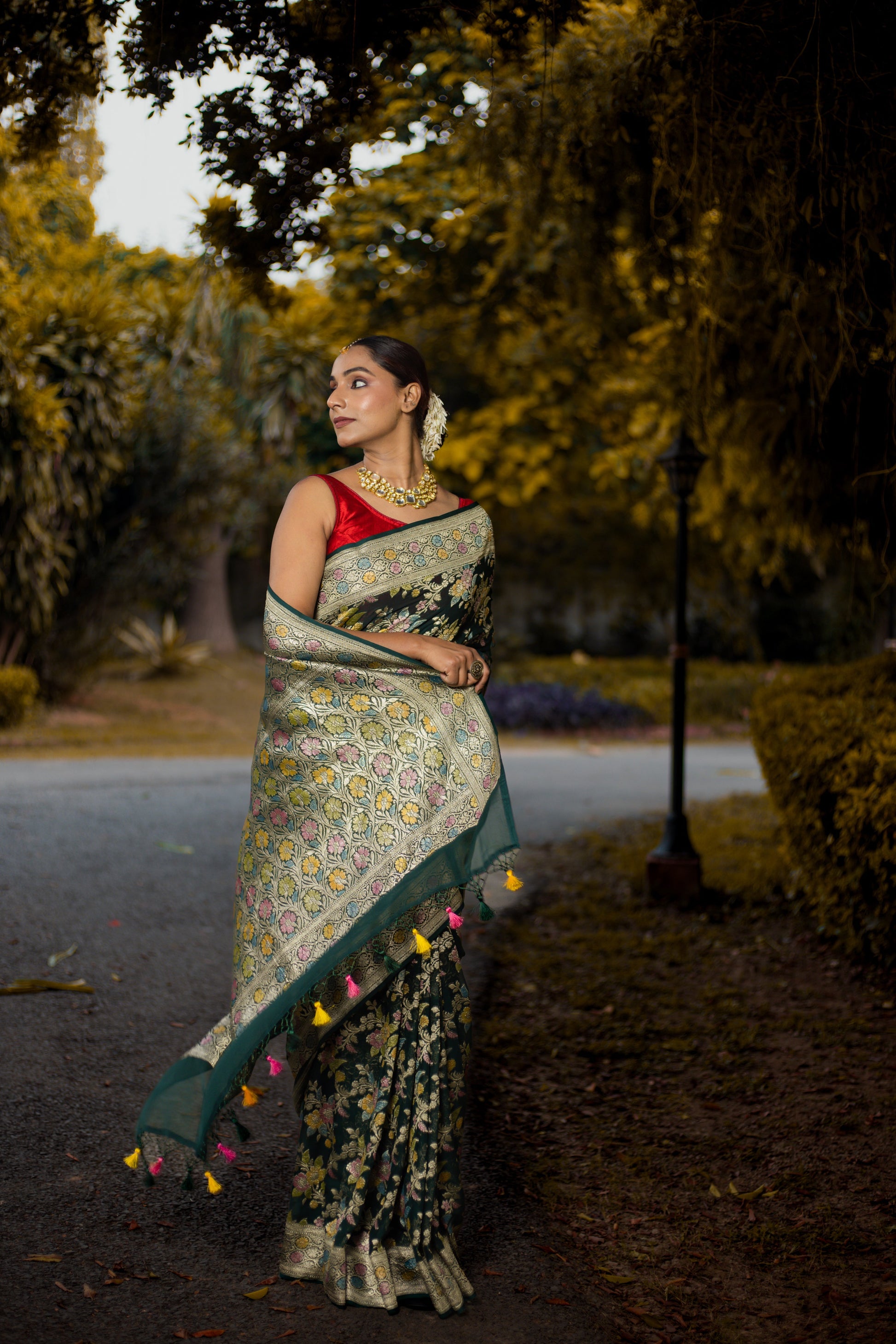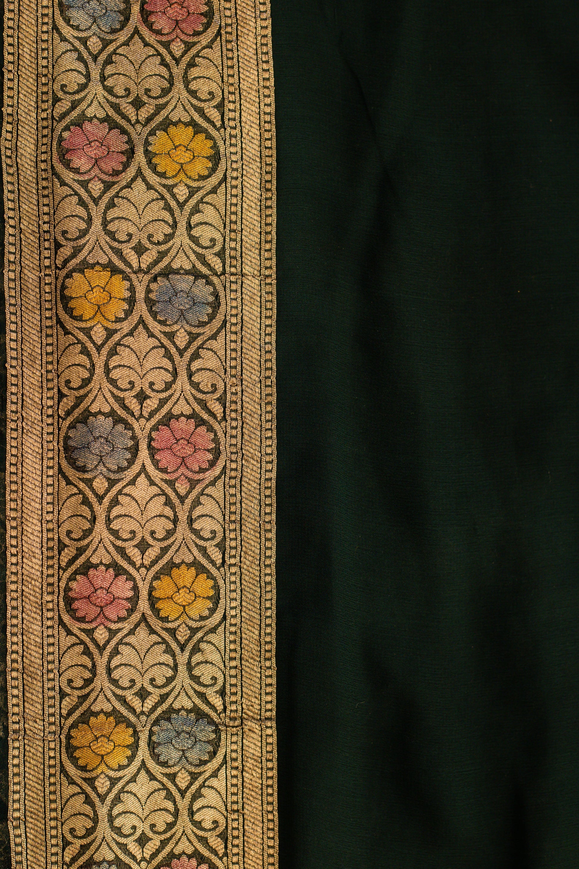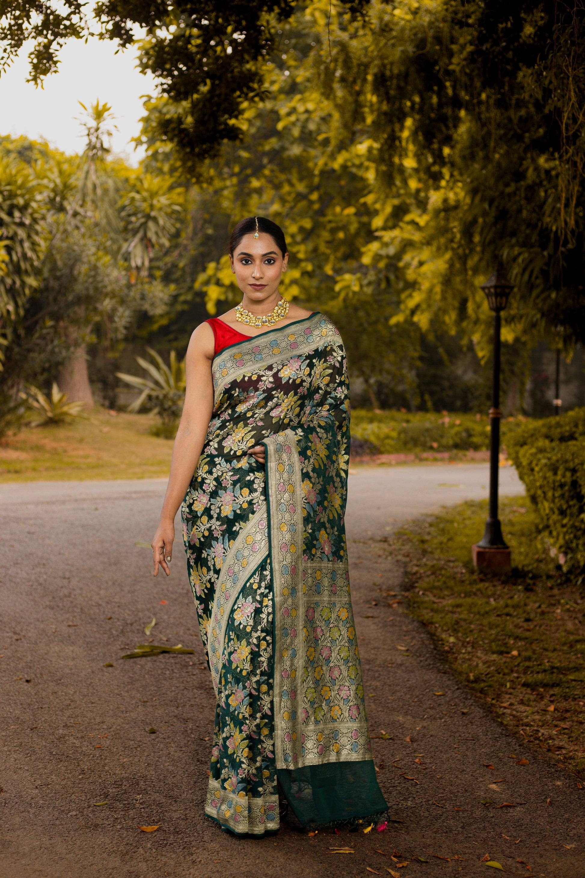 The Saree Georgette Khaddi Silk in Bottle Green is a symbol of grace and sophistication, making it an ideal choice for those who appreciate the delicate beauty of Banarasi handwoven sarees.