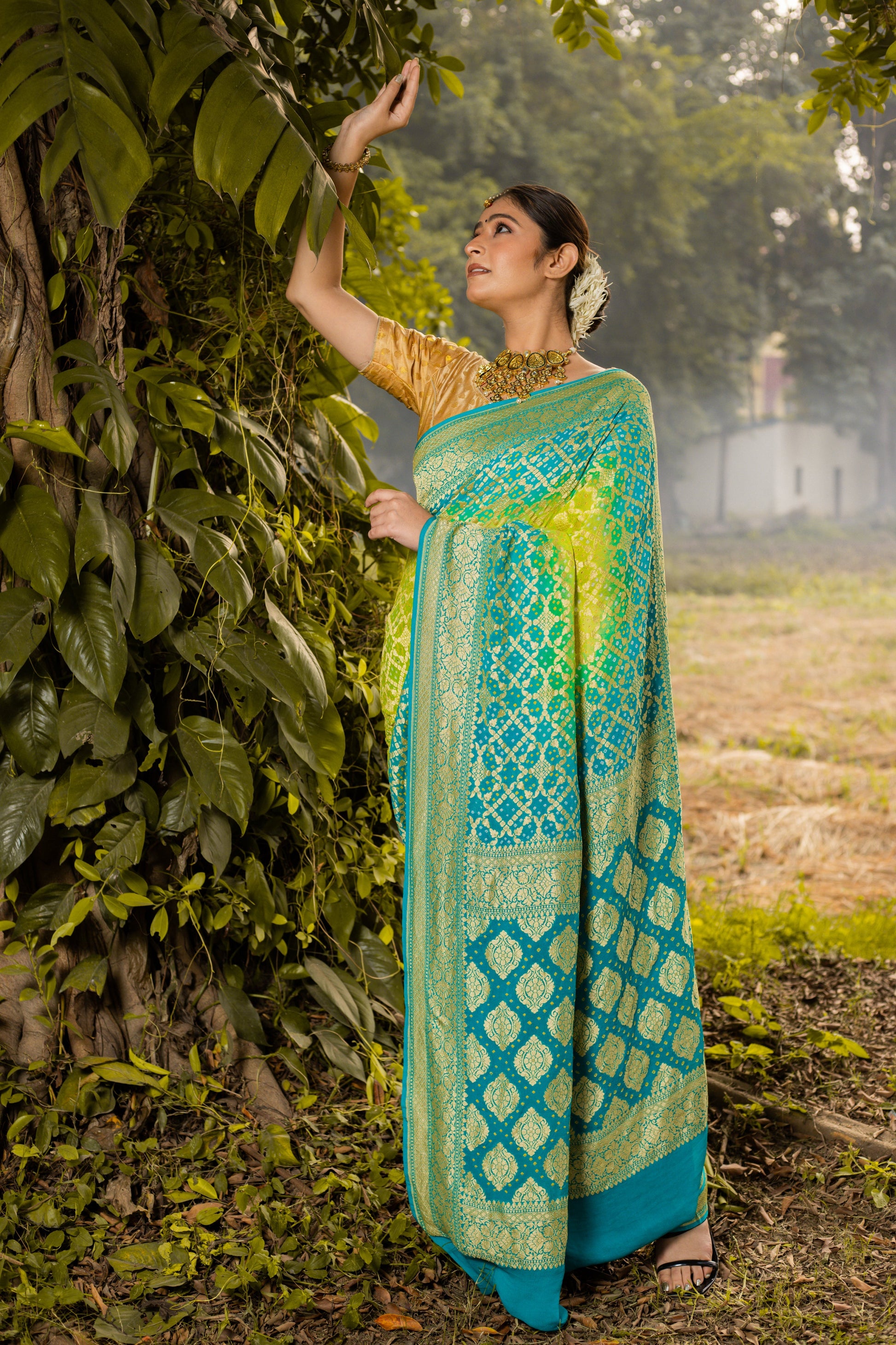 Product Description: Revel in the fresh allure of the Saree Georgette Silk Bandhani in Lime Green, a masterpiece meticulously crafted through the Handloom Banarasi weave technique. Classified under Cutwork, this saree features a stunning Jaal design with gold zari and intricate multi-color Bandhani work. The Lime Green hue and exquisite craftsmanship make it a lively and stylish choice for various occasions.