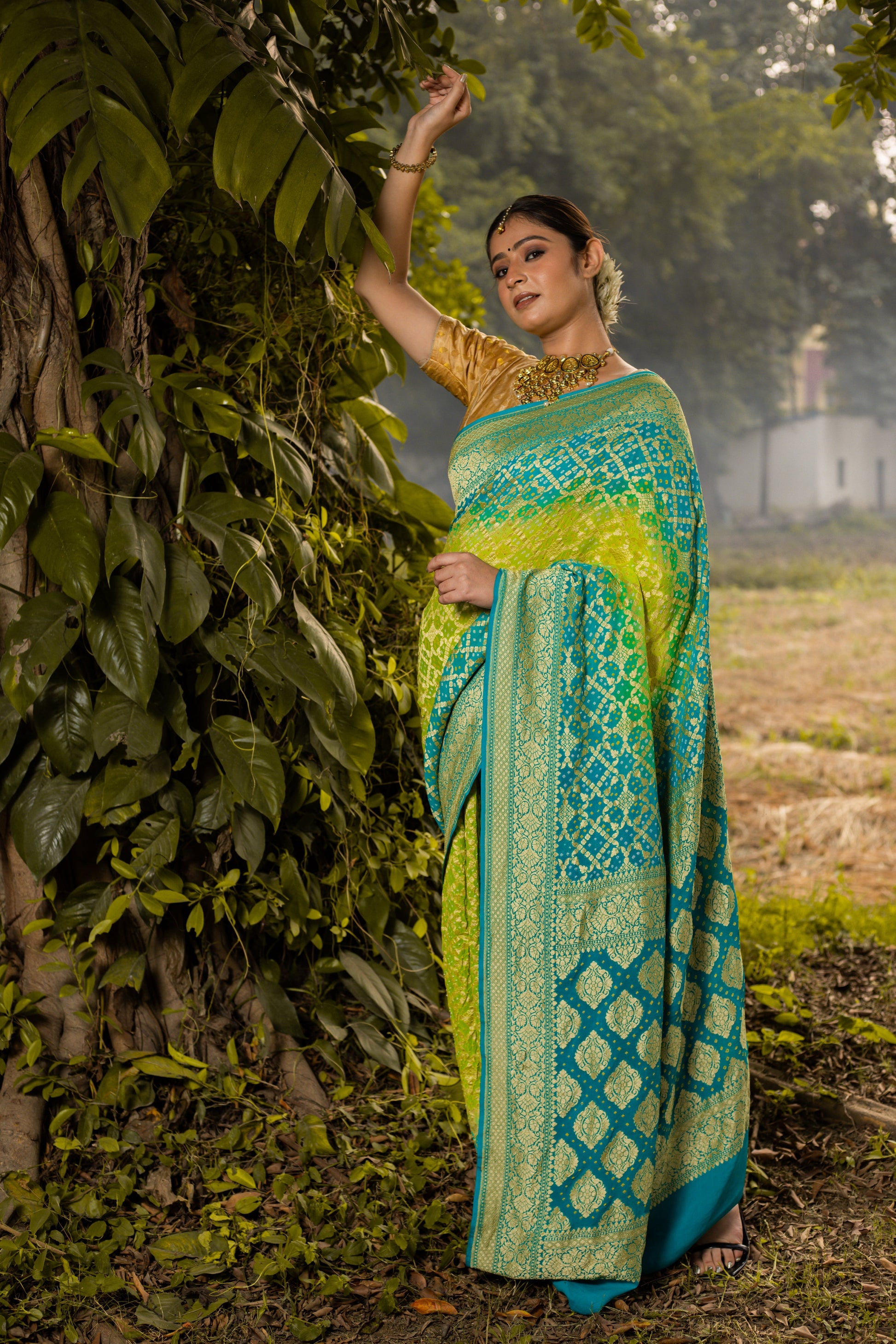 The Saree Georgette Silk Bandhani in Lime Green is a celebration of vibrant colors and traditional Bandhani artistry, making it an ideal choice for those who seek to embrace the richness of Banarasi handwoven sarees with a modern twist.