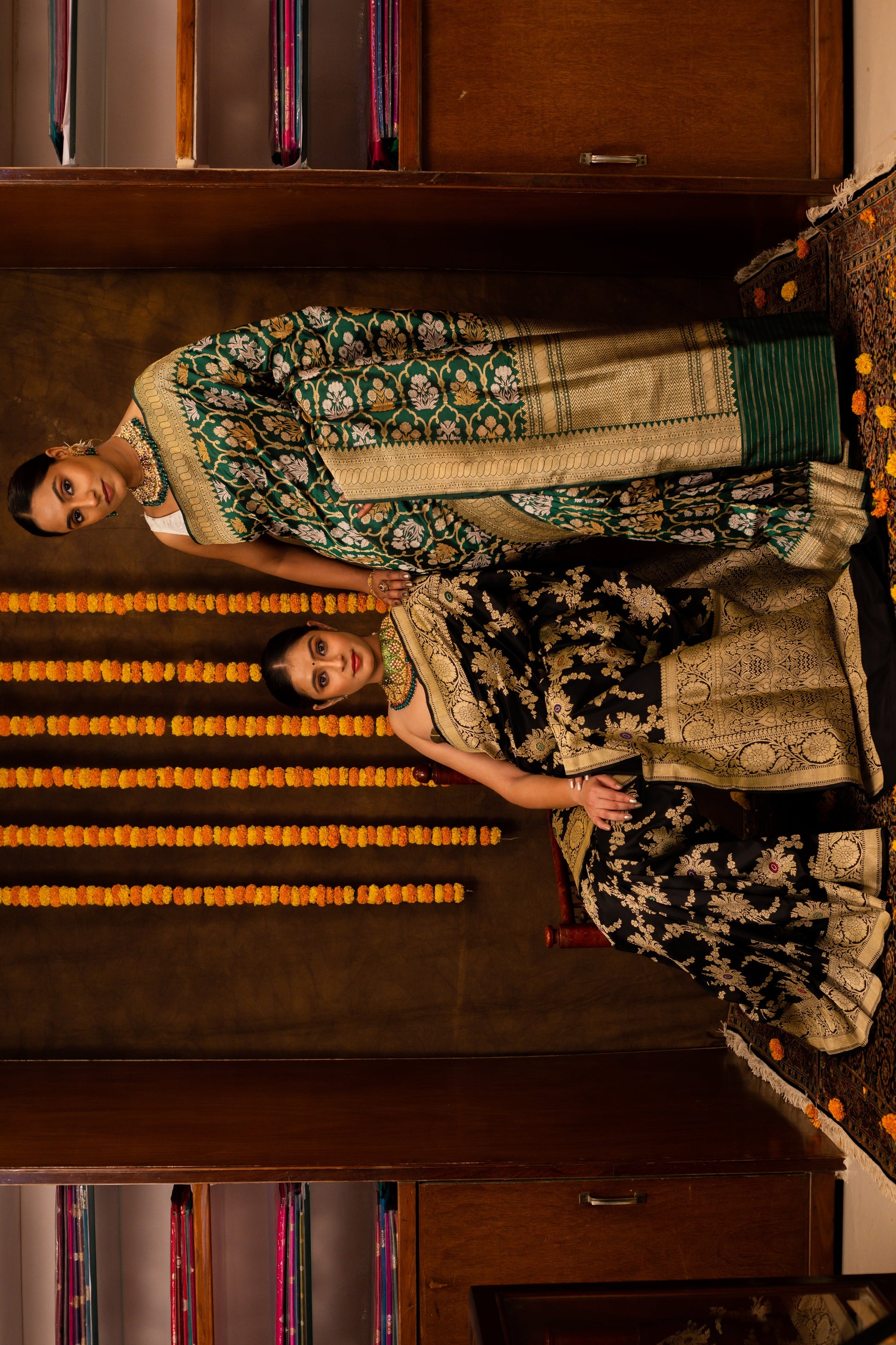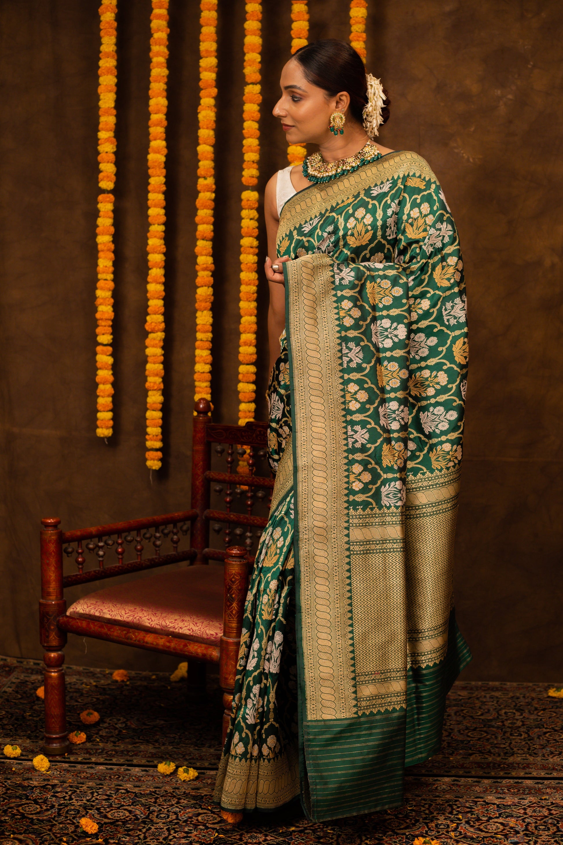 The Saree Katan Silk Handwoven in Green is a celebration of vibrant colors and intricate craftsmanship, making it an ideal choice for those who seek to embrace the richness of Banarasi handwoven sarees.