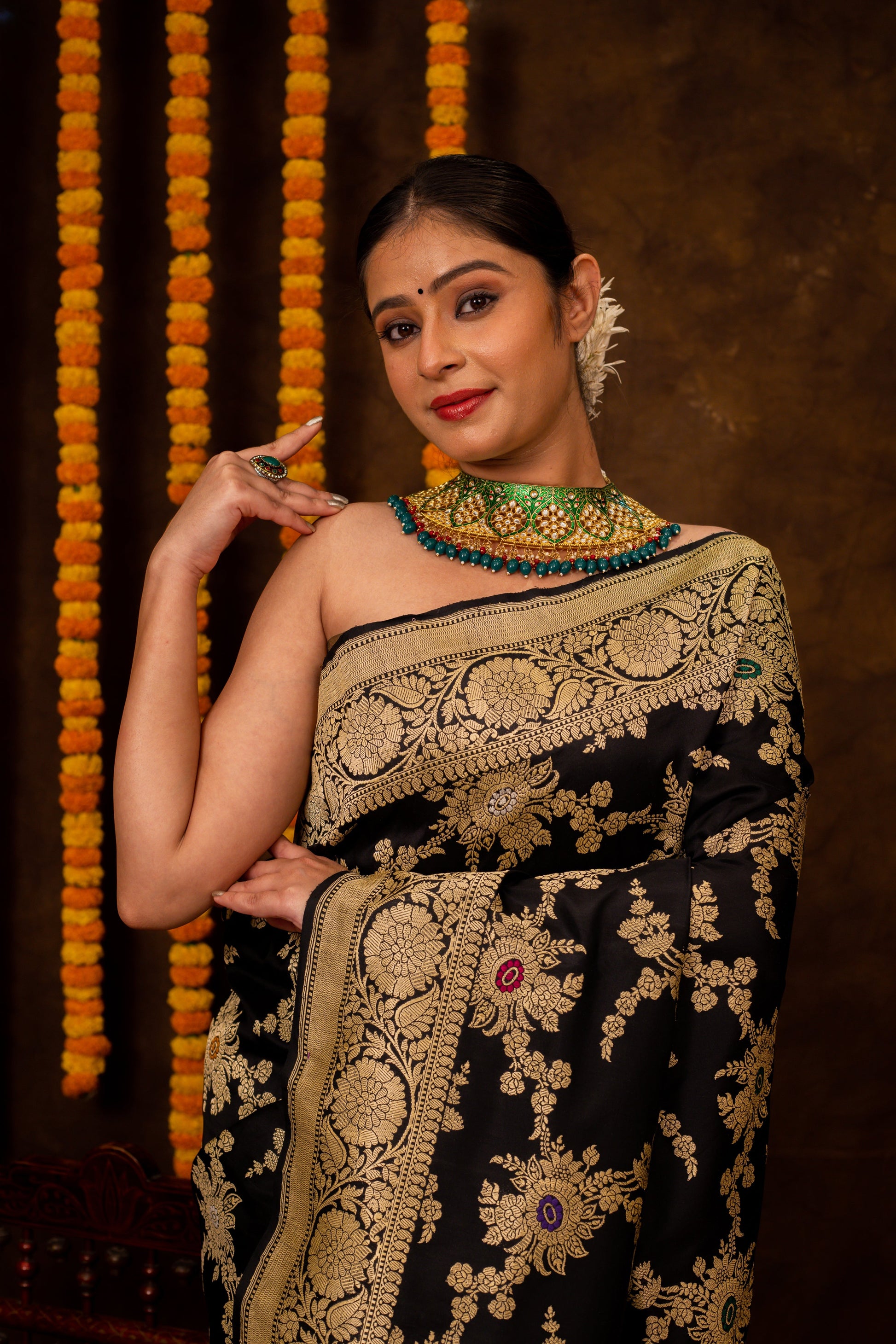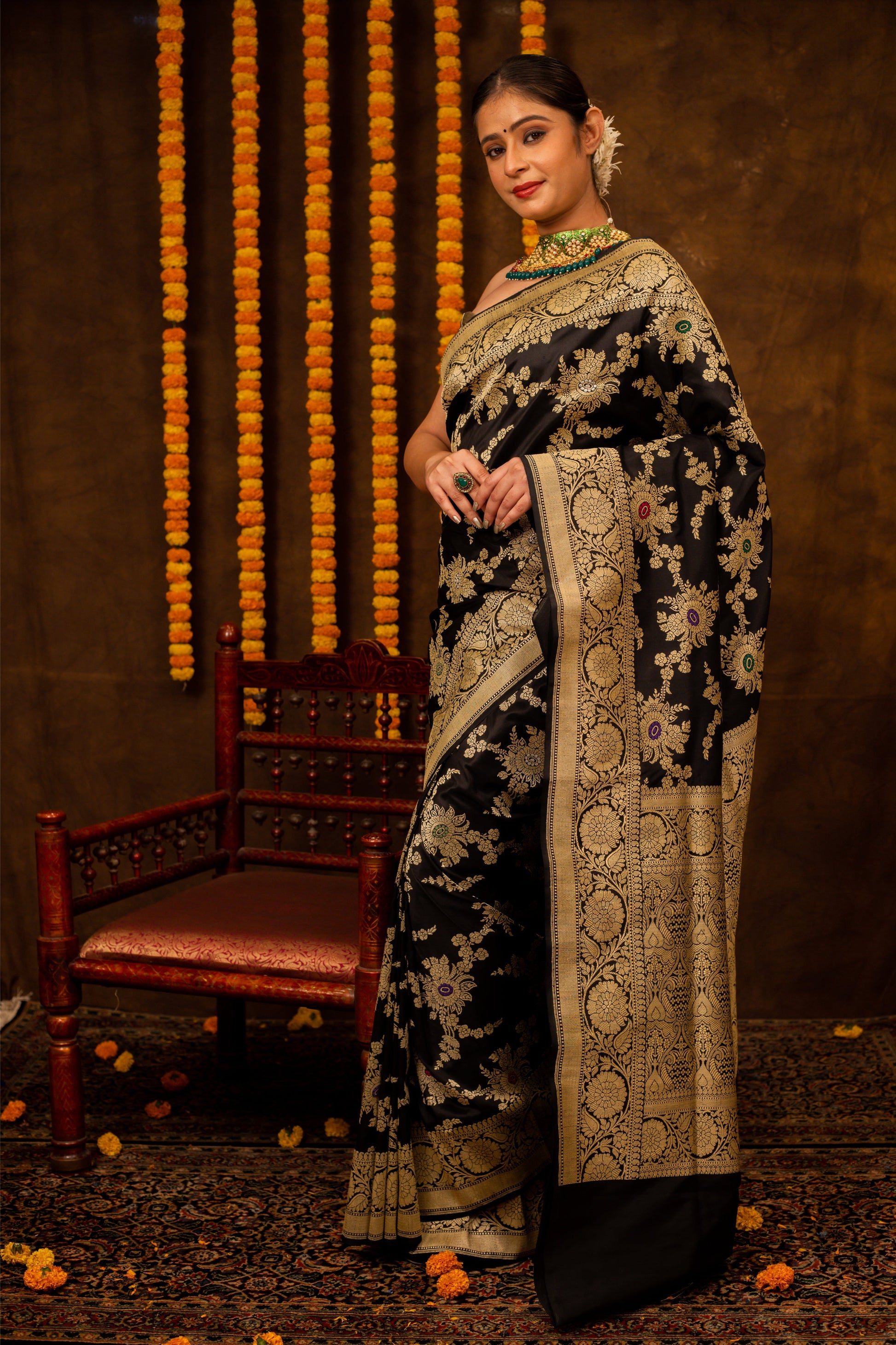 The Saree Katan Silk Handwoven in Black is a symbol of sophistication and traditional elegance, making it an ideal choice for those who seek to make a statement with the richness of Banarasi handwoven sarees.