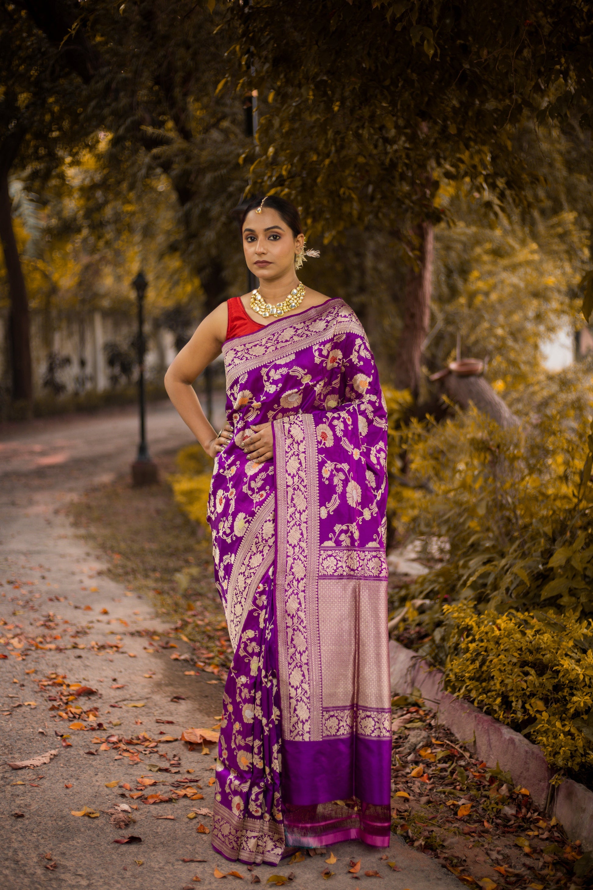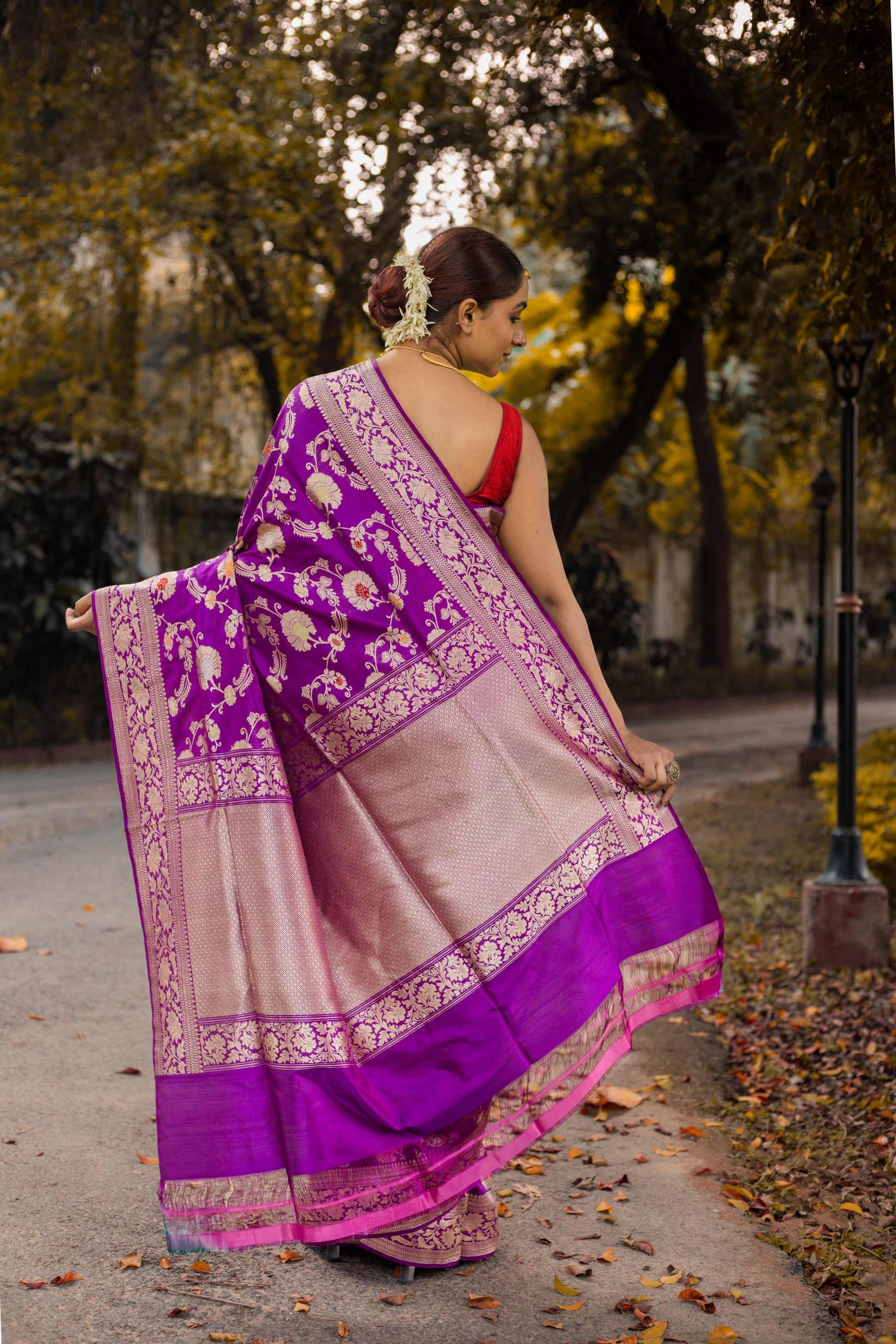The Saree Katan Silk Handwoven in Purple is a testament to the timeless beauty of Banarasi handwoven sarees, making it an exquisite choice for those who appreciate traditional craftsmanship and regal aesthetics.
