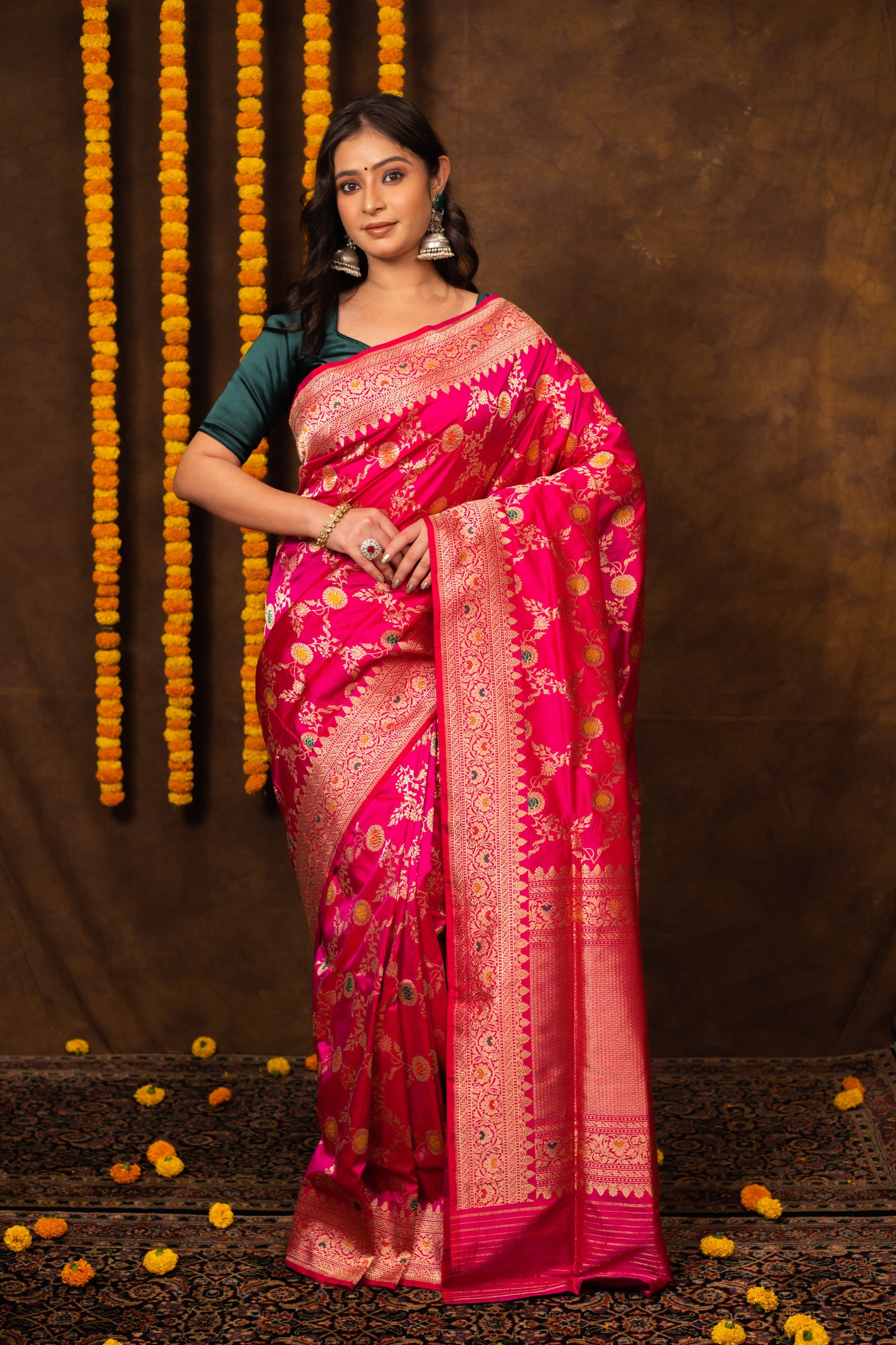 Product Description: Immerse yourself in the vibrant charm of the Saree Katan Silk Handwoven in Rani Pink, a masterpiece meticulously crafted through the Handloom Banarasi weave technique. Categorized under Kadwa, this saree features a captivating Jangla pattern adorned with floral motifs, intricate Meena work, and opulent Gold Zari detailing. Its rich Rani Pink color and exquisite craftsmanship make it a timeless symbol of traditional elegance.