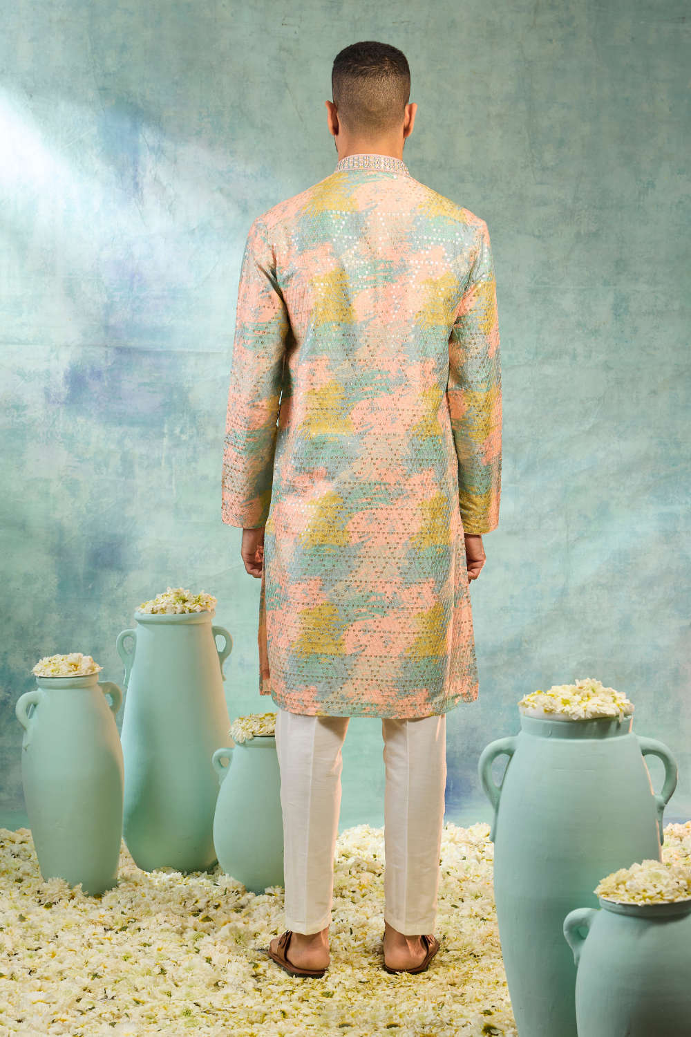 This sea blue silk kurta set exudes elegance with its delicate thread and sequin work, highlighted in soft peach and green hues. A perfect blend of traditional and contemporary style, it’s ideal for special occasions and festive celebrations.