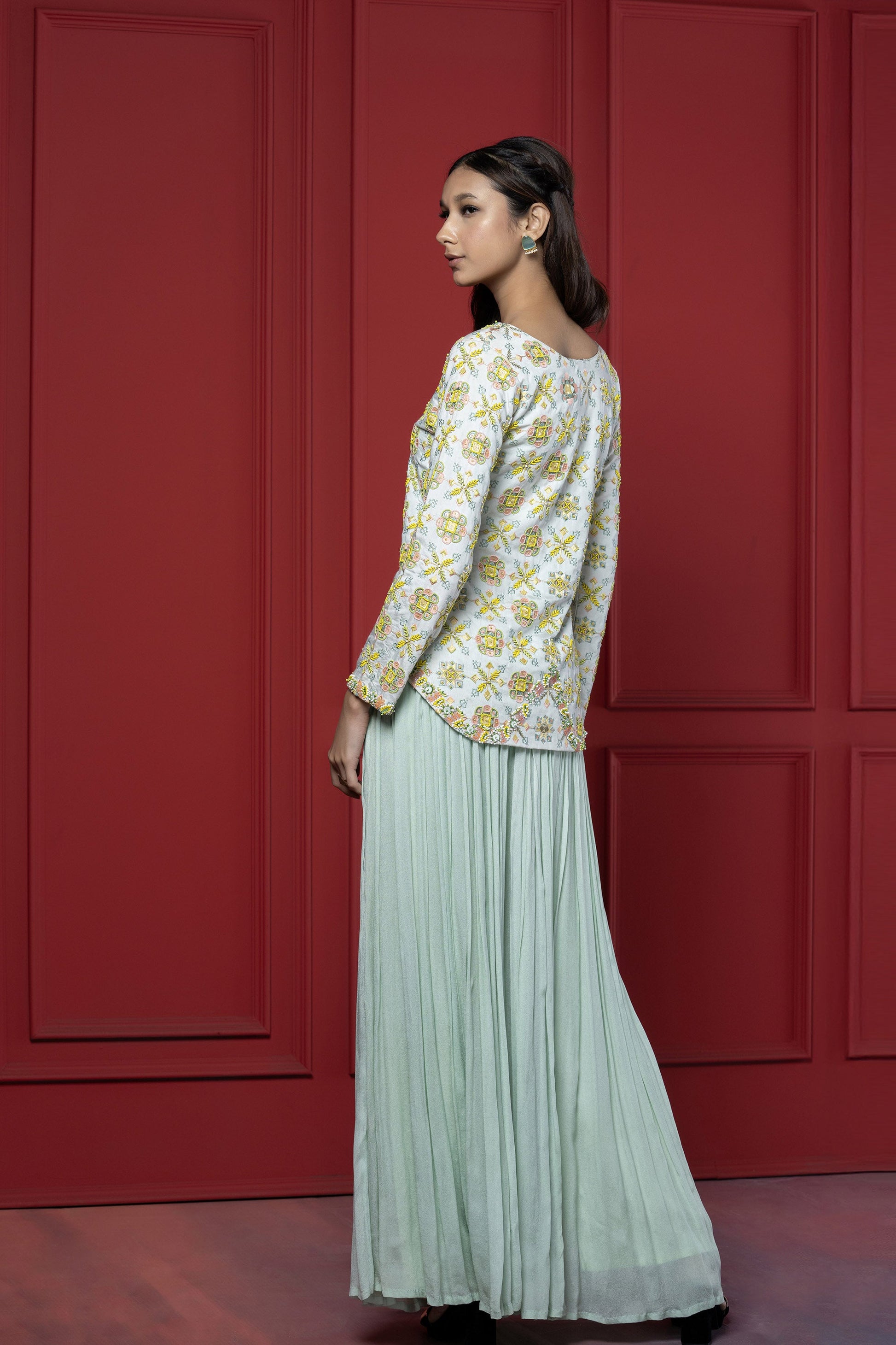 Textured Peplum top with a front cut that has added embellishments as handwork with plain pleated palazzo