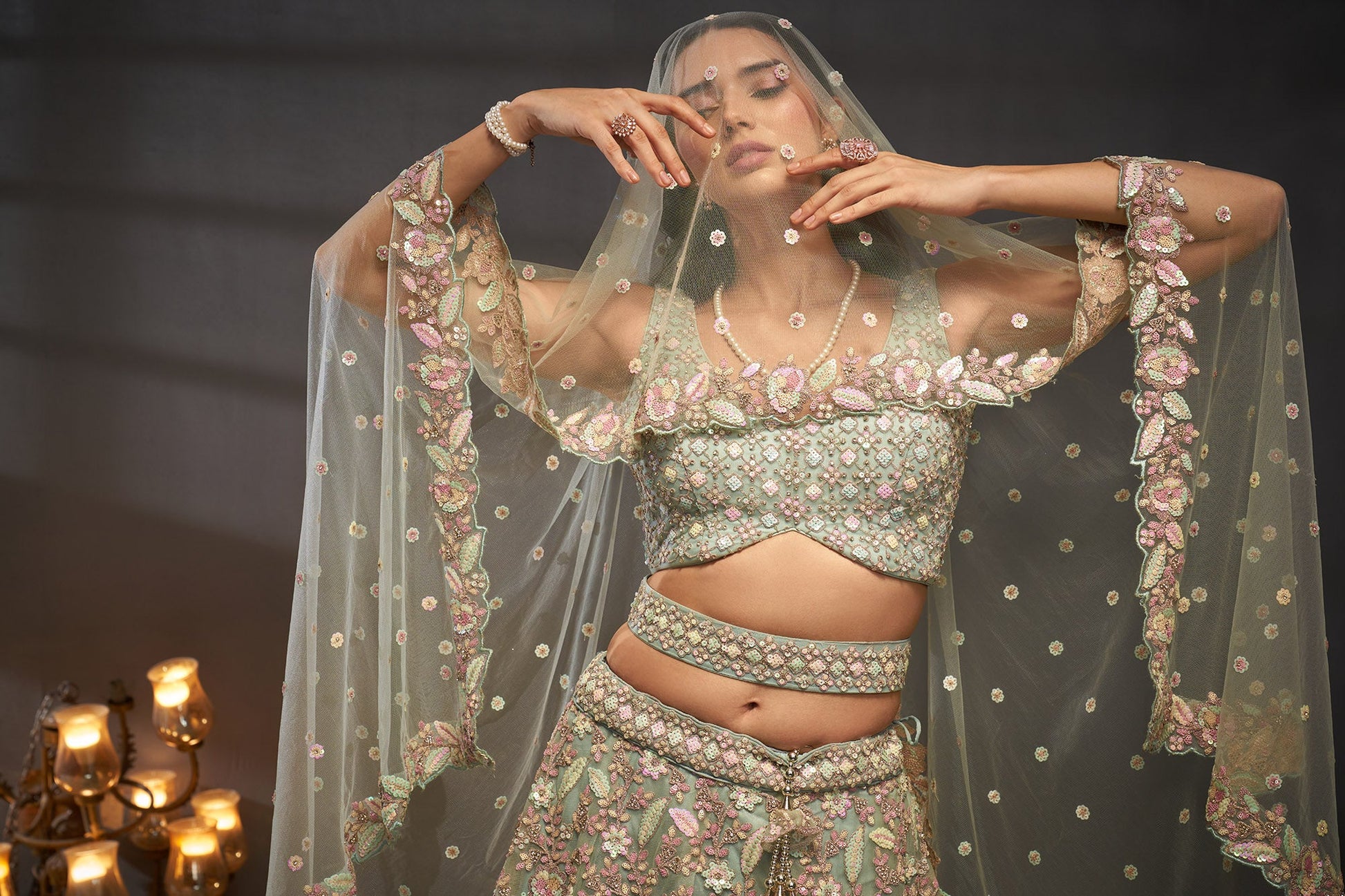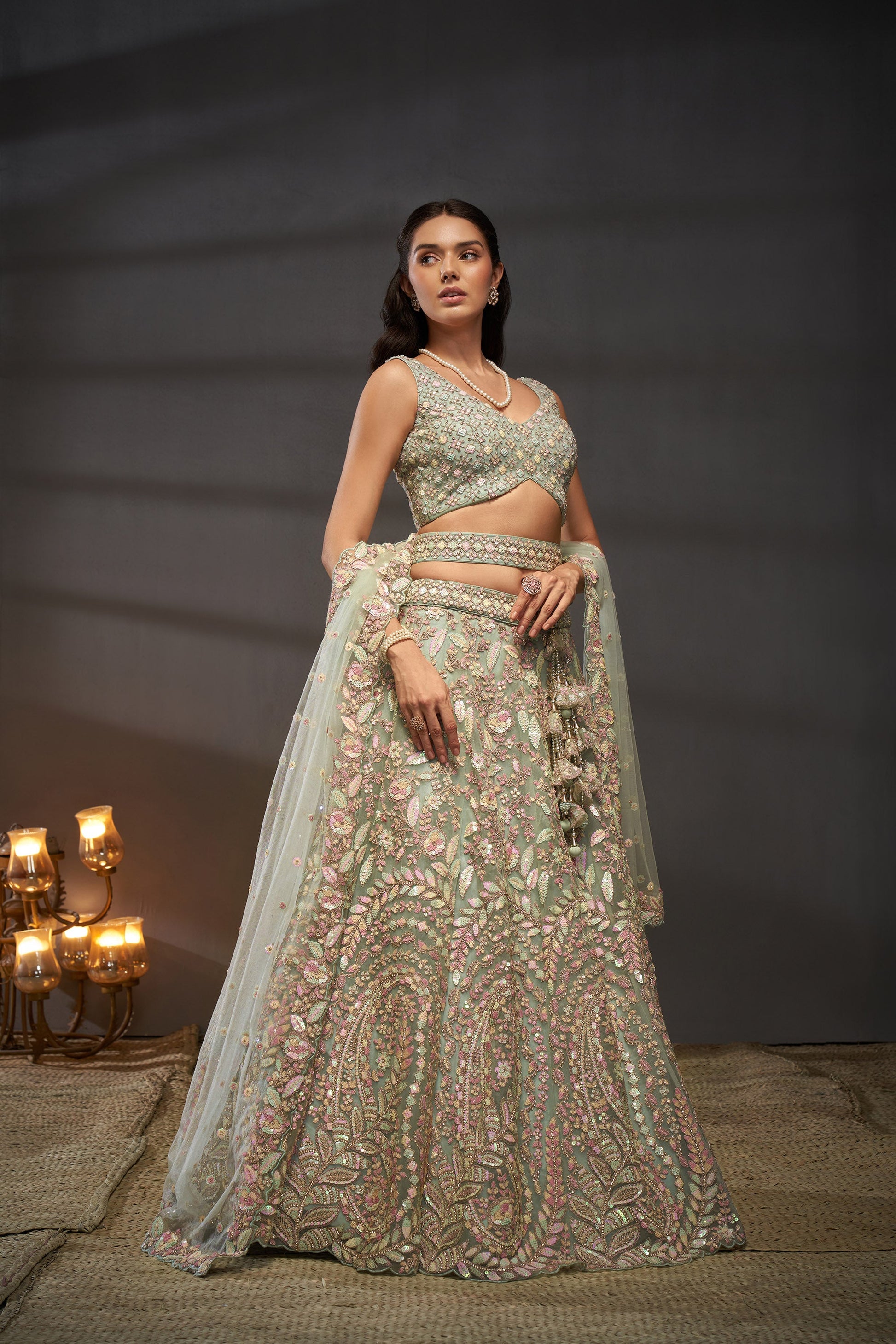 Sea Green Net Multi Zarkan embroidery Lehenga