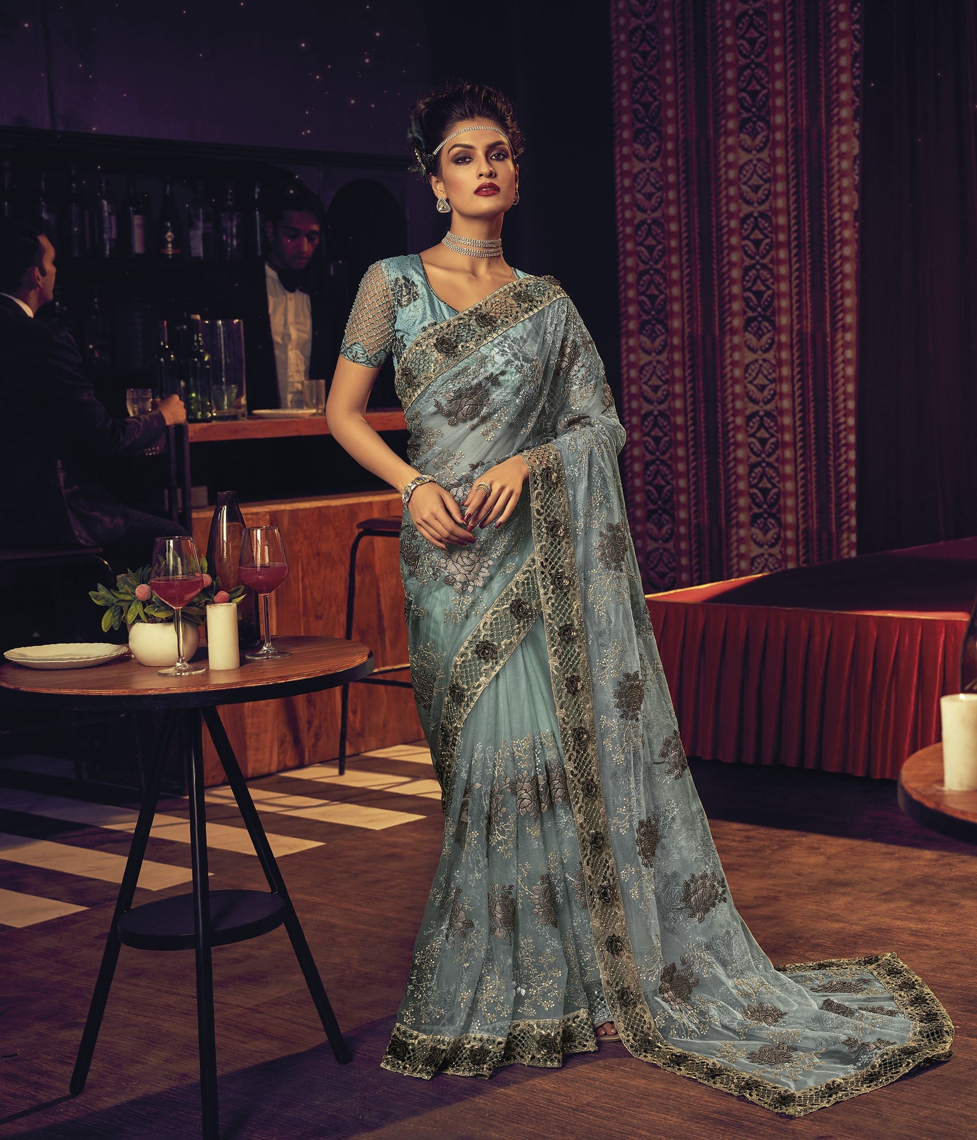 Sea Green Sequins Heavy Floral Embroidery Net Party Wear Saree