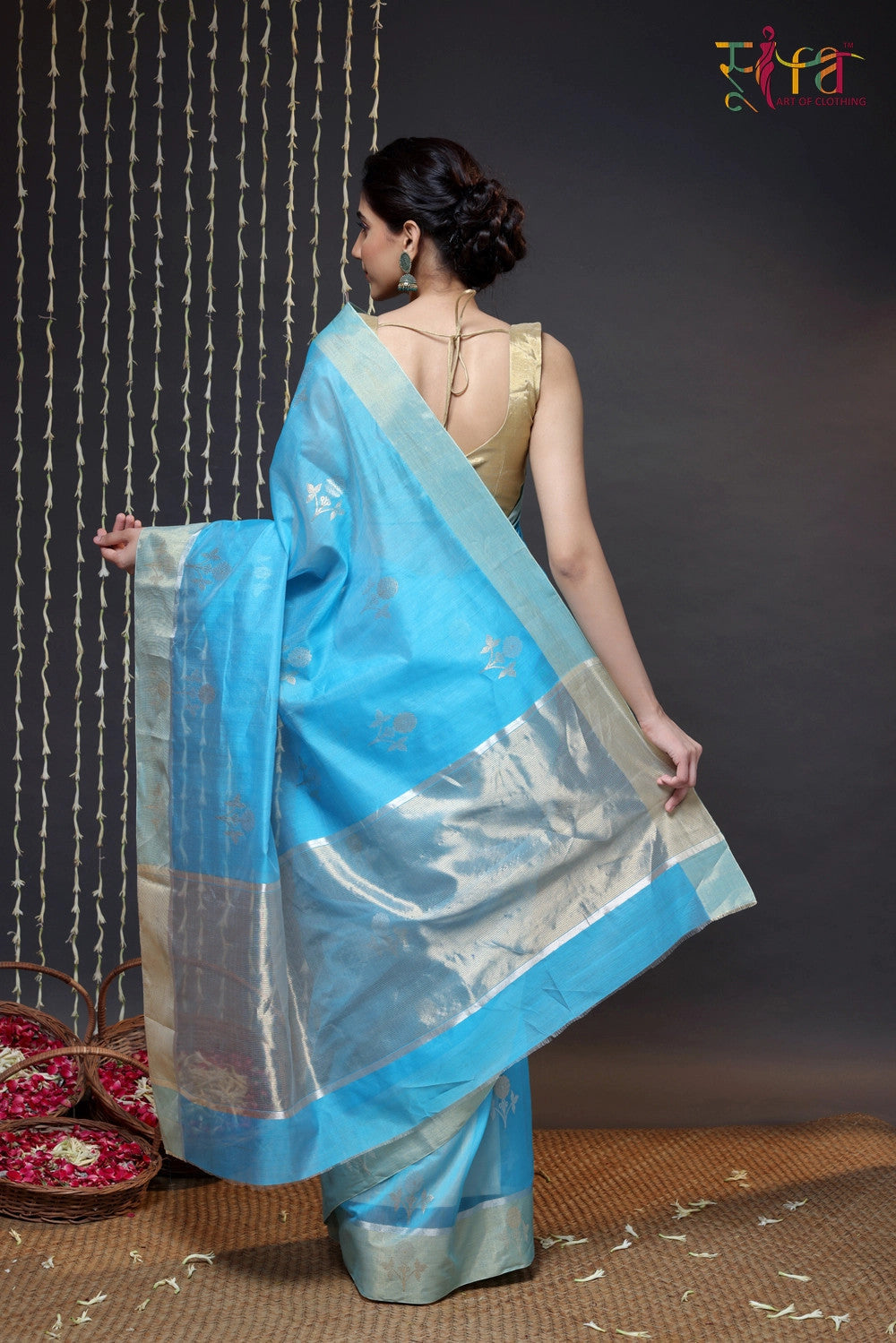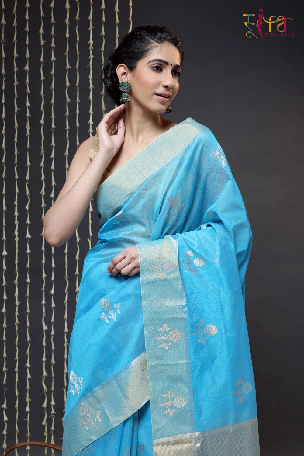 Sky Blue Handloom Chanderi Saree With Zari Floral Motifs