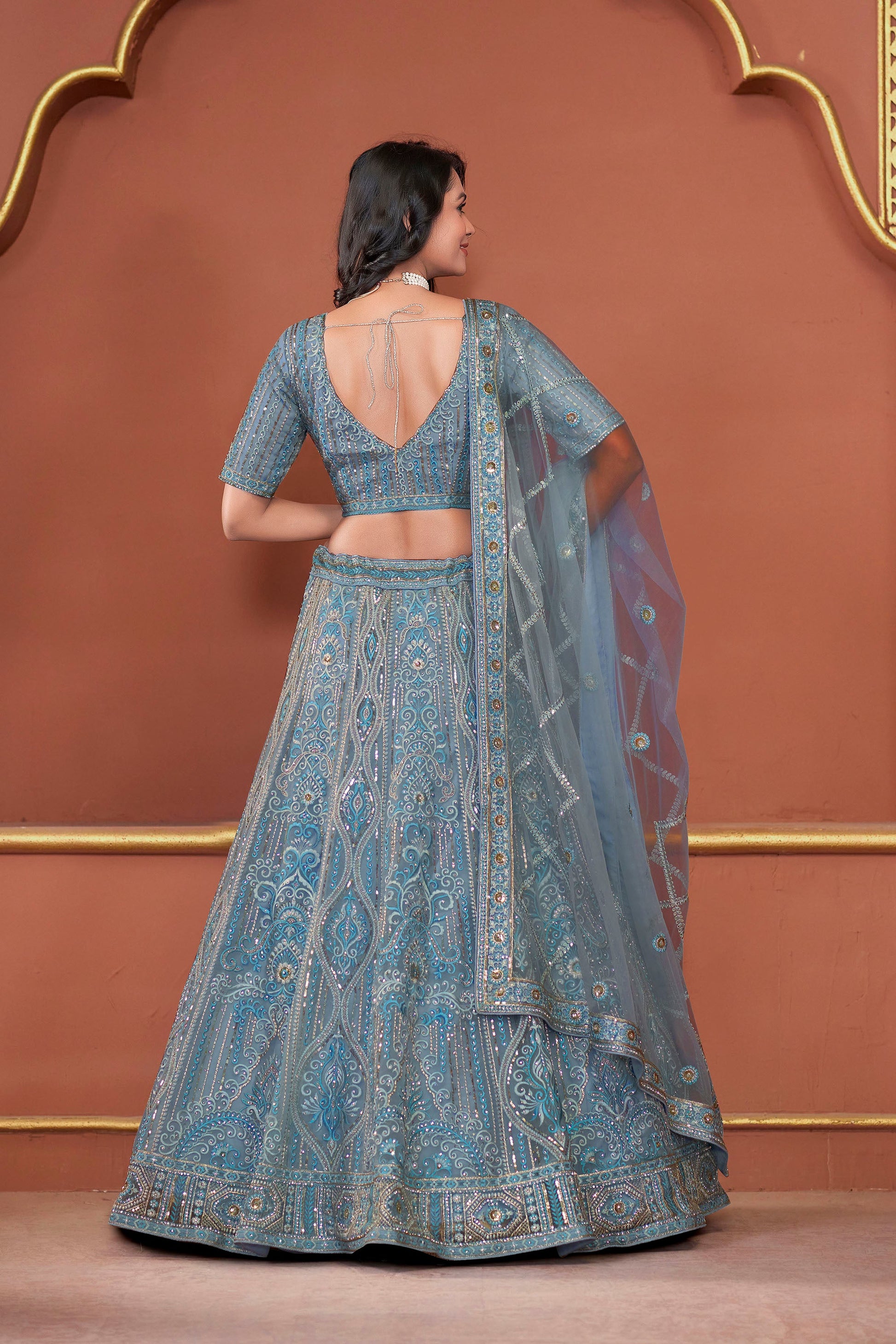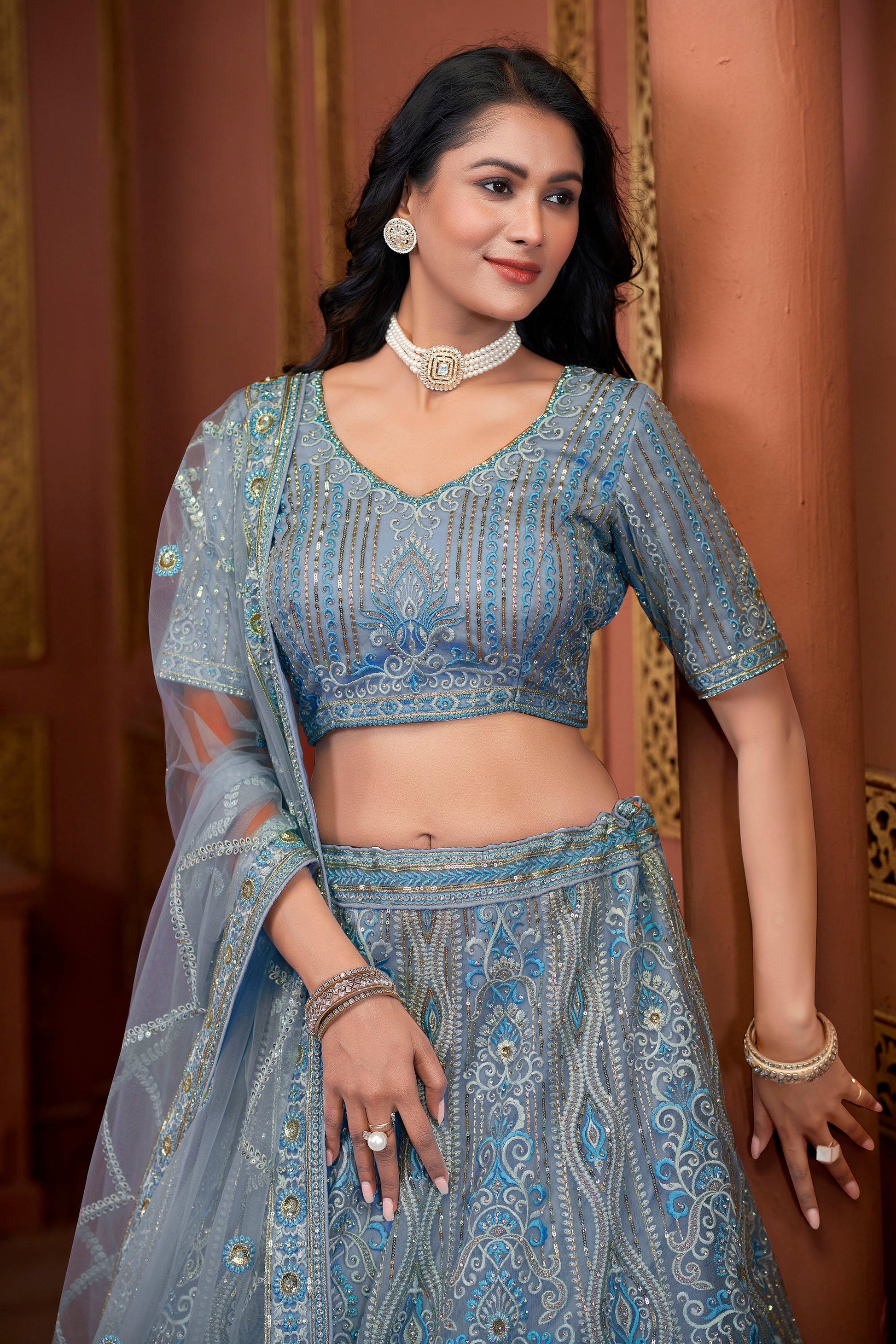 Are you seeking something exclusive? We've got what you require! This Sky Blue Zarkan Embroidery Net Festive Lehenga with its gorgeous zarkan embroidery and sky blue color is the perfect option for those seeking to make an impact. You will certainly be the center of attention in this lehenga if you wear it to a wedding , an engagement party, or a sangeet. Pictured here is a bridesmaid wearing the Sky Blue Zarkan Embroidery Net Festive Lehenga , which you can purchase today!
