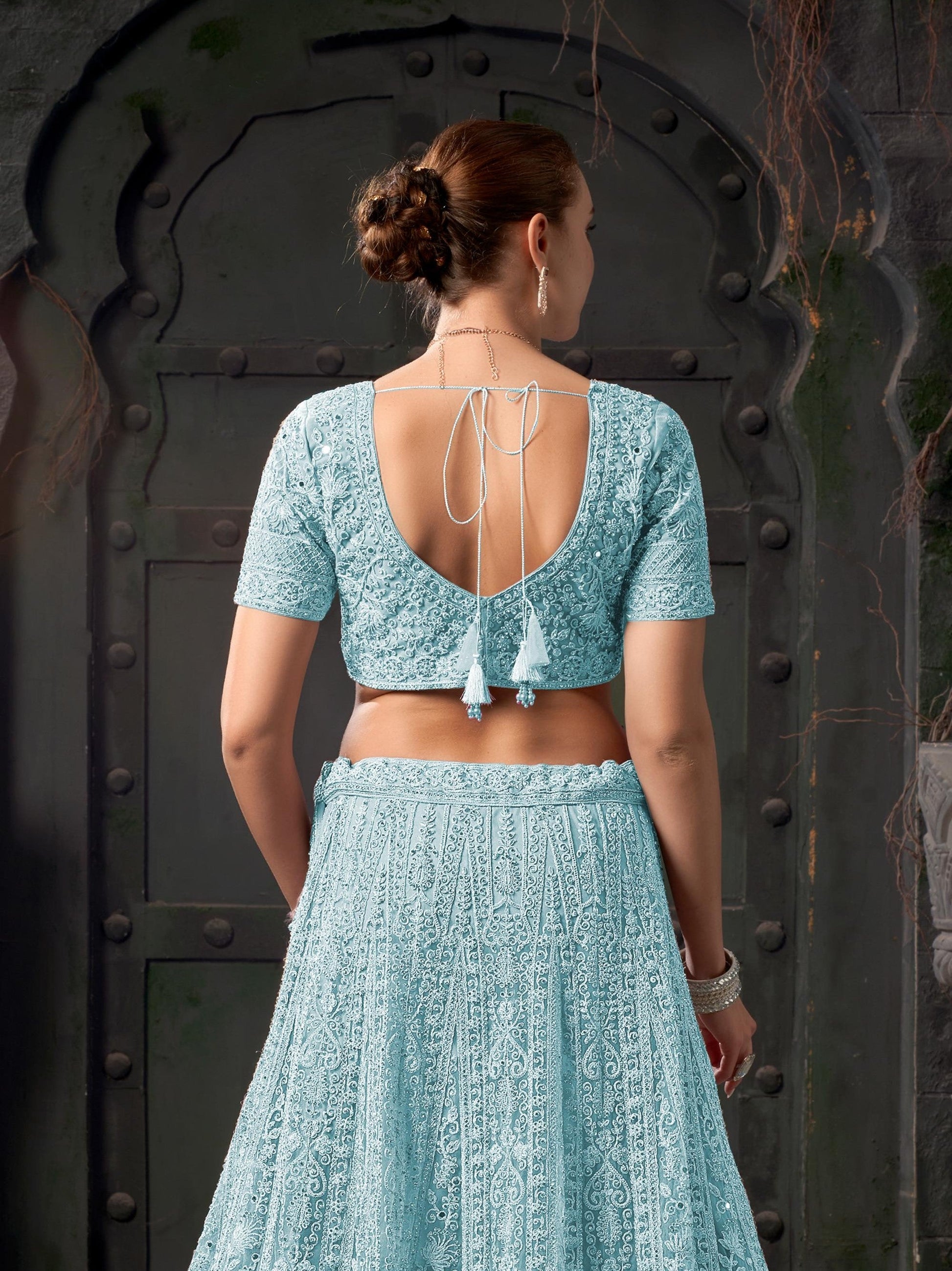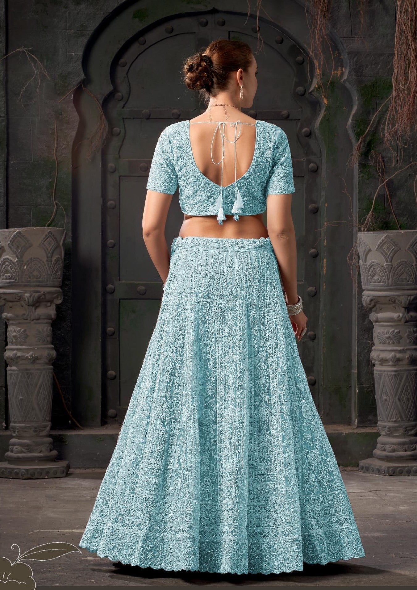 Sky Blue Zarkan Embroidery Net Party Wear Lehenga