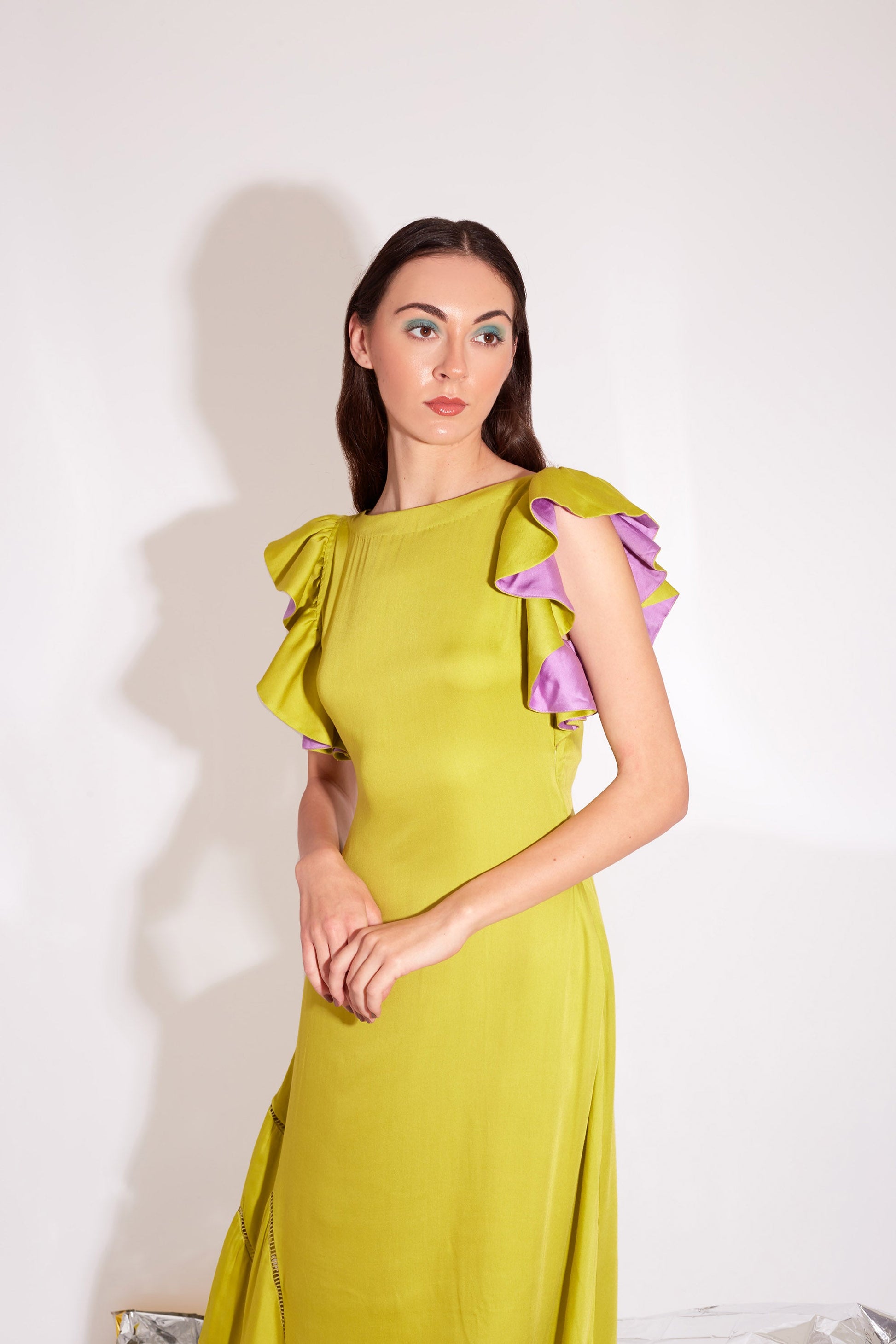 An asymmetric dress with color block ruffle sleeves, back lace detailing and a lace inert hem. Comes with a side zipper opening.