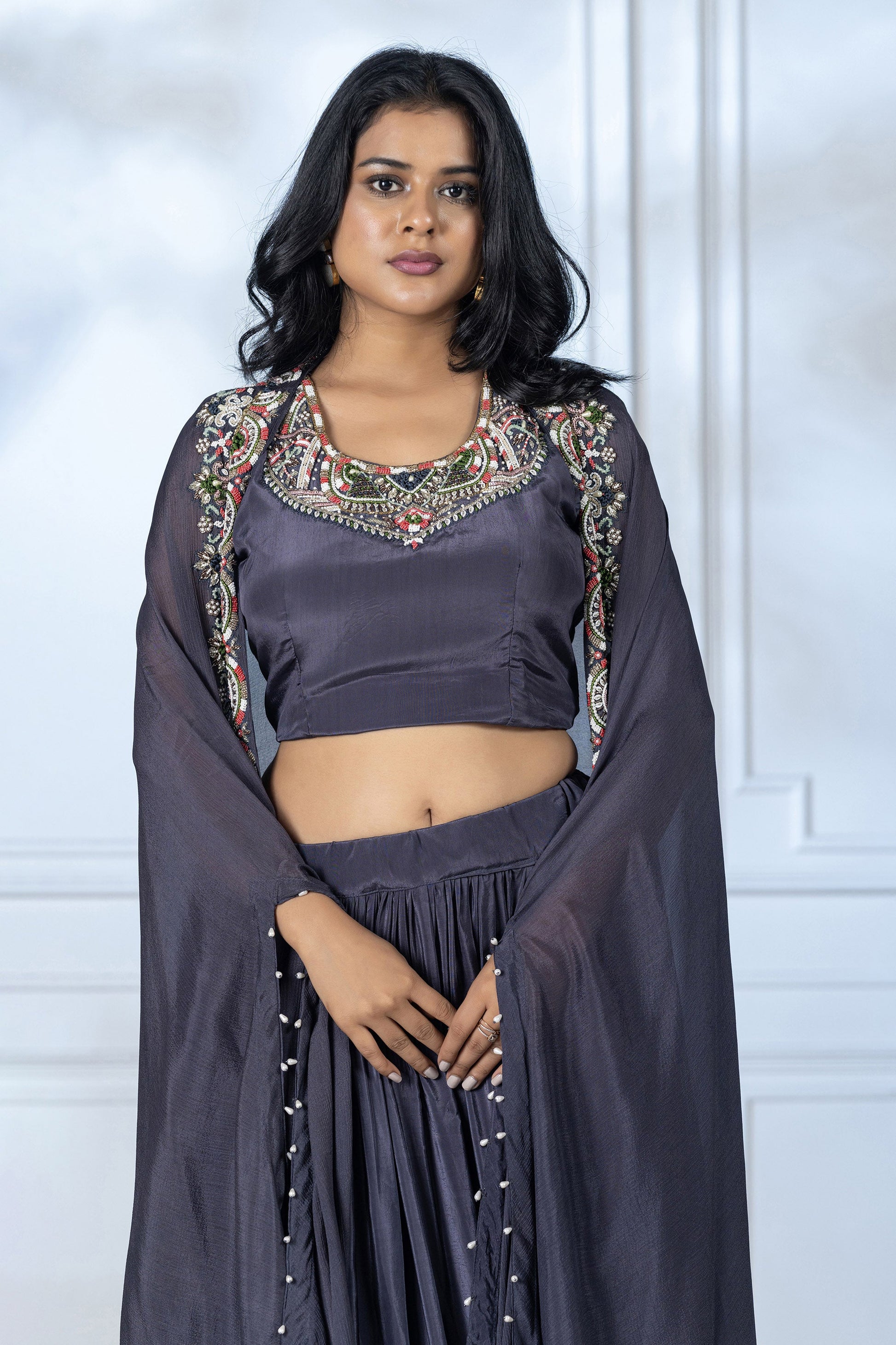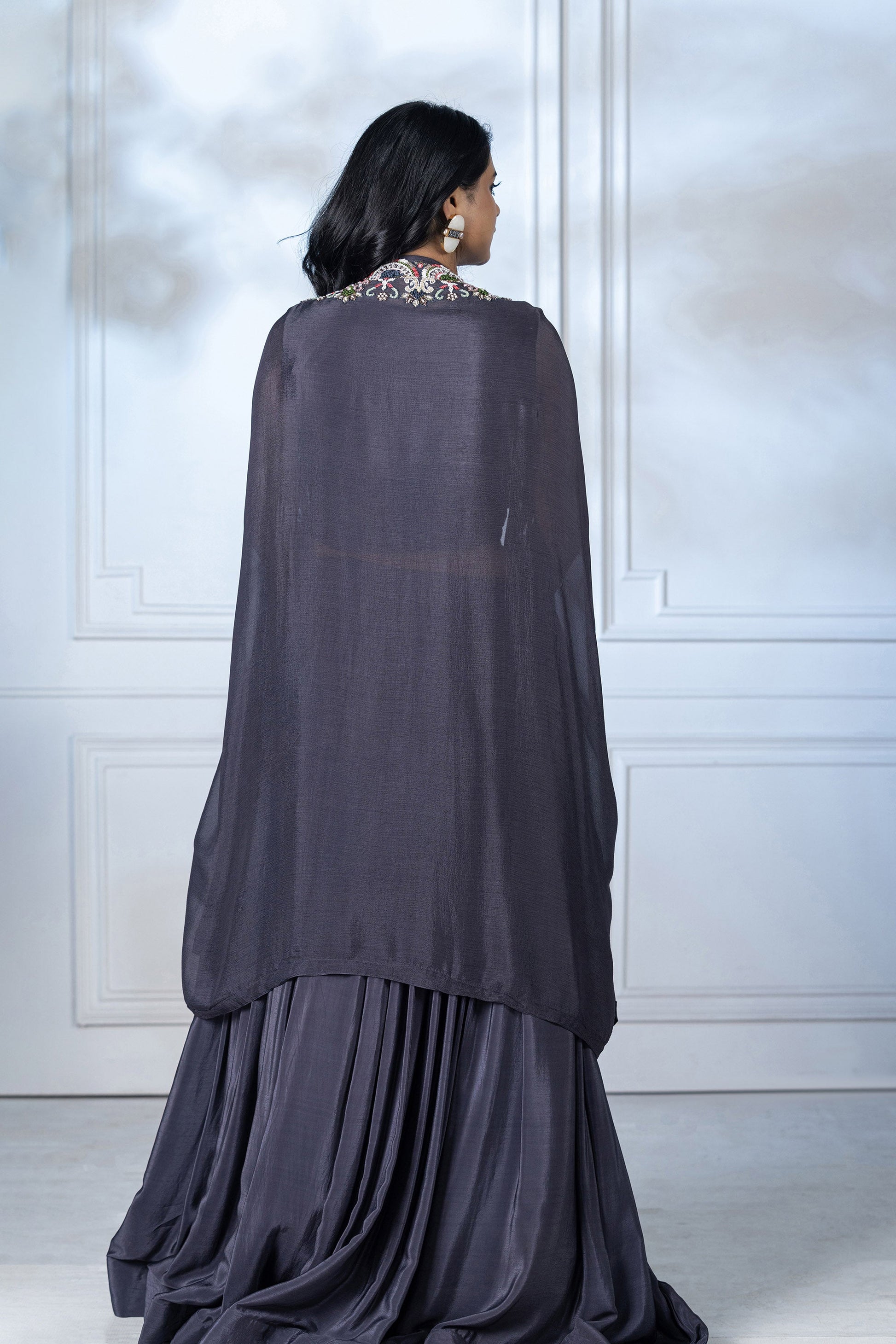Embroidered spaghetti with long cape with embroidered border & pleated skirt