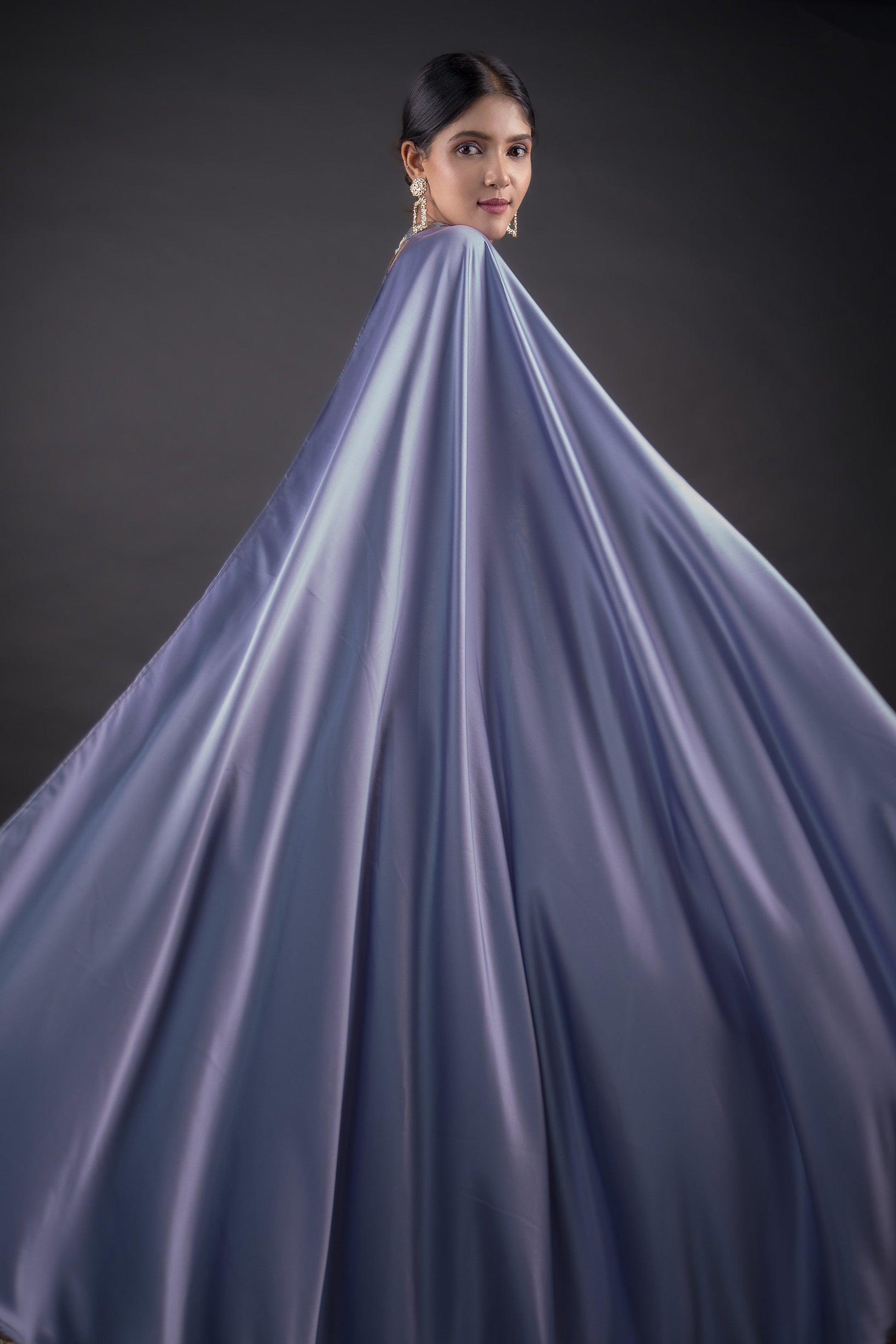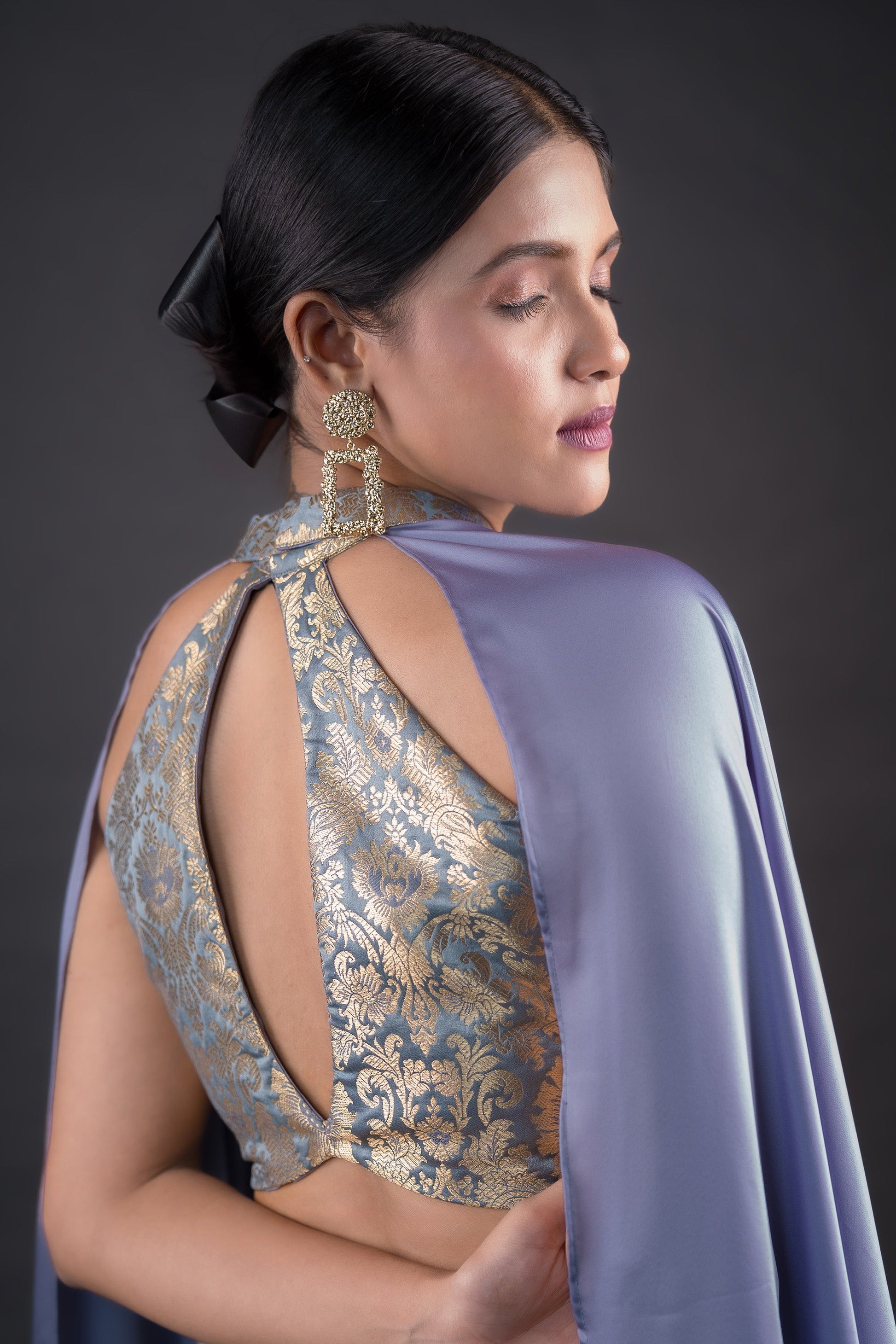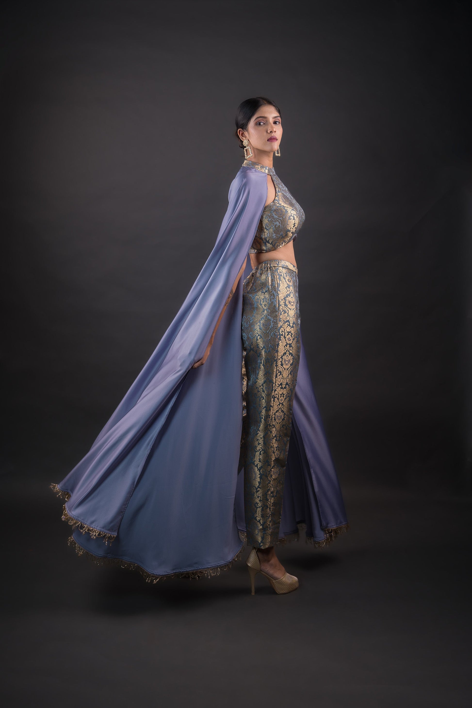 Steel grey ideal brocade crop top paired with Cigar pants with the detachable cape sleeves