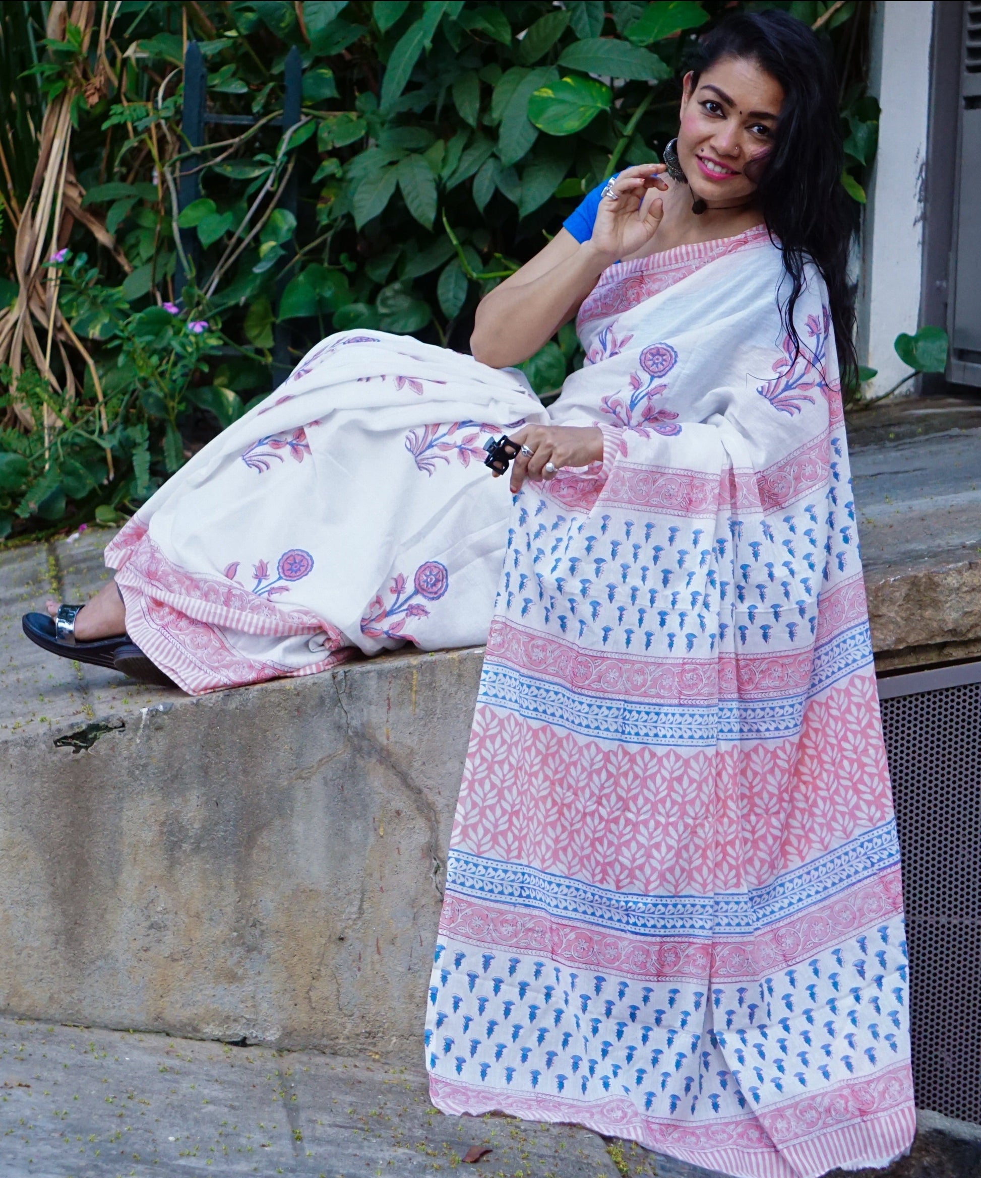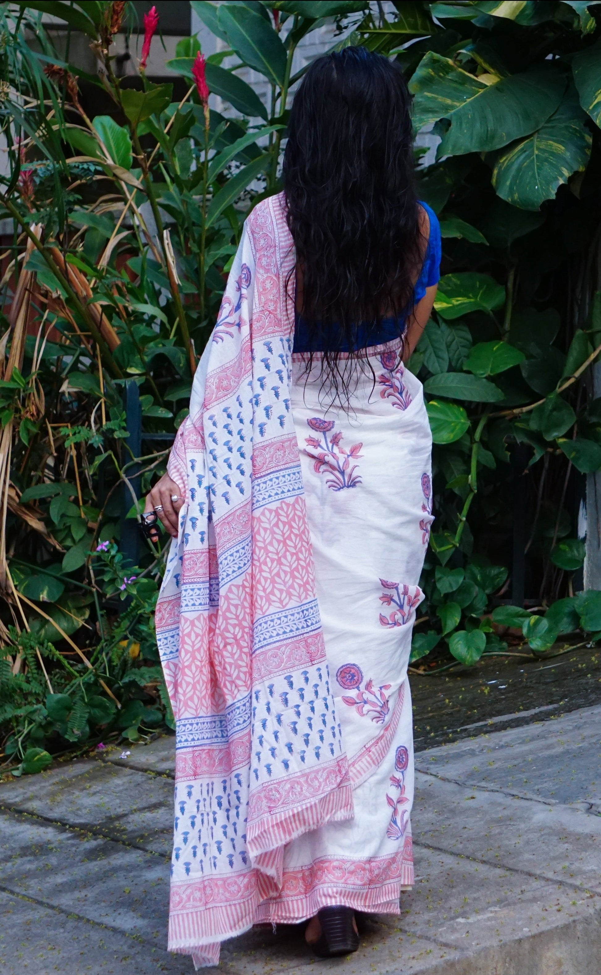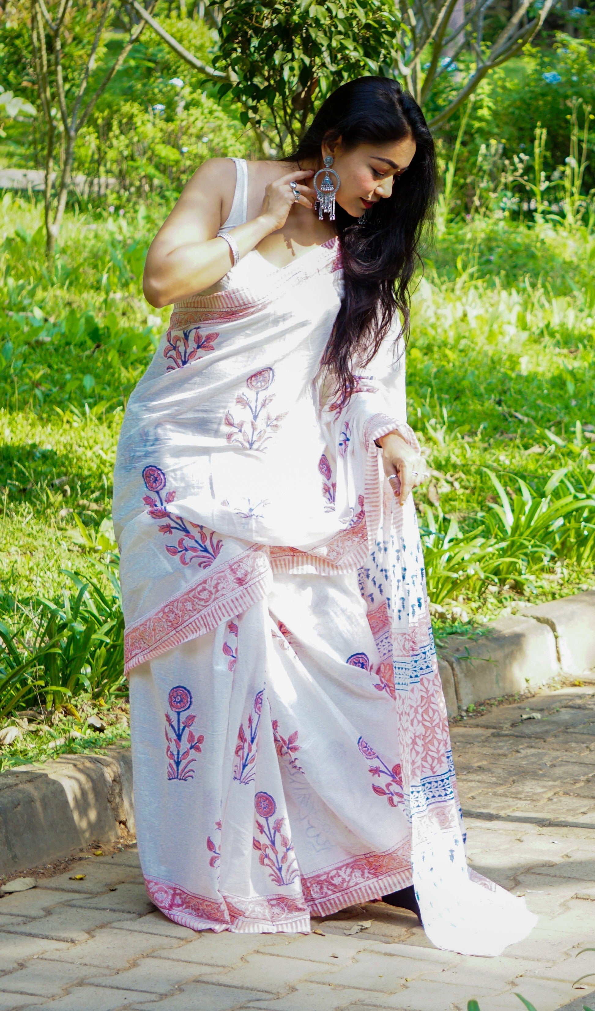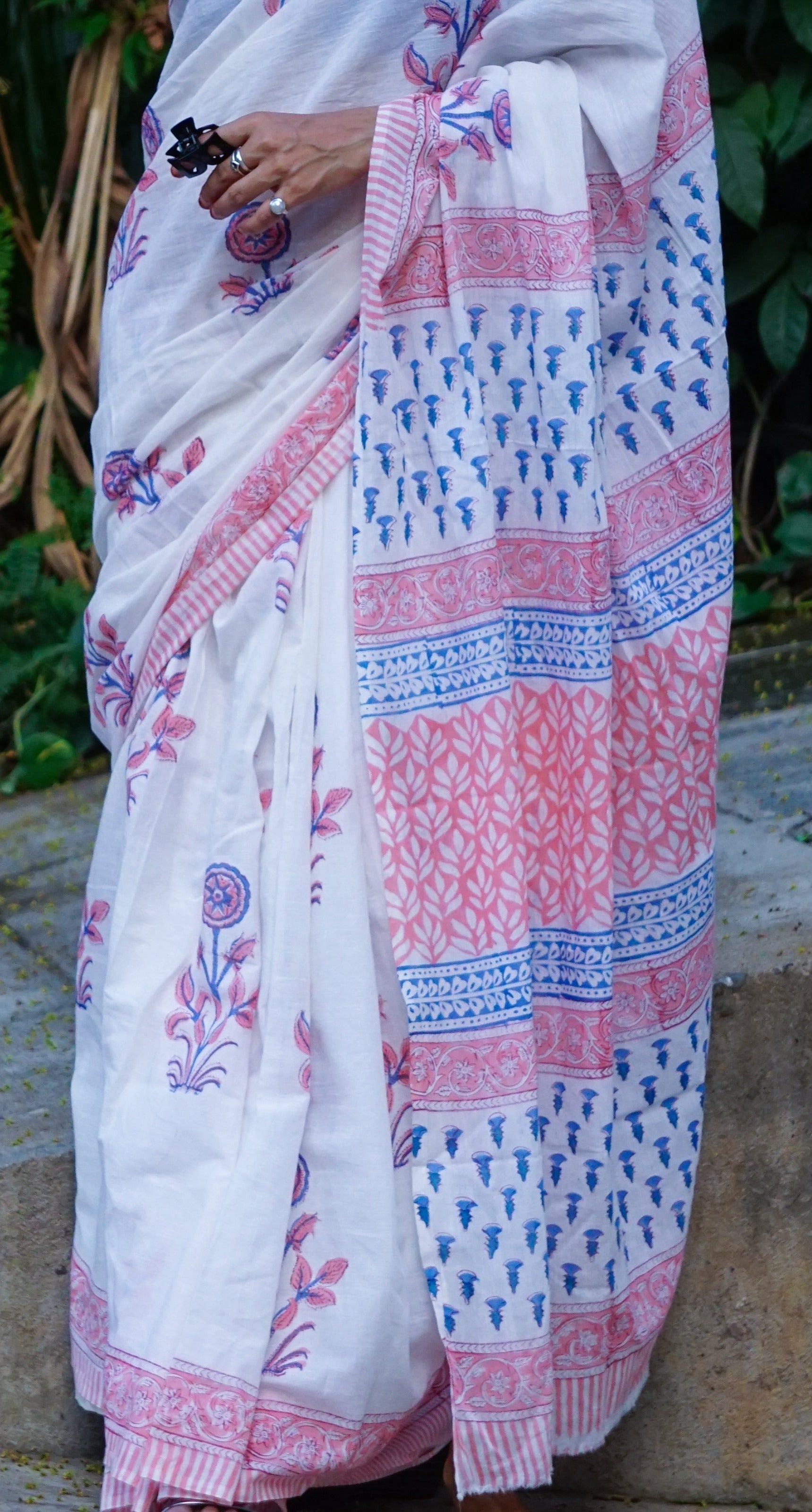 Summer Breeze - Handblock Print Natural Dyed - White Mulmul Cotton Saree