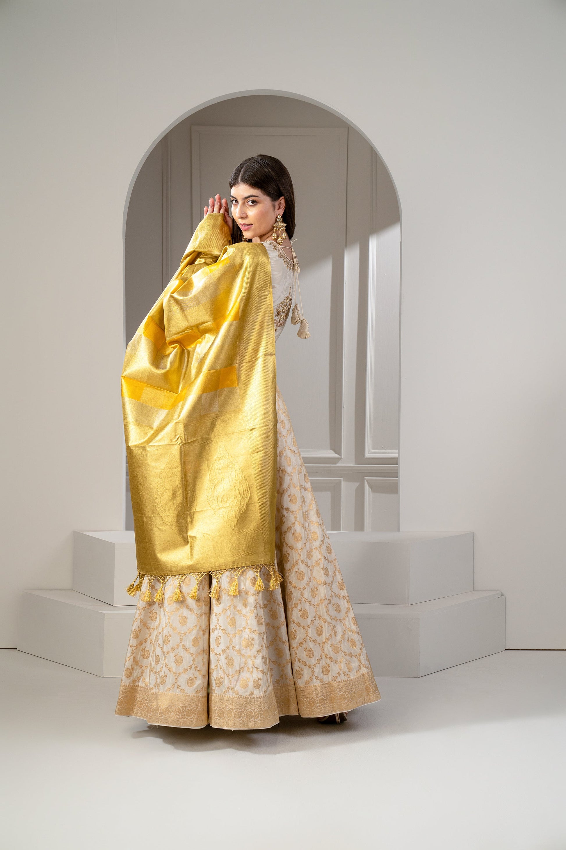 Sunglow Golden and Beige Banarasi Silk lehenga. 2) Topped with a matching golden banarsi silk dupatta with tassles. 3) Paired with a matching padded zari embroidered choli.