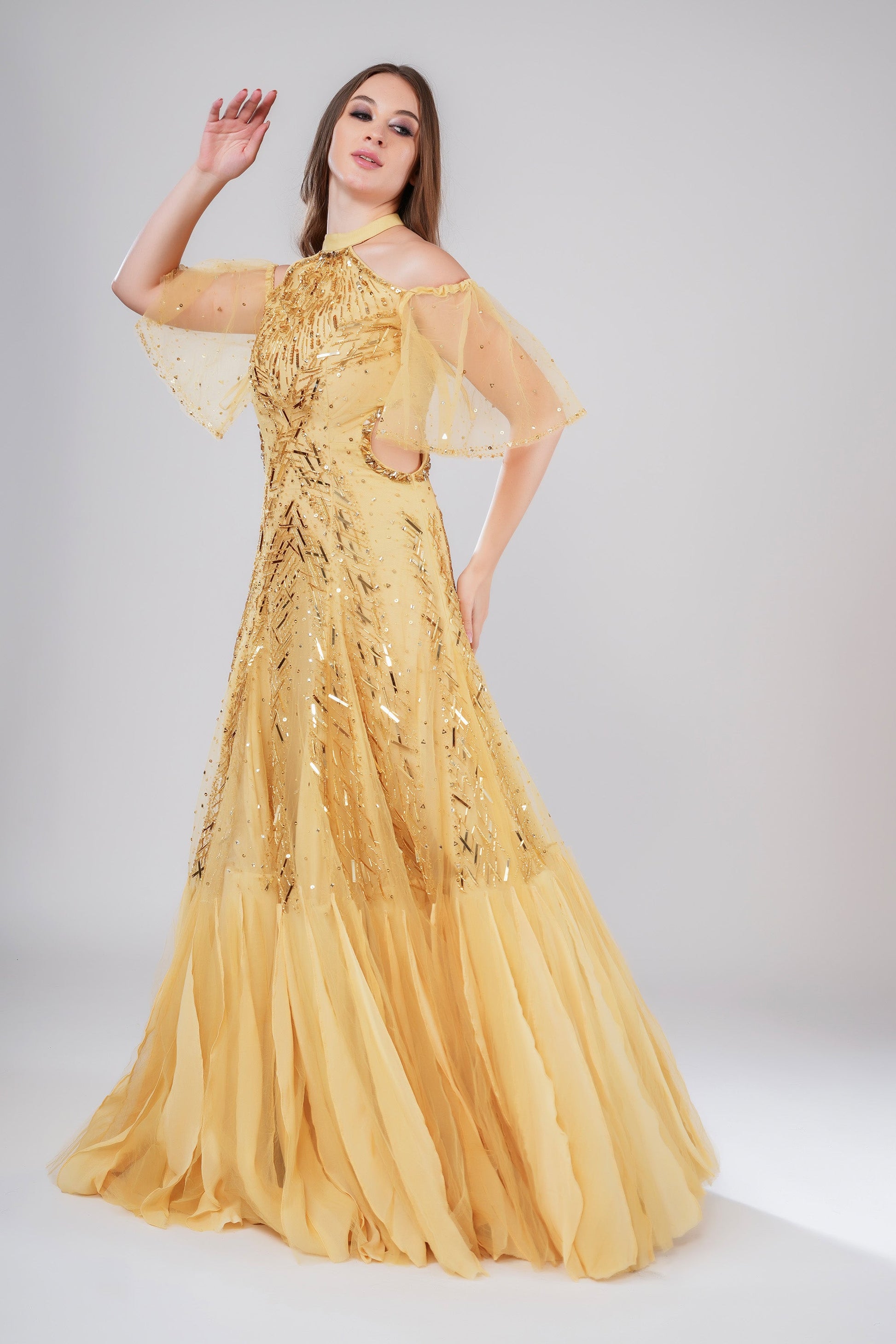 A golden gown featuring a high neckline, cold shoulder, waist cutouts, and pleated sleeves. The rich golden yellow fabric is adorned with glistening beads and shimmering sequins while the fitted bodice and flowing, pleated skirt create an ethereal silhouette.