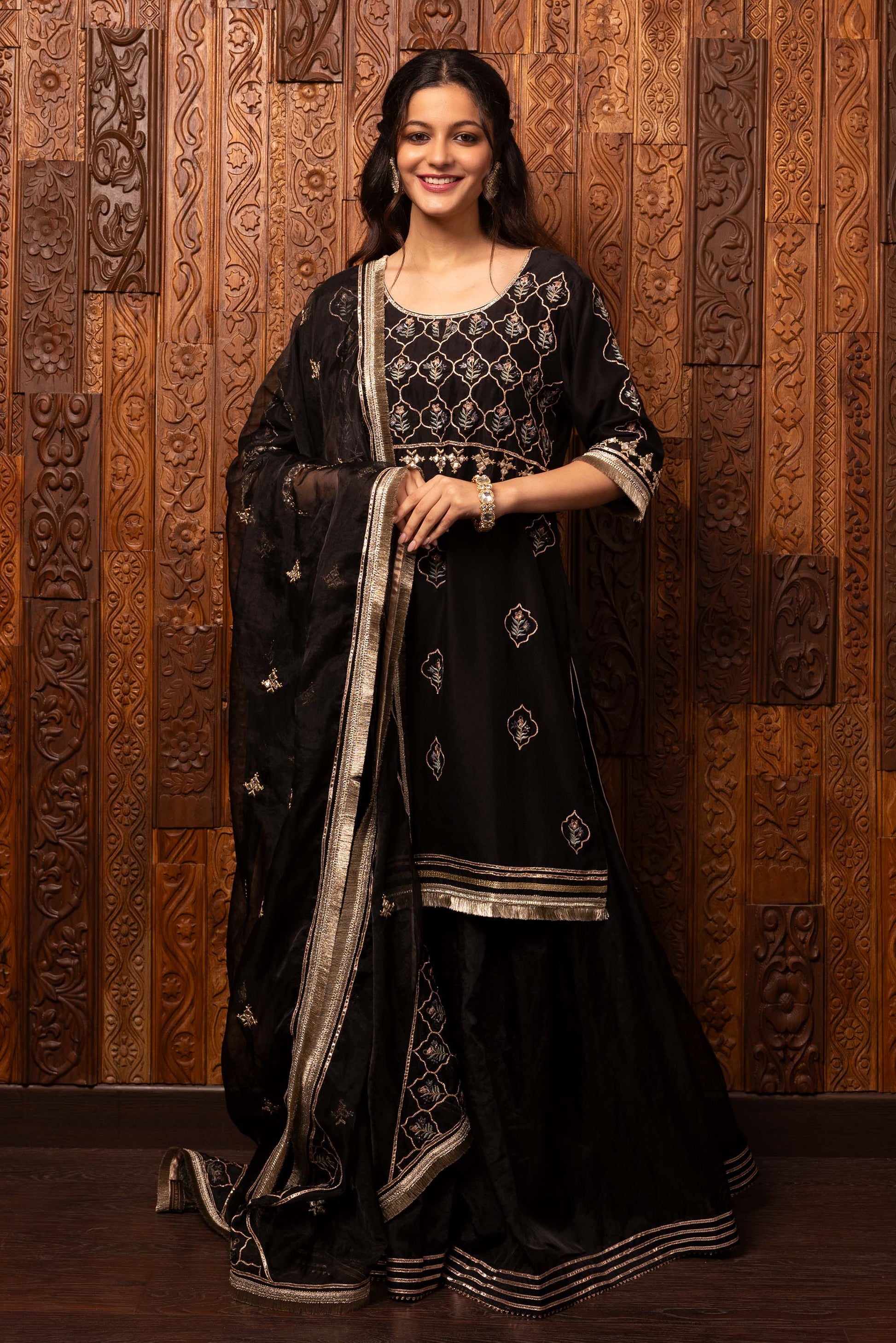 Featuring Black silk chanderi embroidered kurta with organga sharara pant and embroidered organza dupatta