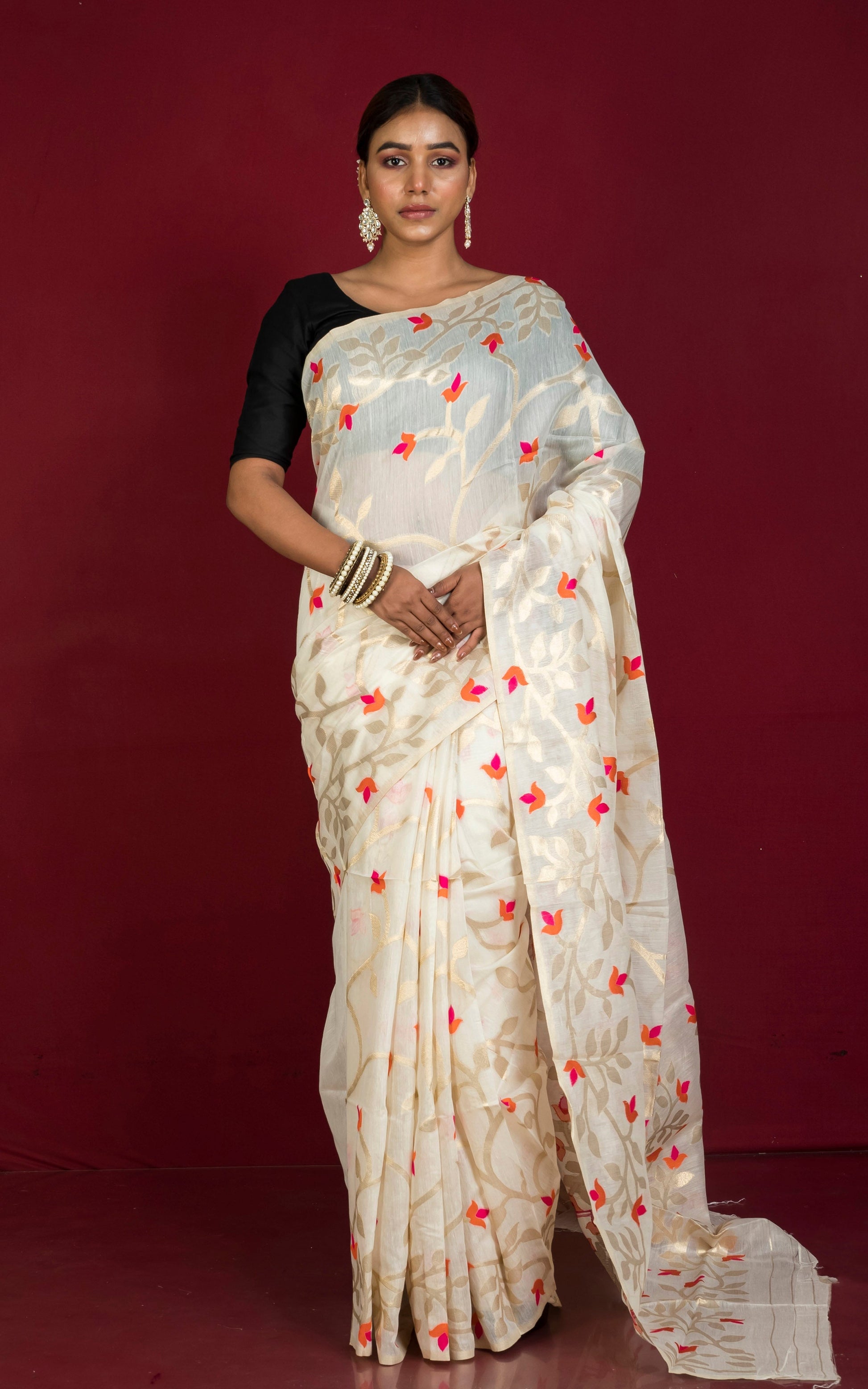 Tantuja Inspired Traditional Soft Jamdani Saree in Light Beige, Orange, Hot Pink and Brush Golden Zari Weave