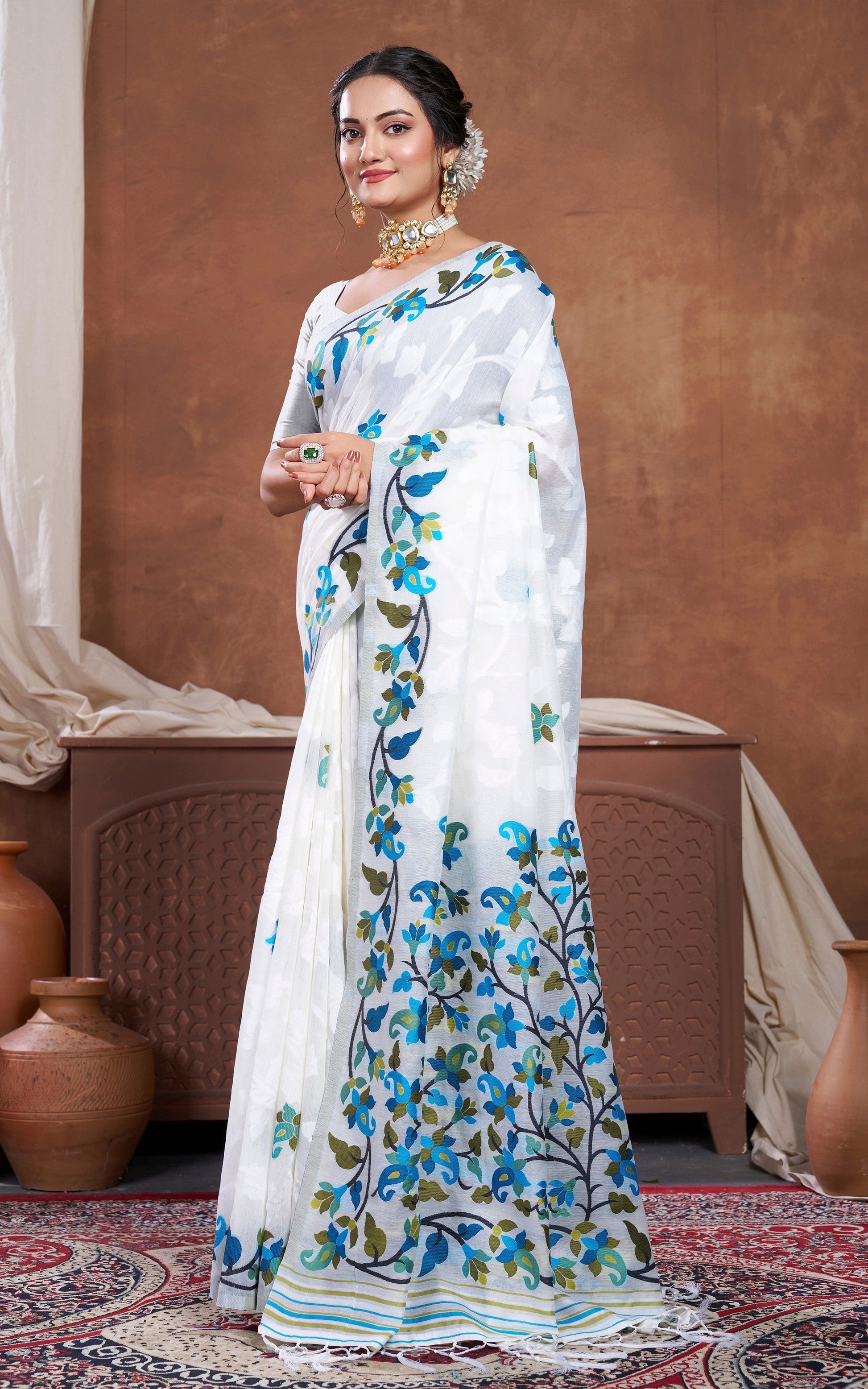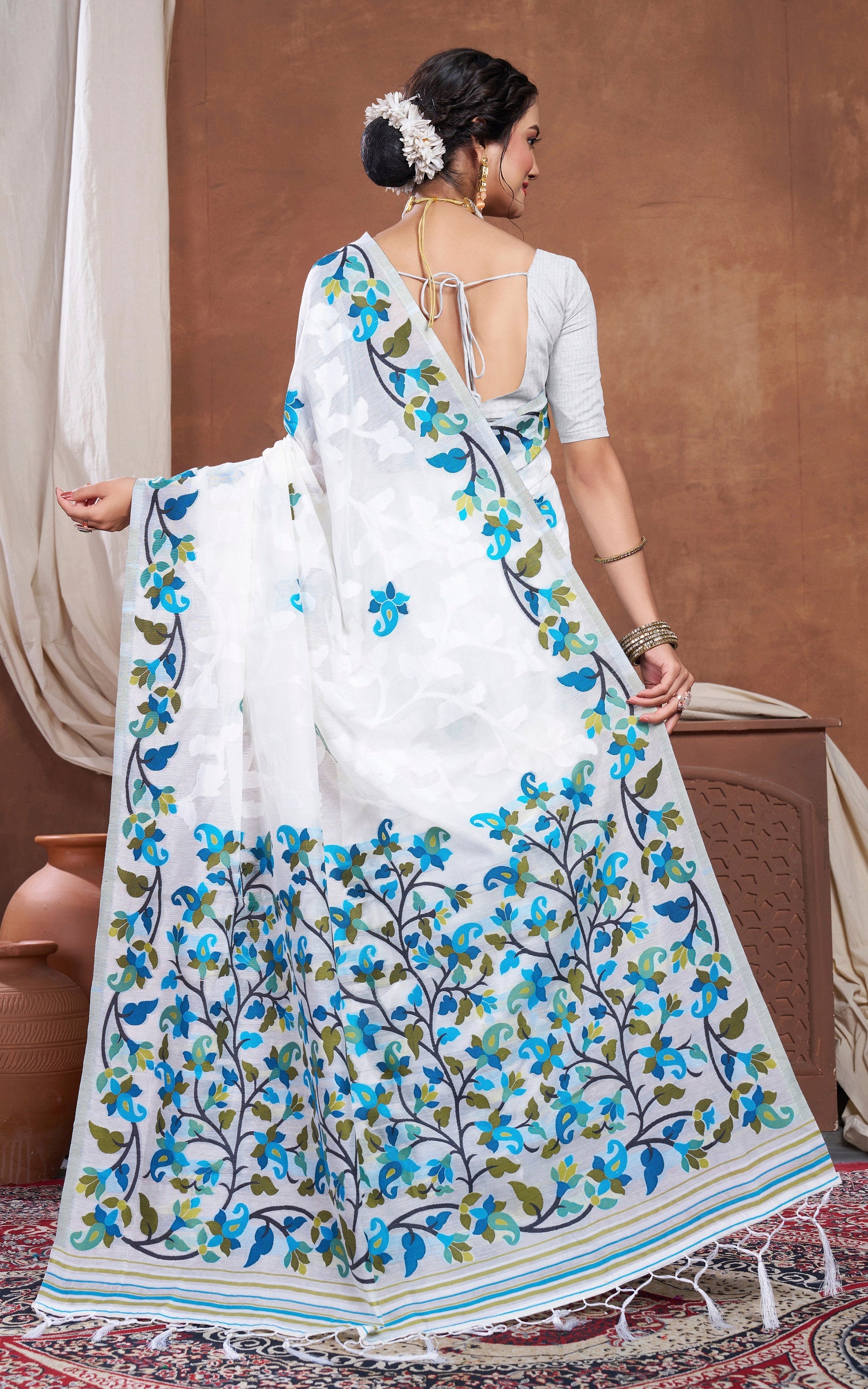 Tantuja Inspired Traditional Woven Floral Nakshi Soft Jamdani Saree in White, Blue, Green and Multicolored