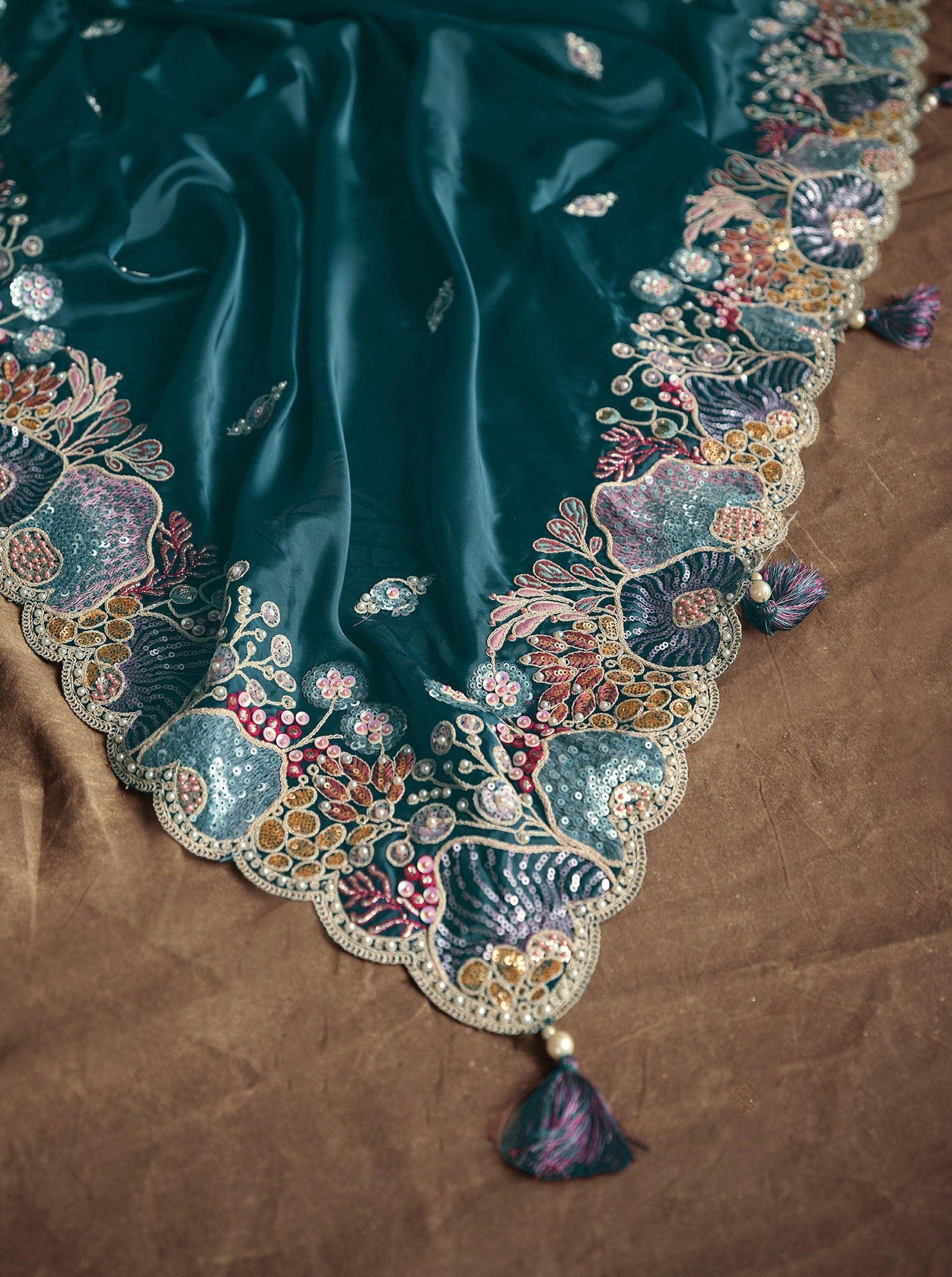 Teal Blue Crush Satin Silk Hand and Pearl work Party Wear Saree