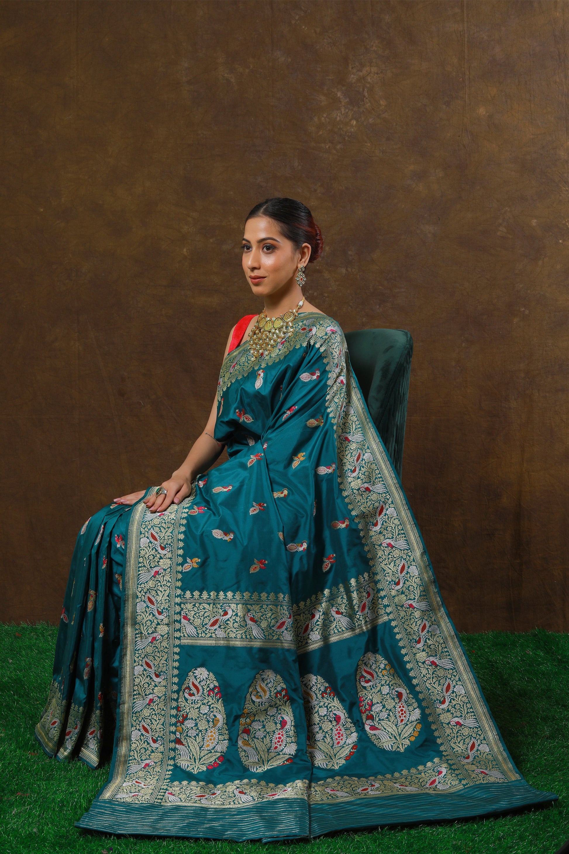 Product Description: The Teal Handwoven Kadwa Katan Silk Saree showcases a magnificent peacock motif in multi-color, complemented by a grand multi meena aachal in gold and silver zari. This saree is a tribute to the timeless traditions of Banaras, featuring the artistry of handloom Banarasi weaving. It stands as a symbol of elegant and sustainable fashion, perfect for those who hold a deep appreciation for the beauty of tradition.